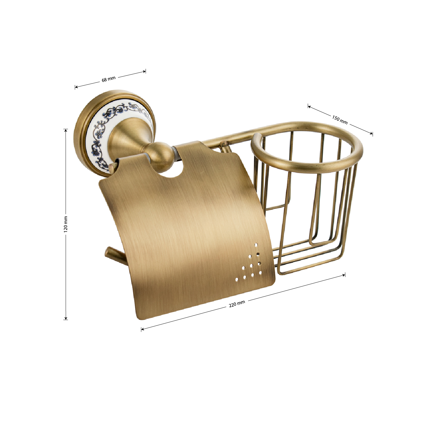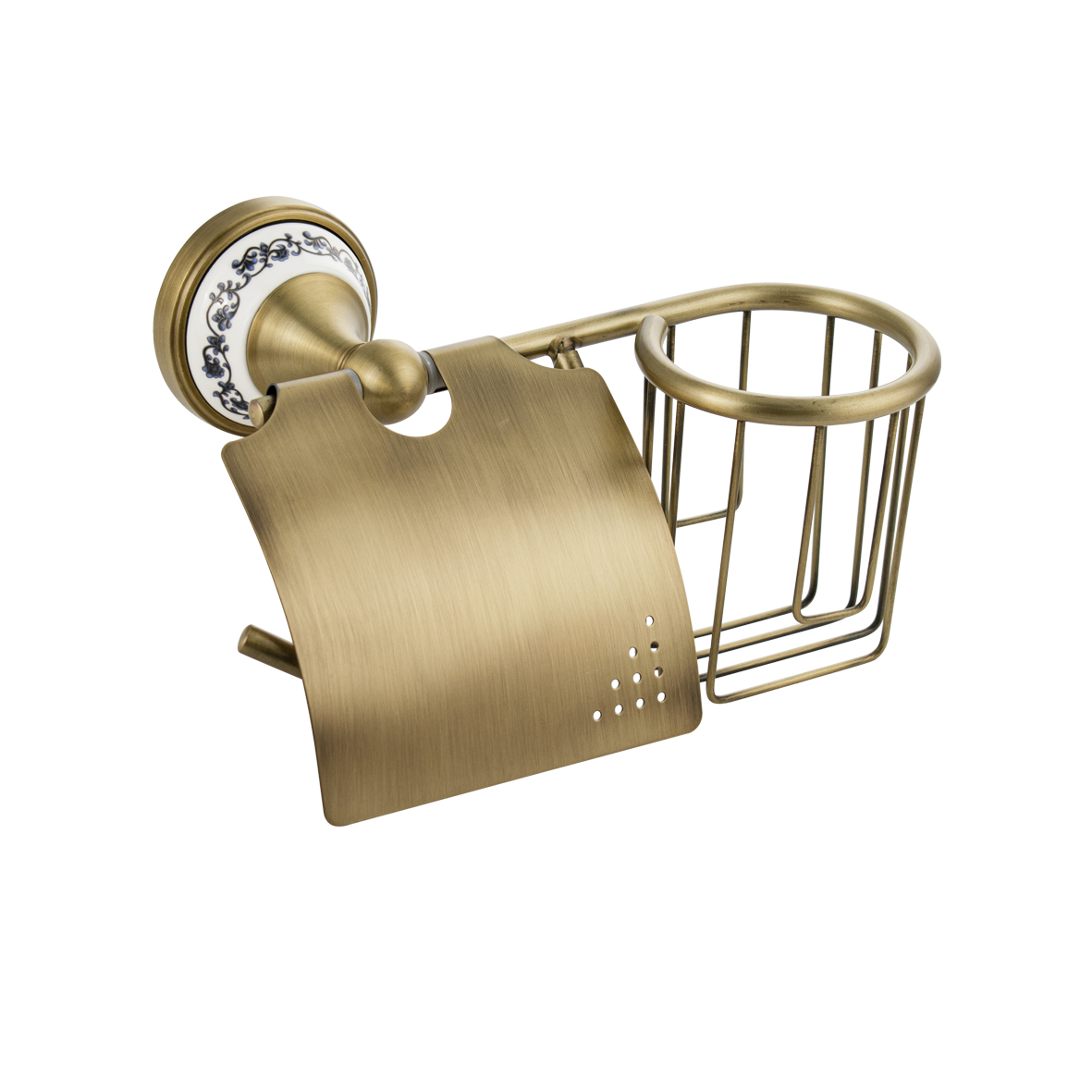 Держатель освежителя воздуха и туалетной бумаги с крышкой, металлический,с керамической вставкой с орнаментом, стильный и функциональный элемент санузла. Благодаря наличию крышки рулон будет защищен от попадания воды. Держатель легко и удобно крепится к стене при помощи фурнитуры входящей в комплект поставки. Материал изготовления — ЦАМ. Имеет специальное бронзовое, матовое покрытие, которое защищает изделие от влаги и придает ему безупречный стильный вид и долговечность. Удобно чистить и легко менять рулоны и аэрозоли. Габаритные размеры: ширина 220 мм, высота 120 мм, основание 68 мм. Вес - 0,73 кг, объём - 0,0055 м3