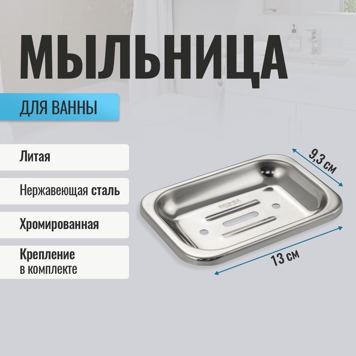 Мыльница подвесная, настенная, прямоугольной формы, литая, хромированная. Материал изготовления — нержавеющая сталь. Хромированное покрытие очень стойко переносит истирания и обеспечивает зеркальный блеск изделия. Литой каркас с прорезью не позволяет влаге скапливаться, поэтому мыло долгое время сохраняет свою форму. Идеально подойдет не только для ванной, но и для кухни. Изделие крепится к стене с помощью дюбелей и саморезов (входят в комплект). Габаритные размеры: ширина 130 мм, глубина 93 мм, высота 25 мм. Вес - 0,200 кг, объём - 0,00050 м3.