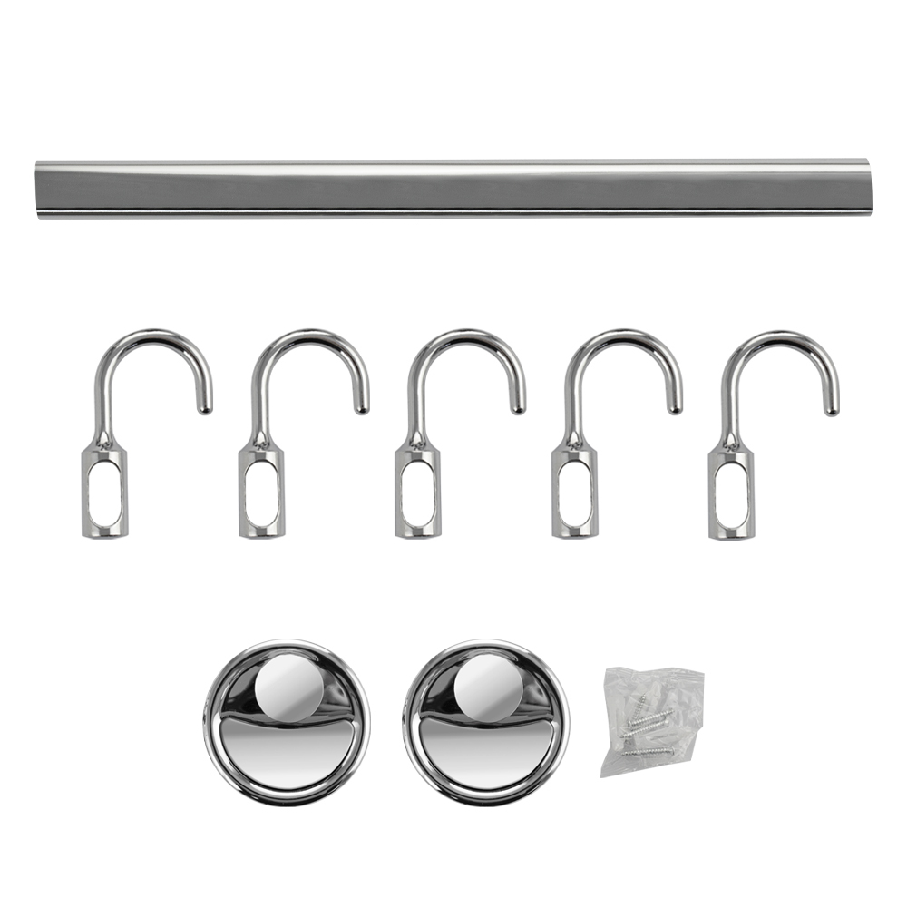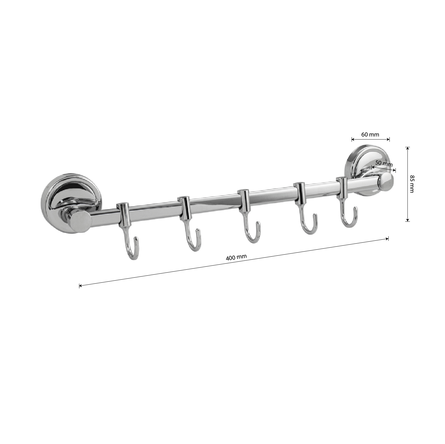 Держатель для полотенец металлический, хромированный, с пятью подвижными крючками. Материал изготовления — ЦАМ (цинк-алюминий-медь). Хромированное покрытие очень стойко переносит истирания и обеспечивает зеркальный блеск изделия. На держателе с легкостью можно размещать вещи для сушки или вешать, как полотенца, так и одежду перед походом в душ. Идеально подойдет не только для ванной, но и для кухни, а также для дачи или гаража - при необходимости на держатель можно вешать любые предметы. Изделие крепится к стене с помощью дюбелей и саморезов (входят в комплект). Габаритные размеры: длина 400 мм, высота 85 мм, глубина 50 мм, основание 60 мм. Вес - 0,400 кг, объём - 0,00096 м3.