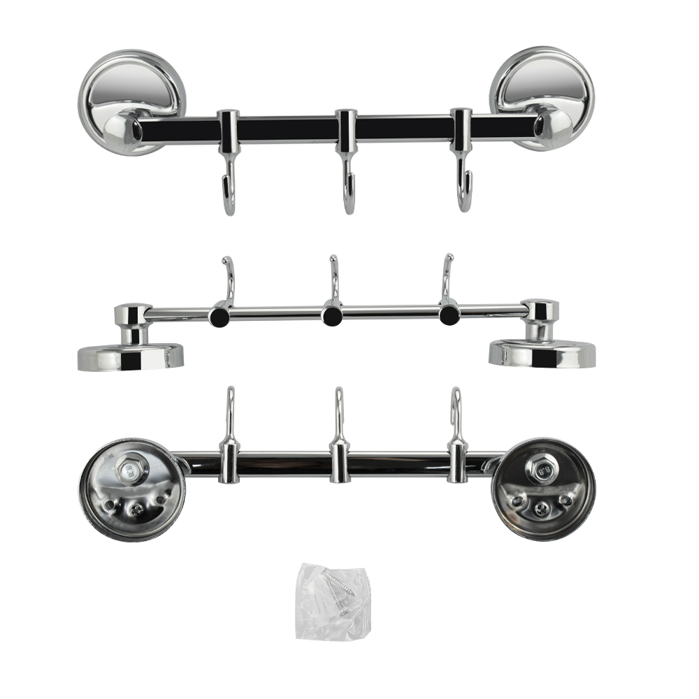 Держатель для полотенец металлический, хромированный, с тремя подвижными крючками. Материал изготовления — ЦАМ (цинк-алюминий-медь). Хромированное покрытие очень стойко переносит истирания и обеспечивает зеркальный блеск изделия. На держателе с легкостью можно размещать вещи для сушки или вешать, как полотенца, так и одежду перед походом в душ. Идеально подойдет не только для ванной, но и для кухни, а также для дачи или гаража - при необходимости на держатель можно вешать любые предметы. Изделие крепится к стене с помощью дюбелей и саморезов (входят в комплект). Габаритные размеры: длина 260 мм, диаметр посадочного седла 60 мм, глубина 50 мм, высота 85 мм. Вес - 0,300 кг, объём - 0,00076 м3