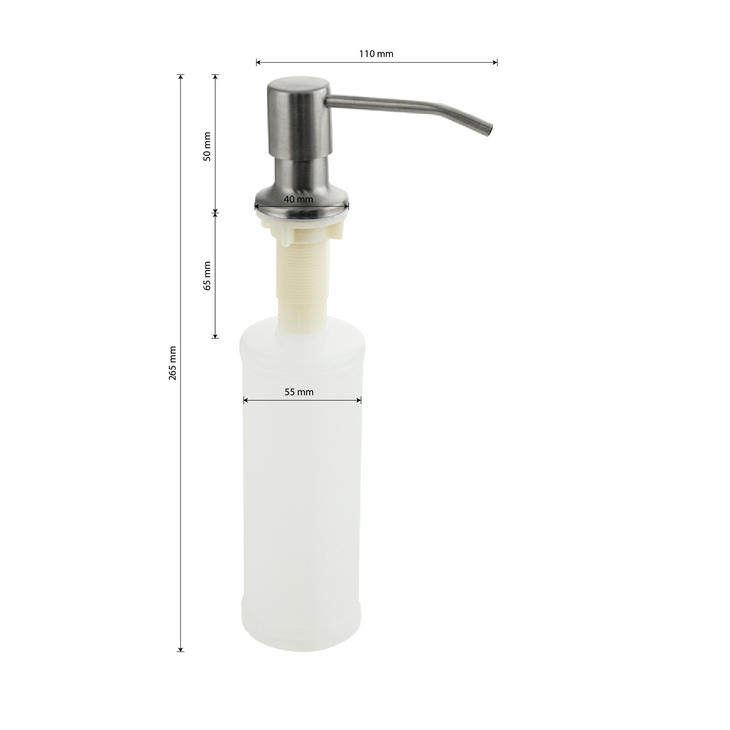 Дозатор для жидкого мыла и моющих средств, матовый хром, врезной, можно установить на кухонную мойку, если в ней предусмотрено место под встраиваемый дозатор, или на столешницу в любом удобном месте. Антивандальный корпус дозатора изготовлен из высокопрочного ABS-пластика и нержавеющей стали Требуемое отверстие для установки встраиваемого дозатора не менее 25 мм. Это очень удобный и полезный аксессуар на кухне. Наполнять его жидким моющим средством несложно, нужно просто снять верхнюю часть дозатора и залить требуемое количество жидкого мыла в колбу, емкостью 300 мл. Последовательно нажимая на верхнюю часть дозатора, Вы получаете требуемое количество моющего средства. Габаритные размеры: высота 265 мм, ширина 110 мм, диаметр посадочного седла 40 мм, длины резьбы 65 мм. Вес - 0,150 кг, объем - 0,00150 м3.