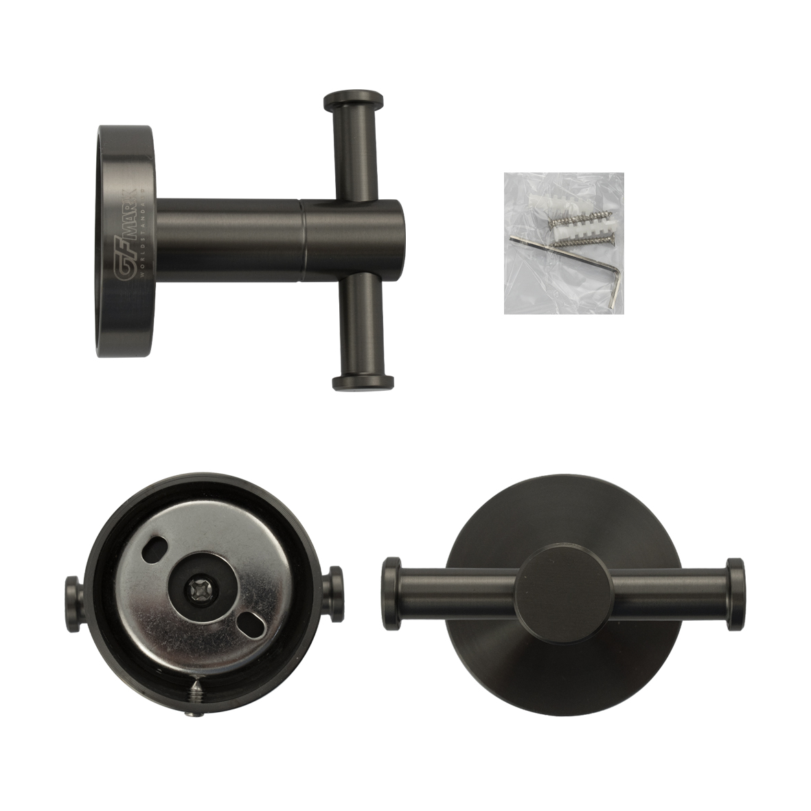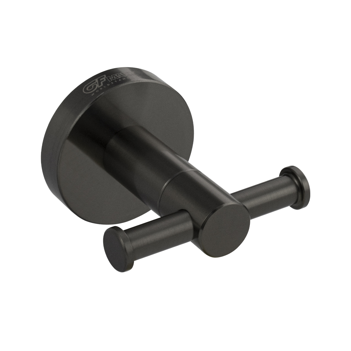 Крючок двойной для полотенец металлический. Материал изготовления — нержавеющая сталь. Имеет специальное матовое покрытие цвета графит, которое защищает изделие от влаги и придает ему безупречный стильный вид и долговечность. На крючке с легкостью можно размещать вещи для сушки или вешать, как полотенца, так и одежду перед походом в душ. Идеально подойдет не только для ванной, но и для кухни, а также для дачи или гаража - при необходимости на держатель можно вешать любые предметы. Изделие крепится к стене с помощью дюбелей и саморезов (входят в комплект). Габаритные размеры: глубина 70 мм, диаметр посадочного седла 50 мм. Вес - 0,200 кг, объём - 0,00050 м3