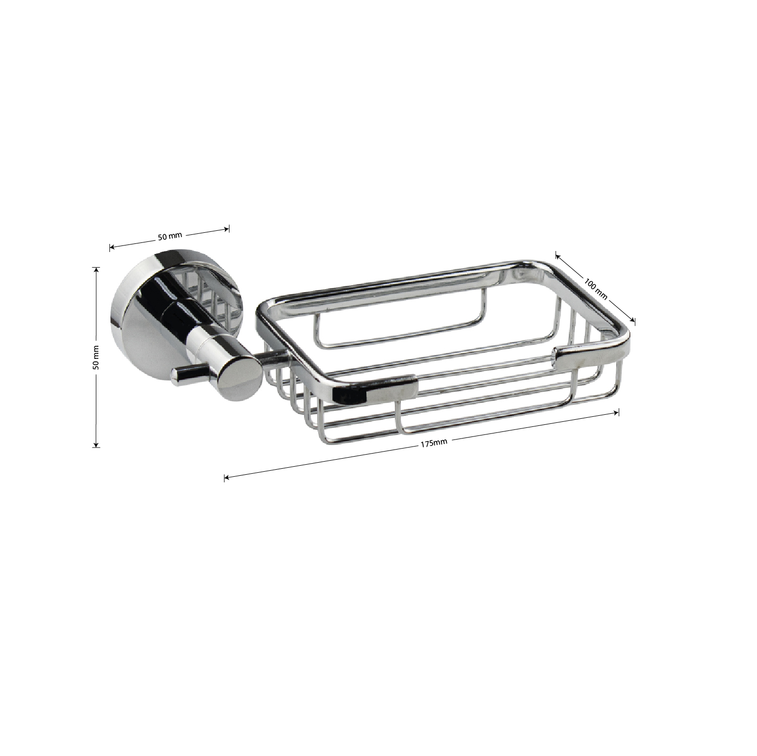 Мыльница подвесная, настенная, прямоугольной формы на основании, решетка, хромированная. Материал изготовления — ЦАМ (цинк-алюминий-медь) + нержавеющая сталь. Хромированное покрытие очень стойко переносит истирания и обеспечивает зеркальный блеск изделия. Сетчатый каркас не позволяет влаге скапливаться, поэтому мыло долгое время сохраняет свою форму. Идеально подойдет не только для ванной, но и для кухни. Изделие крепится к стене с помощью дюбелей и саморезов (входят в комплект). Габаритные размеры: ширина 175 мм, высота 50 мм, глубина 100 мм, диаметр посадочного седла 50 мм. Вес - 0,36 кг, объём - 0.00193 м3.