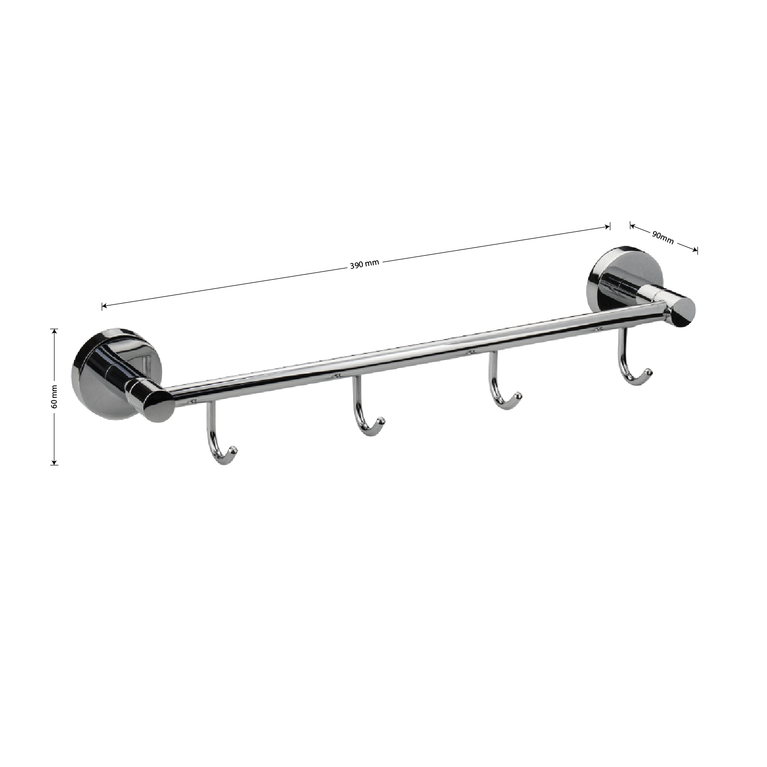 Держатель для полотенец металлический, хромированный, с четырьмя крючками. Материал изготовления — ЦАМ (цинк-алюминий-медь) + нержавеющая сталь. Хромированное покрытие очень стойко переносит истирания и обеспечивает зеркальный блеск изделия. На держателе с легкостью можно размещать вещи для сушки или вешать, как полотенца, так и одежду перед походом в душ. Идеально подойдет не только для ванной, но и для кухни, а также для дачи или гаража - при необходимости на держатель можно вешать любые предметы. Изделие крепится к стене с помощью дюбелей и саморезов (входят в комплект). Габаритные размеры: длина 390 мм, высота 60 мм, глубина 90 мм, диаметр посадочного седла 50 мм. Вес - 0.45 кг, объём - 0.00288 м3.