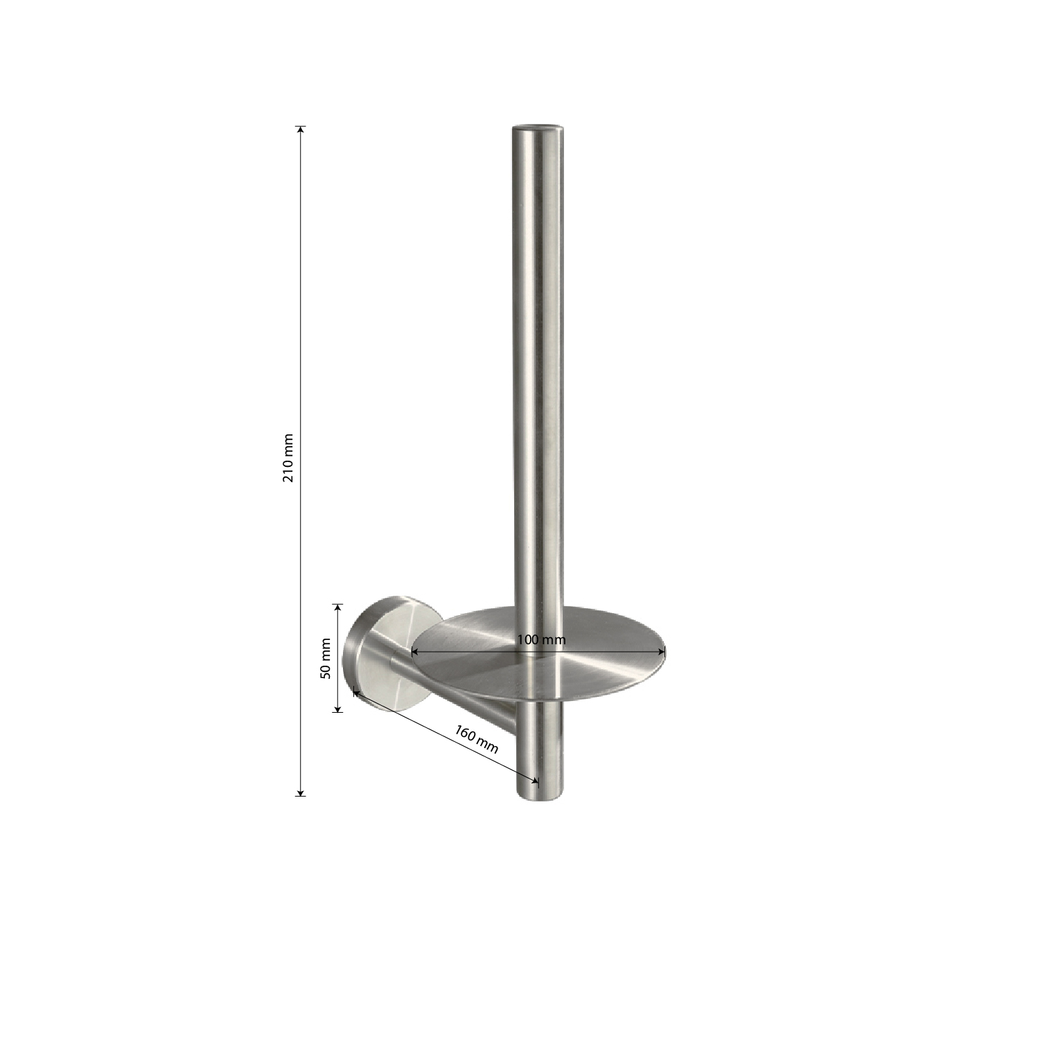 Держатель для туалетной бумаги, полотенца, вертикальный, металлический, стильный и функциональный элемент санузла. Держатель для туалетной бумаги легко и удобно крепится к стене при помощи фурнитуры входящей в комплект поставки. Изготовлен из прочной нержавеющей стали марки SUS 304 с матовым покрытием, которое придает безупречный стильный вид и долговечность. Удобно чистить и легко менять рулоны. Габаритные размеры: ширина 100 мм, высота 210 мм, глубина 160 мм, диаметр посадочного седла 50 мм, шток под бумагу 140 мм. Вес - 0,400 кг, объём - 0,00422 м3.