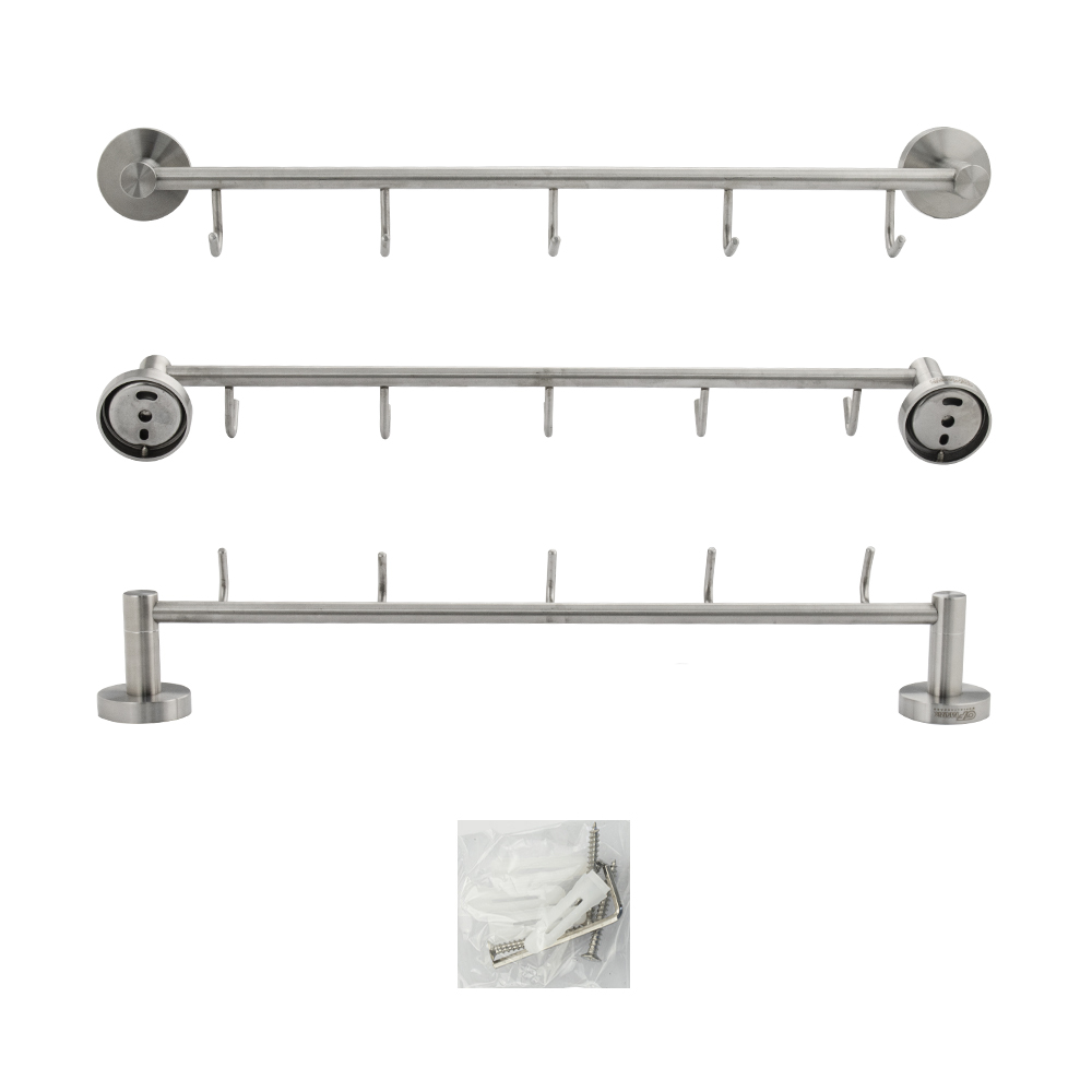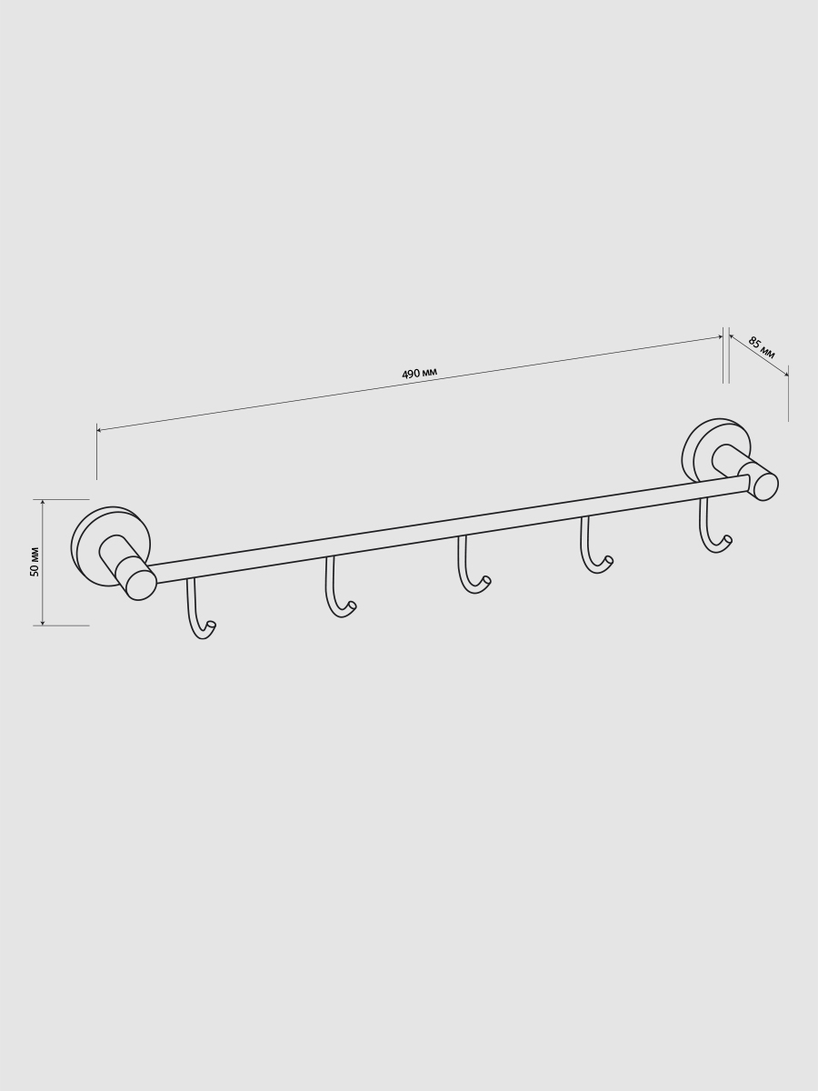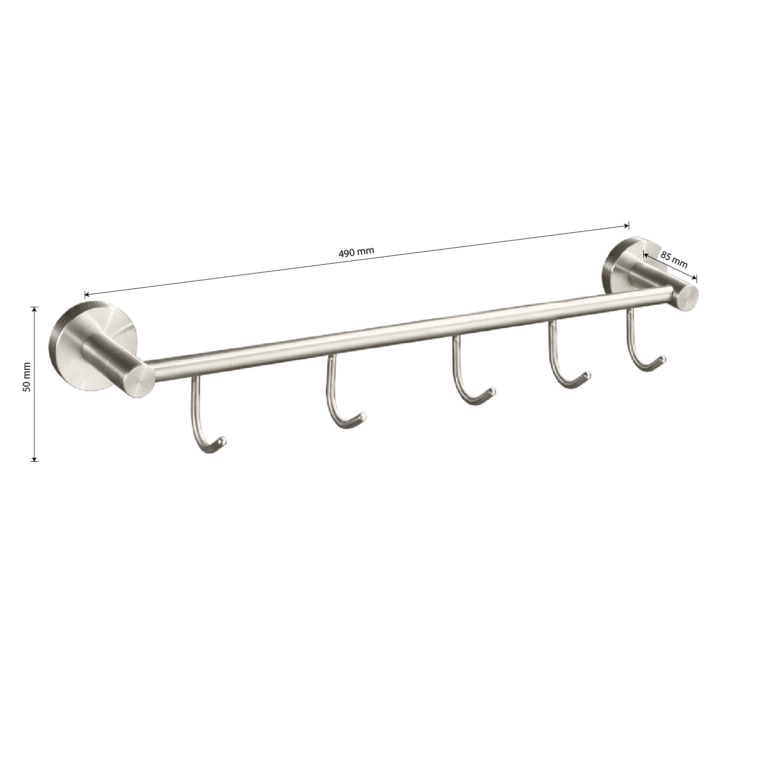 Держатель для полотенец металлический с пятью крючками. Изготовлен из прочной нержавеющей стали марки SUS 304 с матовым покрытием, которое придает безупречный стильный вид и долговечность. На держателе с легкостью можно размещать вещи для сушки или вешать, как полотенца, так и одежду перед походом в душ. Идеально подойдет не только для ванной, но и для кухни, а также для дачи или гаража - при необходимости на держатель можно вешать любые предметы. Изделие крепится к стене с помощью дюбелей и саморезов (входят в комплект). Размеры: длина 490 мм, высота 55 мм, глубина 85 мм. Вес - 0,500 кг, объём - 0,00336 м3.