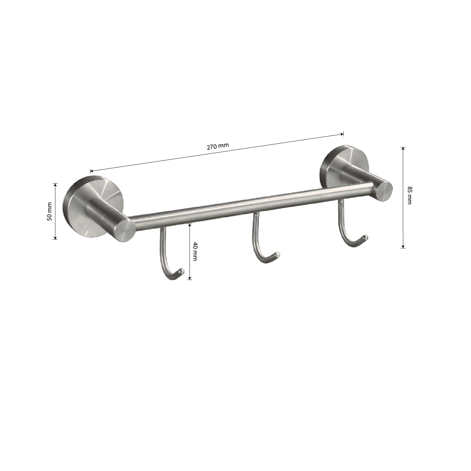Держатель для полотенец металлический с тремя крючками. Изготовлен из прочной нержавеющей стали марки SUS 304 с матовым покрытием, которое придает безупречный стильный вид и долговечность. На держателе с легкостью можно размещать вещи для сушки или вешать, как полотенца, так и одежду перед походом в душ. Идеально подойдет не только для ванной, но и для кухни, а также для дачи или гаража - при необходимости на держатель можно вешать любые предметы. Изделие крепится к стене с помощью дюбелей и саморезов (входят в комплект). Габаритные размеры: длина 270 мм, высота 85 мм, диаметр посадочного седла 50 мм, длина крючка 40 мм. Вес - 0,400 кг, объём - 0,00241 м3.