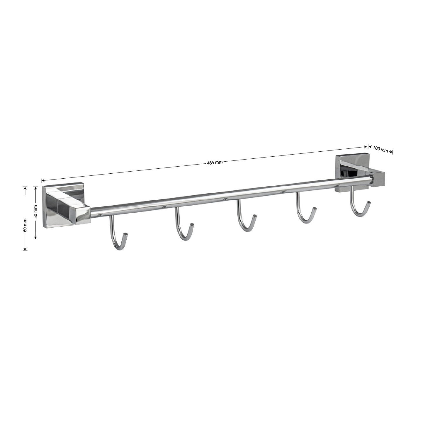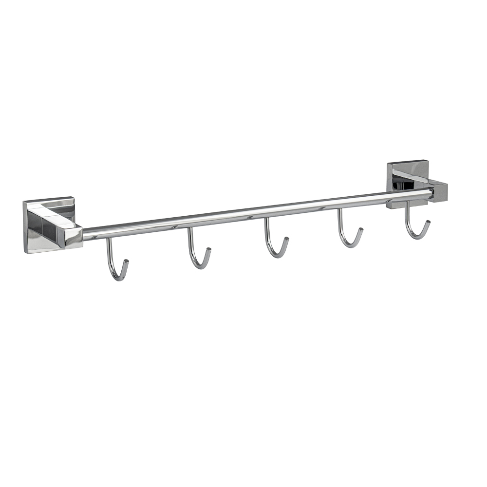 Держатель для полотенец металлический, хромированный с пятью крючками. Материал изготовления — ЦАМ (цинк-алюминий-медь) + нержавеющая сталь. Хромированное покрытие очень стойко переносит истирания и обеспечивает зеркальный блеск изделия. На держателе с легкостью можно размещать вещи для сушки или вешать, как полотенца, так и одежду перед походом в душ. Идеально подойдет не только для ванной, но и для кухни, а также для дачи или гаража - при необходимости на держатель можно вешать любые предметы. Изделие крепится к стене с помощью дюбелей и саморезов (входят в комплект). Габаритные размеры: длина 465 мм, глубина 100 мм, высота 60 мм. Вес - 0.55 кг, объём - 0.00445 м3.