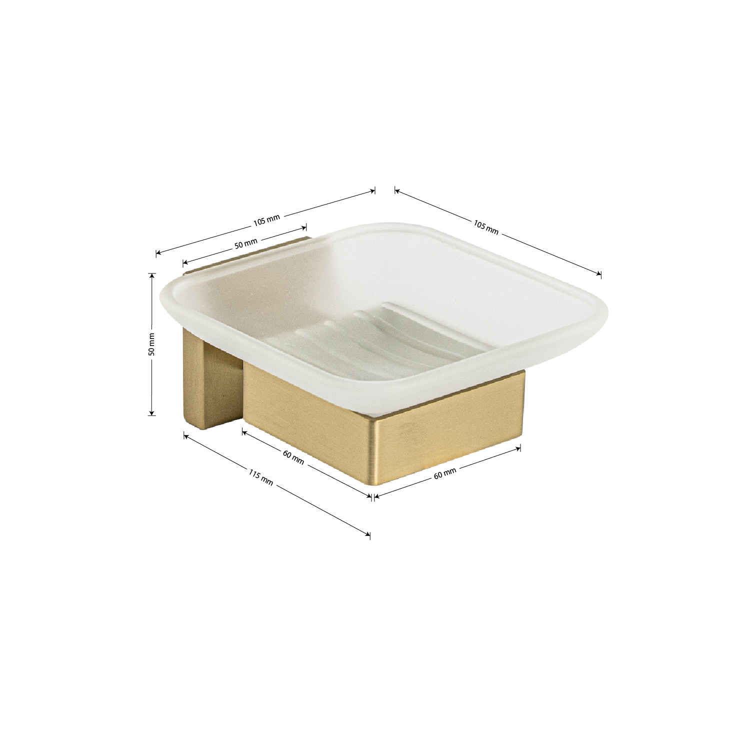 Мыльница подвесная, стеклянная с креплением к стене, квадратной формы на основании. Изделие выполнено из матового стекла и металла. Изготовлена из прочной нержавеющей стали марки SUS 304 с матовым золотым покрытием, которое придает безупречный стильный вид и долговечность. Идеально подойдет не только для ванной, но и для кухни. Изделие крепится к стене с помощью дюбелей и саморезов (входят в комплект). Габаритные размеры: высота мыльницы 50 мм, мыльница 105*105 мм, общая длина 115 мм, посадочное седло 50*50 мм. Вес - 0.5 кг, объём - 0.00144 м3.