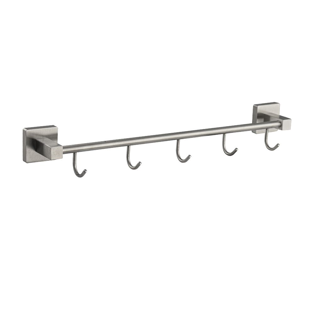 Держатель для полотенец металлический с пятью крючками. Изготовлен из прочной нержавеющей стали марки SUS 304 с матовым покрытием, которое придает безупречный стильный вид и долговечность. На держателе с легкостью можно размещать вещи для сушки или вешать, как полотенца, так и одежду перед походом в душ. Идеально подойдет не только для ванной, но и для кухни, а также для дачи или гаража - при необходимости на держатель можно вешать любые предметы. Изделие крепится к стене с помощью дюбелей и саморезов (входят в комплект). Размеры: длина мм, высота мм, глубина мм. Вес - кг, объём - м3.