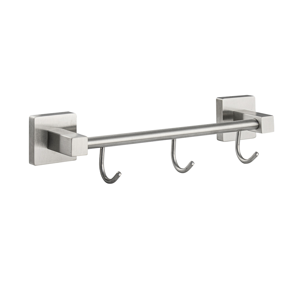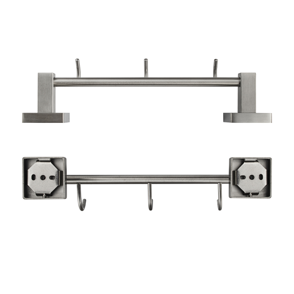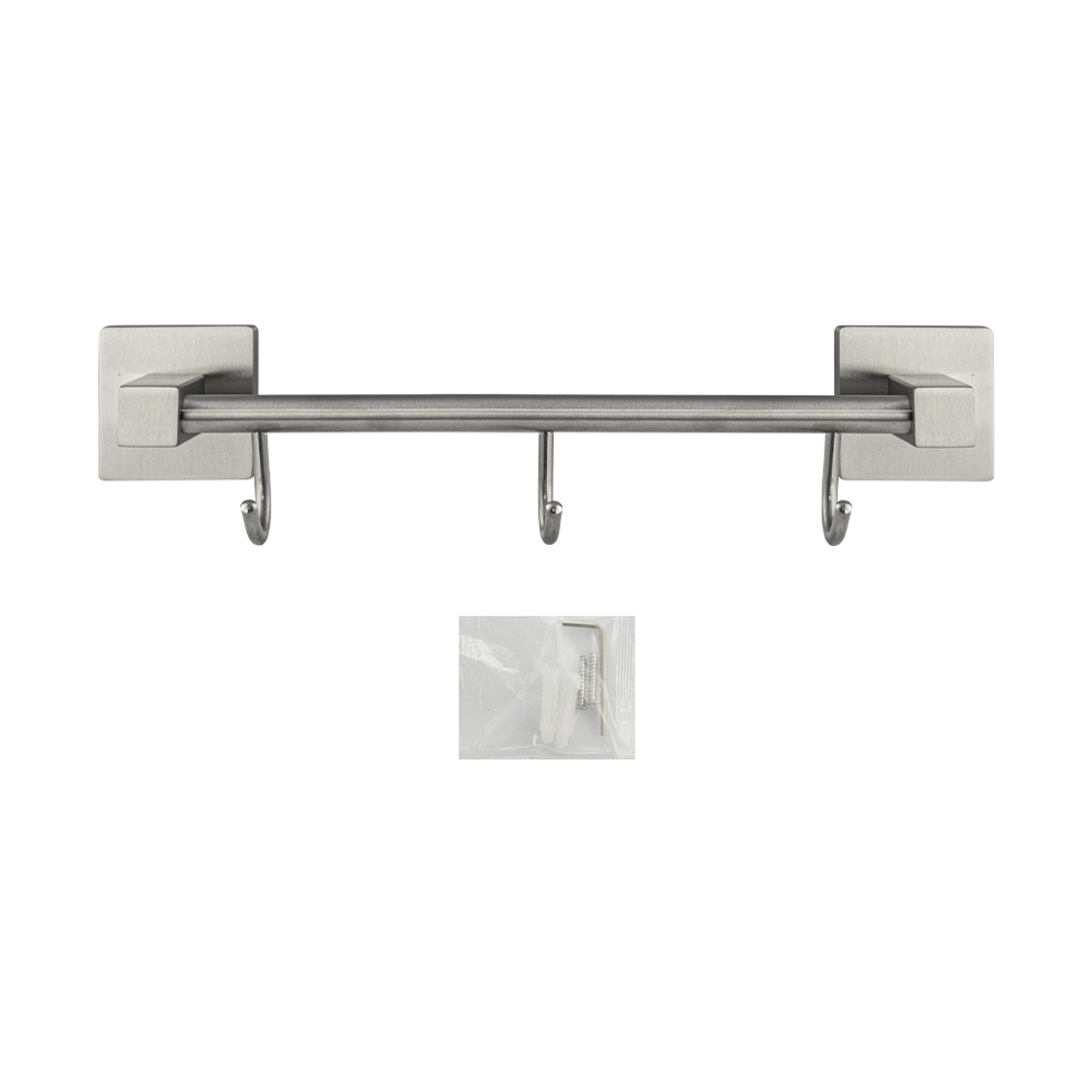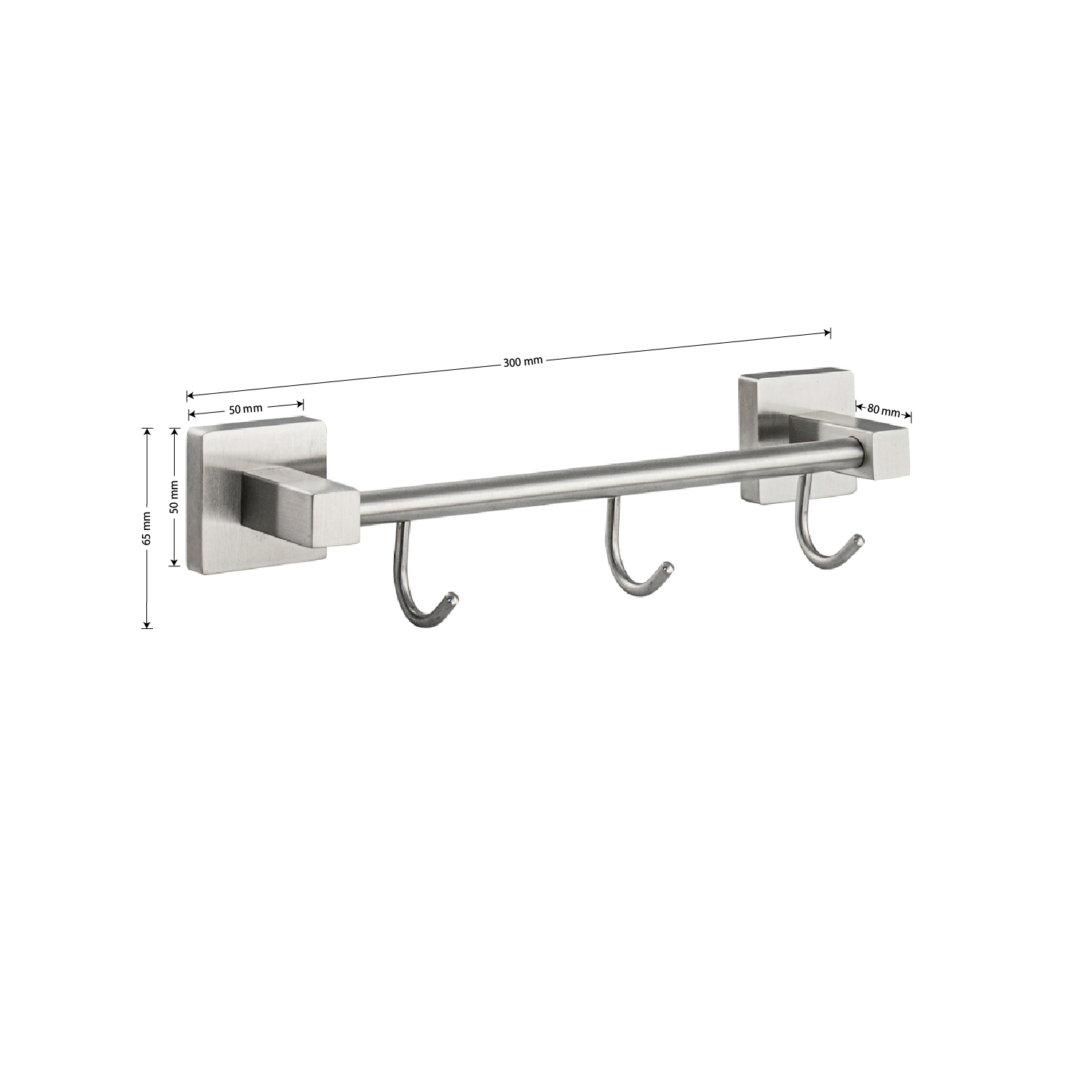 Держатель для полотенец металлический с тремя крючками. Изготовлен из прочной нержавеющей стали марки SUS 304 с матовым покрытием, которое придает безупречный стильный вид и долговечность. На держателе с легкостью можно размещать вещи для сушки или вешать, как полотенца, так и одежду перед походом в душ. Идеально подойдет не только для ванной, но и для кухни, а также для дачи или гаража - при необходимости на держатель можно вешать любые предметы. Изделие крепится к стене с помощью дюбелей и саморезов (входят в комплект). Габаритные размеры: длина 300 мм, высота 65 мм, посадочное седло 50*50 мм, глубина 80 мм. Вес - 0.5 кг, объём - 0.00217 м3.