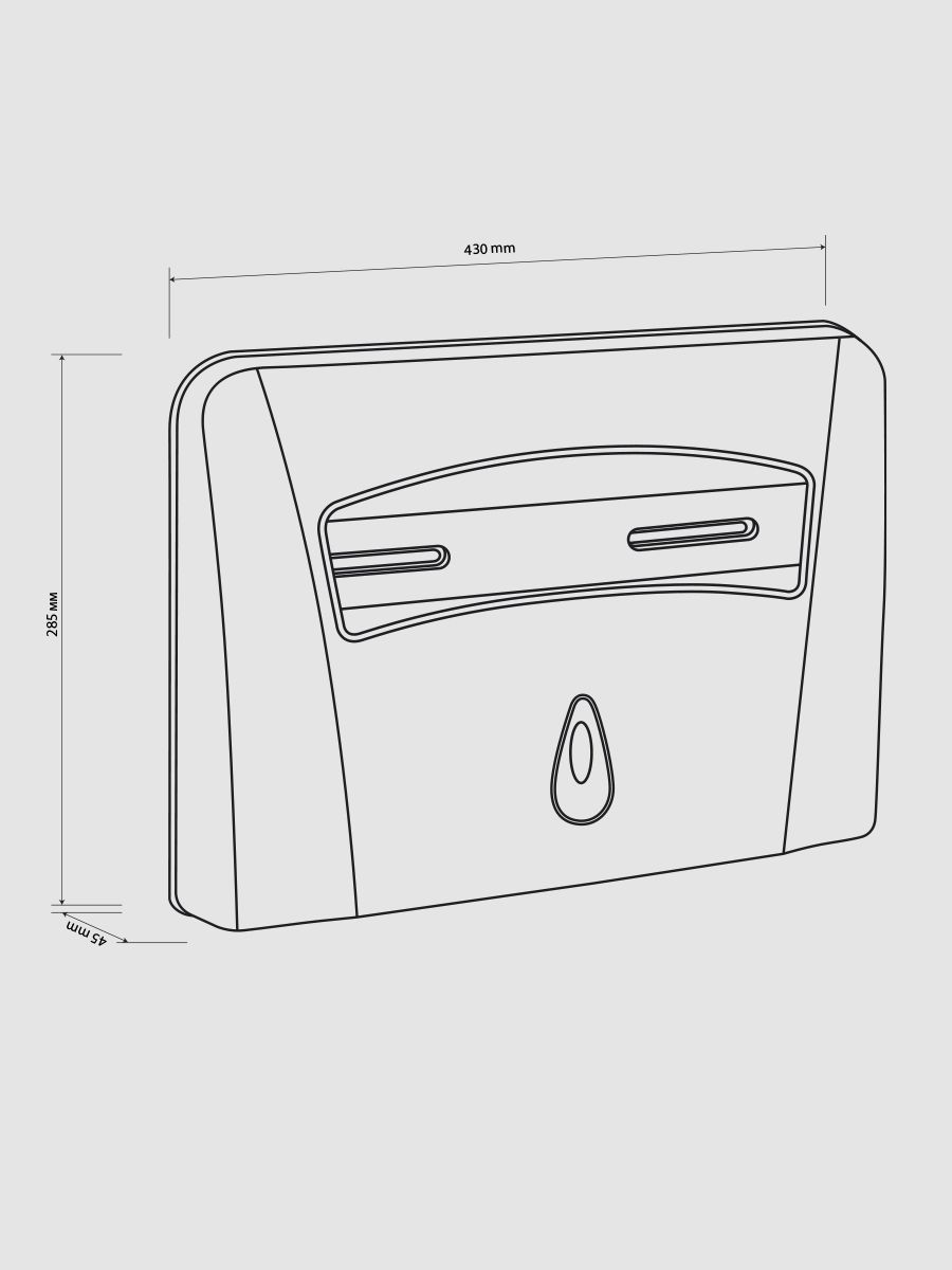 Контейнер для одноразовых сидений на крышку унитаза, пластиковый, белый, с глазком. Предназначен для удобной подачи индивидуальных бумажных покрытий на унитаз. Подходит для использования в туалетных комнатах офисов, торговых центров, аэропортов, вокзалов, ресторанов и т.д. Изготовлен из ударопрочного пластика АВS. Подходят любые накладки двойного сложения. Удобная конструкция диспенсера. Всегда извлекается только одно одноразовое сиденье на унитаз. Легкая смена блоков расходных материалов. Габаритные размеры: высота 285 мм, ширина 430 мм, глубина 45 мм. Вес - 0,700 кг, объем - 0,00925 м3.