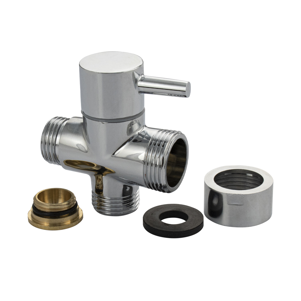 Переключатель душа латунный, поворотный, хромированный, к стойке тропический душ. Угол поворота 90°. Применяется для перенаправления потока воды с излива в душевой кран и обратно. Входная резьба 3/4, выходная резьба 1/2, выход на лейку 1/2. Габаритные размеры: высота 65 мм, диаметр 25 мм. Вес - 0,230 кг, объём - 0,00030 м2. Комплектация: дивертор, резиновая прокладка.