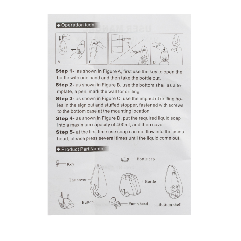 Механический дозатор для жидкого мыла предназначен для установки в любых санитарно-гигиенических комнатах. Имеет ключ и пластиковый замок. Дозатор прост в эксплуатации, достаточно нажать на кнопку для получения порции средства. Для удобства контроля за уровнем мыла на лицевой поверхности есть смотровое окно в виде капли. Корпус диспенсера изготовлен из прочного пластика АБС белого цвета, который выдерживает различные механические воздействия. В резервуар емкостью 400 мл можно заливать как жидкое мыло, так и прочие средства. Разместив диспенсер на стене, достаточно время от времени проверять заполненность резервуара. Иного ухода он не требует, не нуждается в замене батареек. Это отличное решение как для частных владений, так и для гостиниц, кафе, столовых и прочих общественных мест. Габаритные размеры: высота 190 мм, ширина 110 мм, глубина 90 мм. Вес - 0,300 кг, объем - 0,00308 м3.