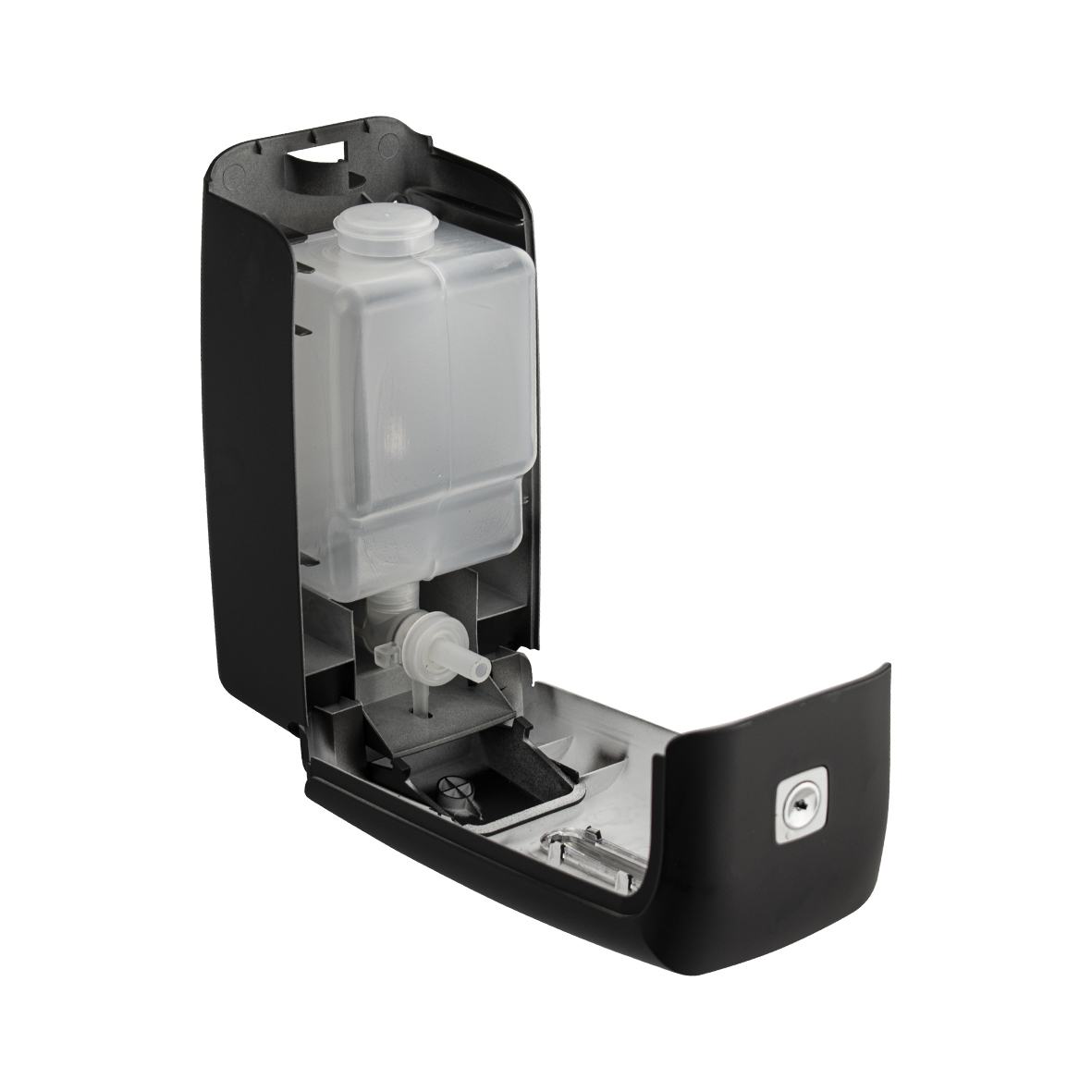Механический дозатор для жидкого мыла предназначен для установки в любых санитарно-гигиенических комнатах. Имеет ключ и пластиковый замок. Дозатор прост в эксплуатации, достаточно нажать на кнопку для получения порции средства. Для удобства контроля за уровнем мыла на лицевой поверхности есть смотровое окно в виде капли. Корпус диспенсера изготовлен из прочного пластика АБС черного цвета, который выдерживает различные механические воздействия. В резервуар емкостью 800 мл можно заливать как жидкое мыло, так и прочие средства. Разместив диспенсер на стене, достаточно время от времени проверять заполненность резервуара. Иного ухода он не требует, не нуждается в замене батареек. Это отличное решение как для частных владений, так и для гостиниц, кафе, столовых и прочих общественных мест. Габаритные размеры: высота 230 мм, ширина 115 мм, глубина 115 мм. Вес - 0,600 кг, объем - 0,0045 м3