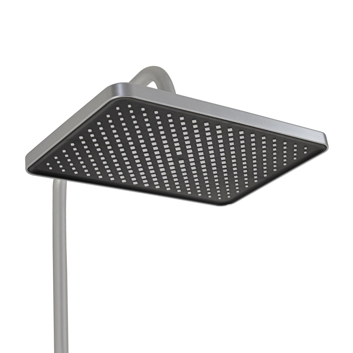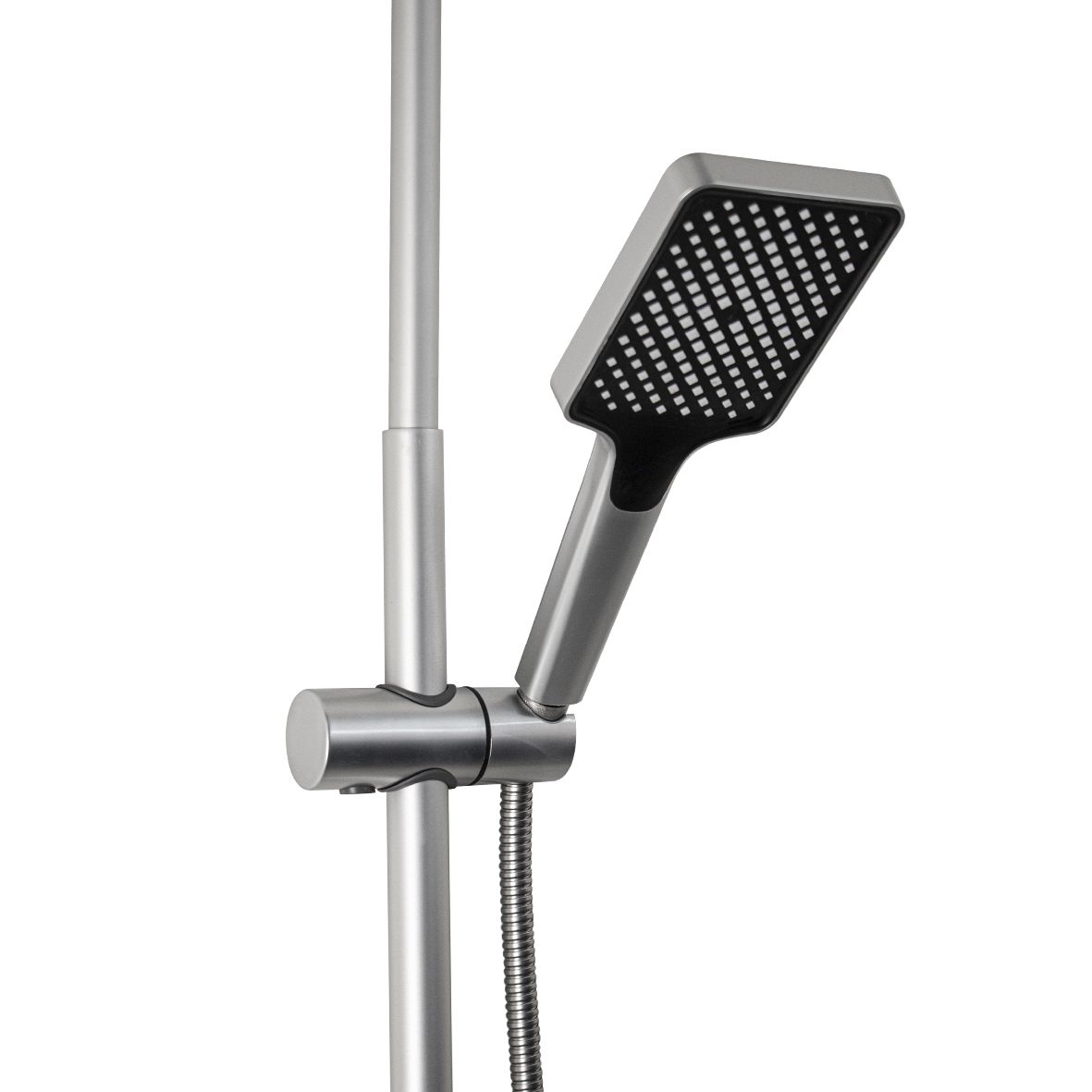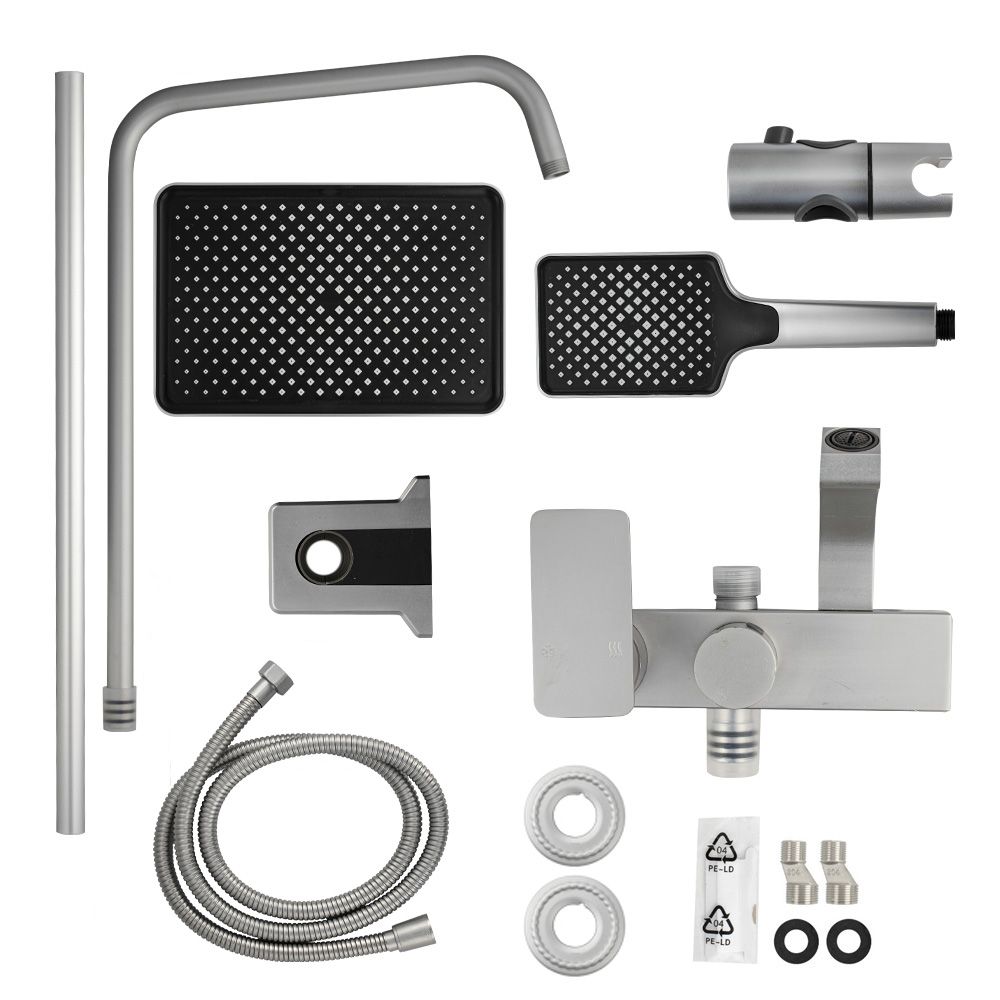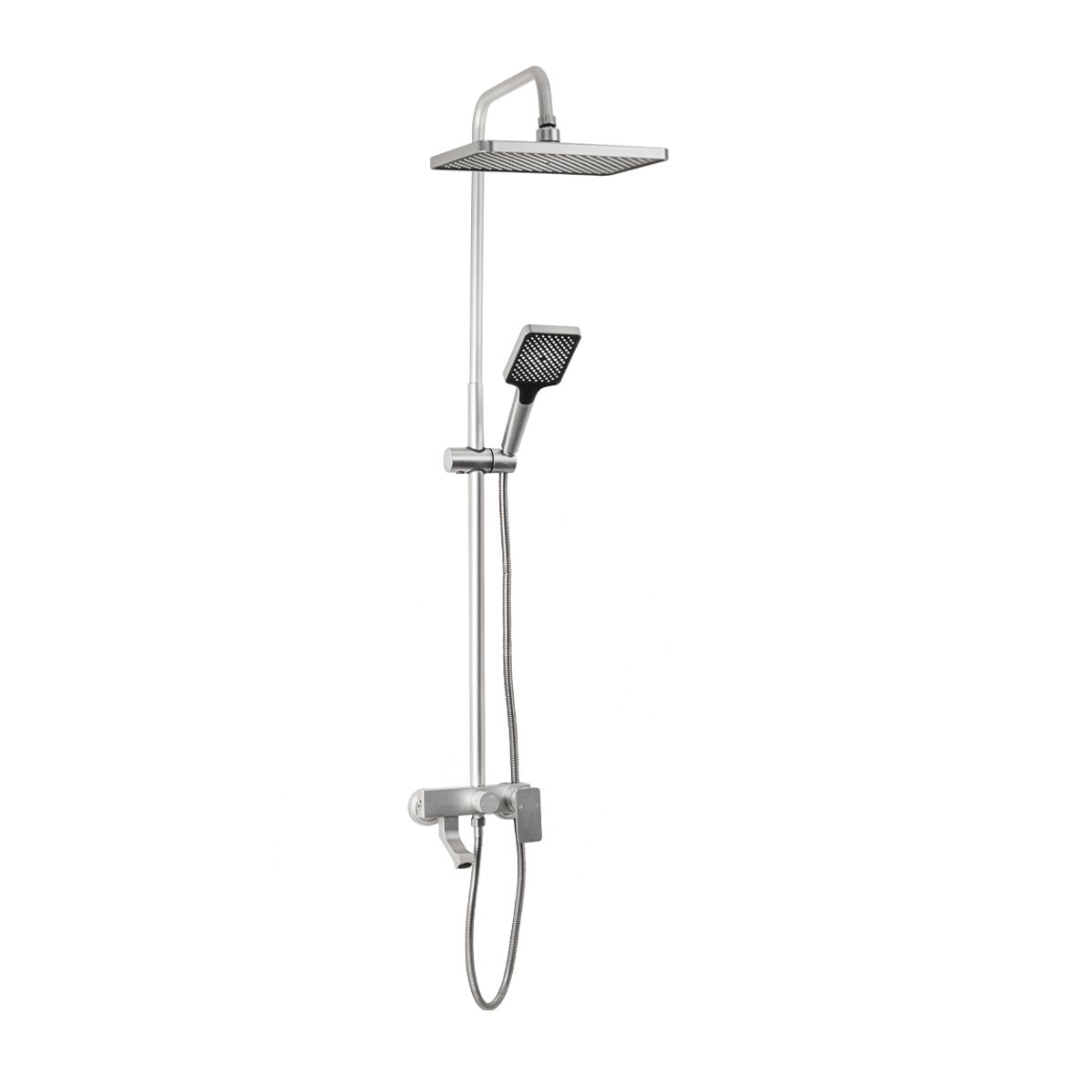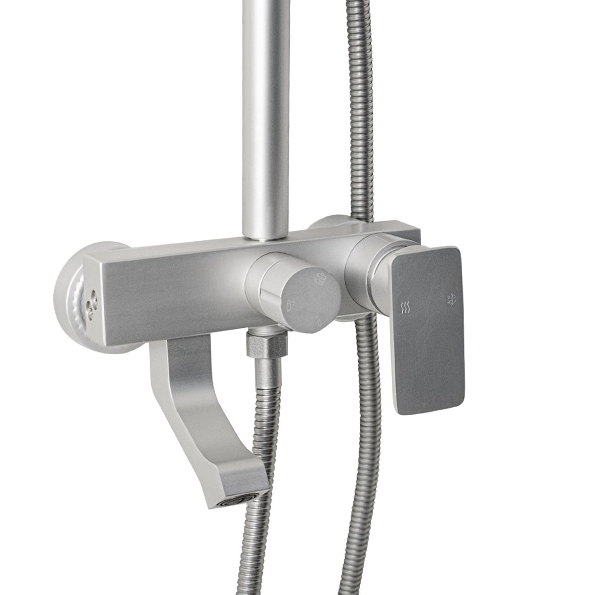 Смеситель + стойка душевая телескопическая "тропический душ" с двумя лейками в ванную / душевую комнату из алюминия. Смеситель шаровый c переключением режимов подачи воды на корпусе, с коротким поворотным изливом, душевым шлангом и лейкой. Картридж d = 40 мм, ручка литая, аэратор для экономии воды, чашки и эксцентрики душевая, регулируемая по высоте стойка с присоединением к корпусу смесителя и дополнительным креплением к стене и большой квадратной лейкой с эффектом тропического душа. Габаритные размеры: ширина смесителя 150 мм, высота 130 мм, длина излива корпуса 95 мм, высота телескопической стойки от 800 - 1100 мм, длина излива стойки 330 мм, душевая лейка 95 мм, лейка тропический душ 300*200 мм, шланг 150 см, высота смесителя 130 мм, глубина смесителя 95 мм. Вес - 3,4300 кг, объём - 0,03500 м3. В комплекте корпус с изливом, чашки, эксцентрики, прокладки, стойка, шланг, две лейки, крепления.