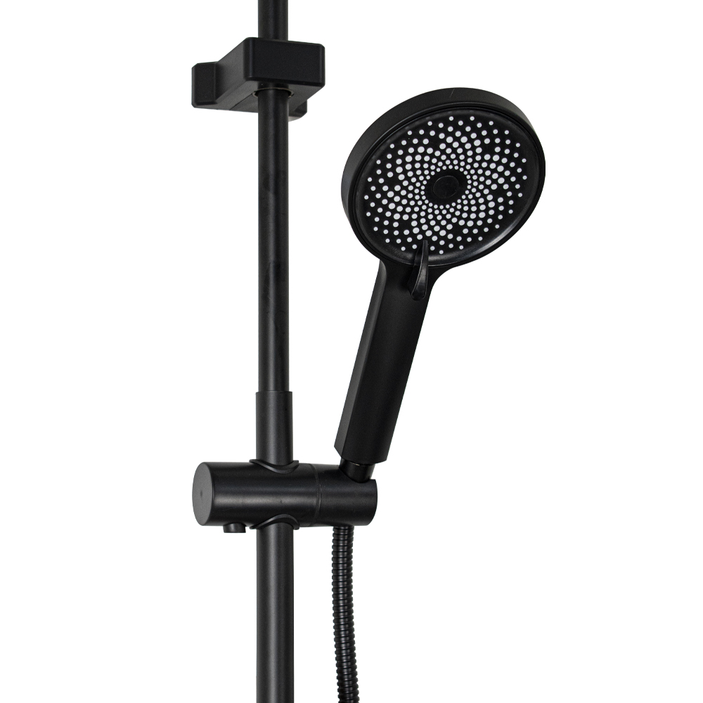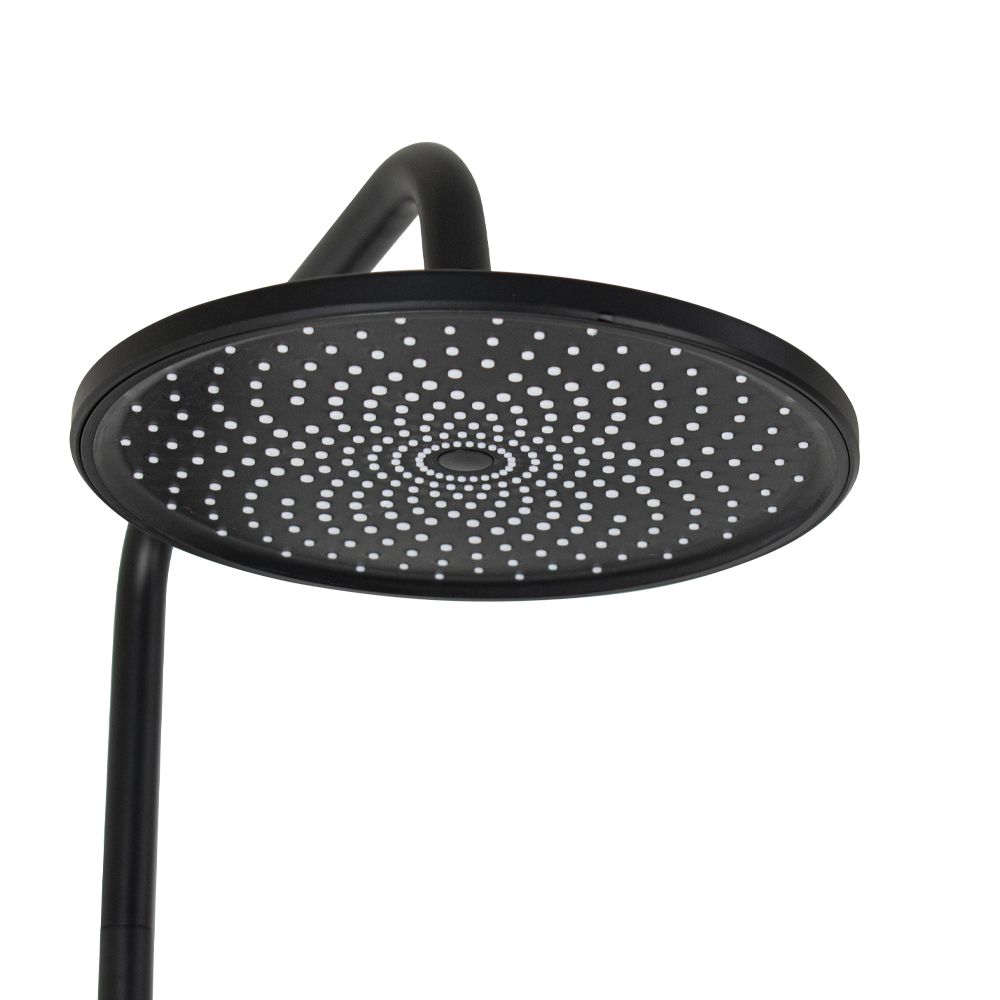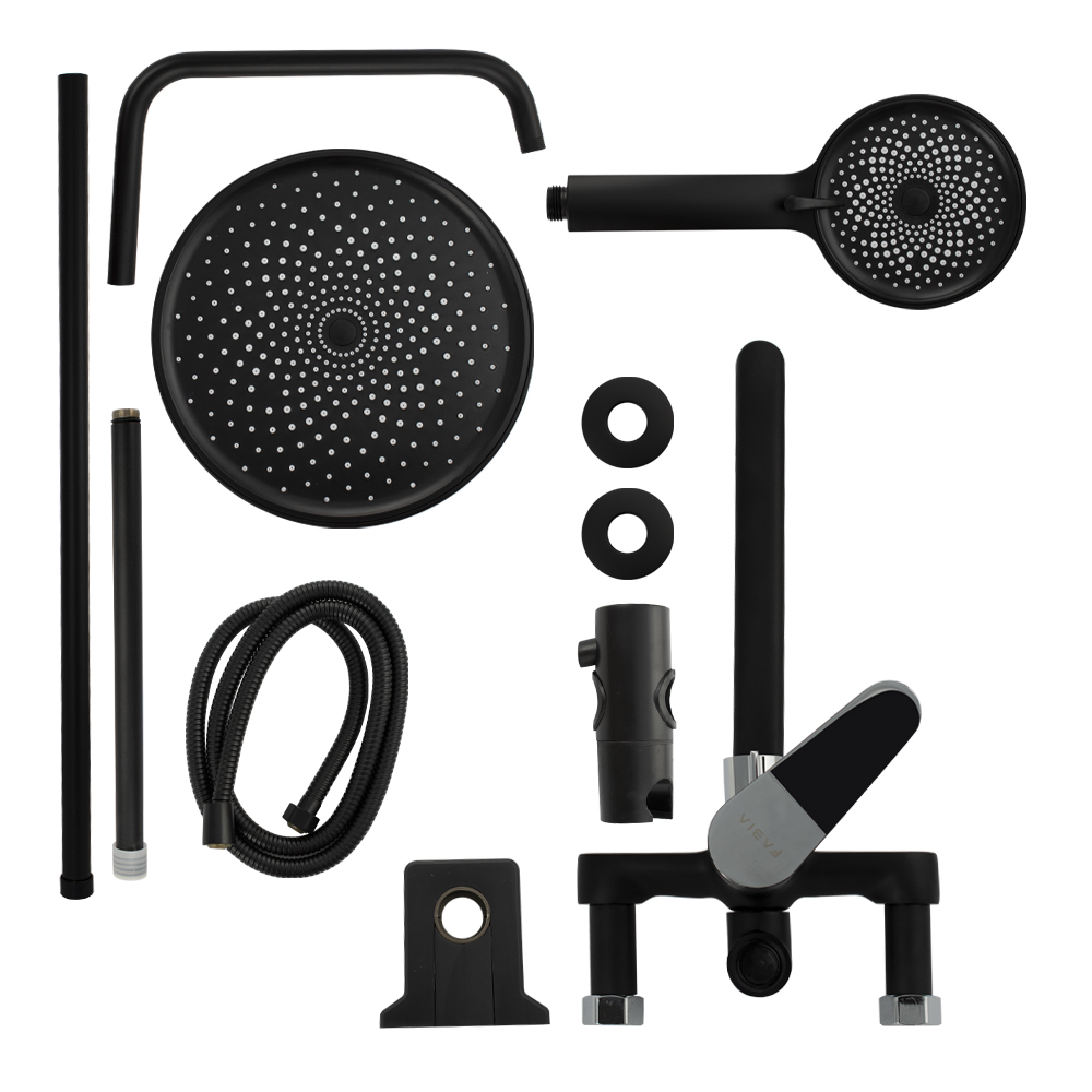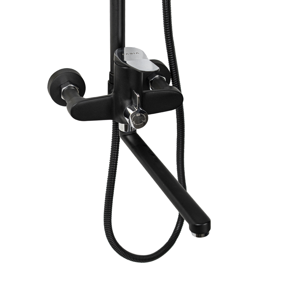 Смеситель + стойка душевая телескопическая "тропический душ" с двумя лейками в ванную / душевую комнату, хромированный с покрытием черная эмаль. Смеситель шаровый с длинным поворотным изливом, душевым шлангом и лейкой, дивертор переключения в трёх положениях. Материал изготовления — латунь. Картридж d = 40 мм, ручка литая, аэратор для экономии воды, чашки и эксцентрики. Душевая, регулируемая по высоте стойка с присоединением к корпусу смесителя и дополнительным креплением к стене и большой круглой лейкой с эффектом тропического душа. Габаритные размеры: ширина смесителя 150 мм, высота 150 мм, длина излива корпуса 300 мм, высота телескопической стойки 800-1200 мм, длина излива стойки 320 мм, круглая душевая лейка 120 мм, круглая лейка тропический душ 225 мм, шланг 150 см. Вес - 4.12 кг, объём - 0.02847 м3. В комплекте корпус с изливом, чашки, эксцентрики, прокладки, стойка, дивертор, шланг, две лейки, крепления.