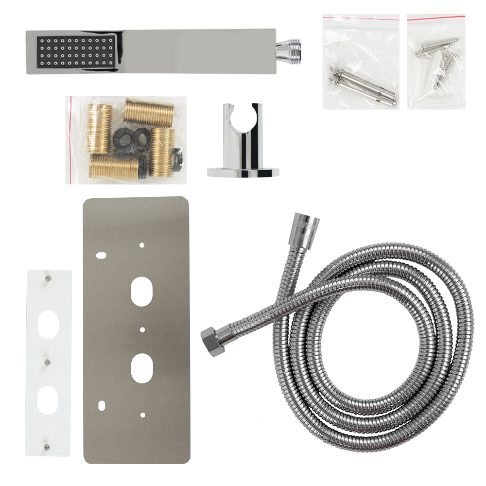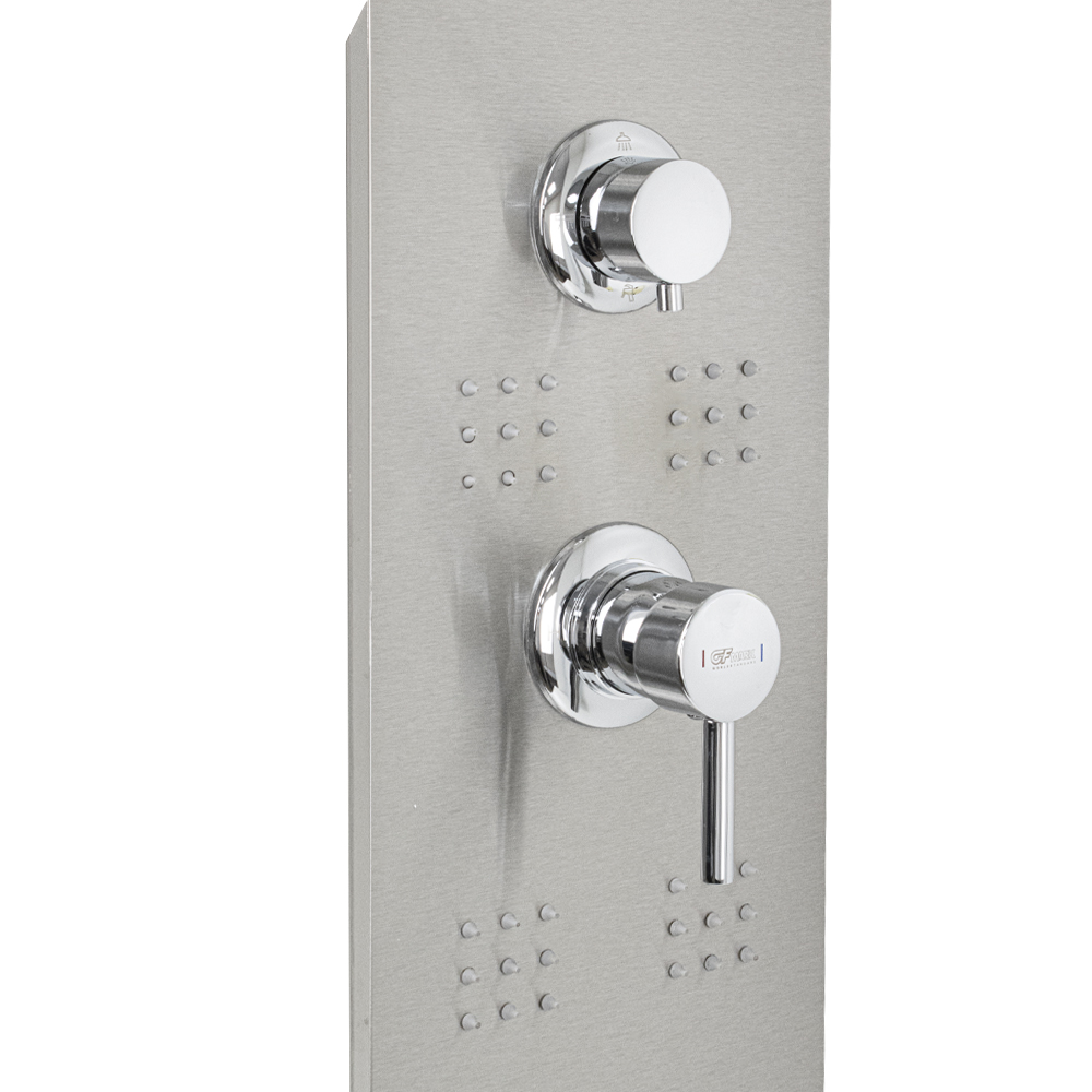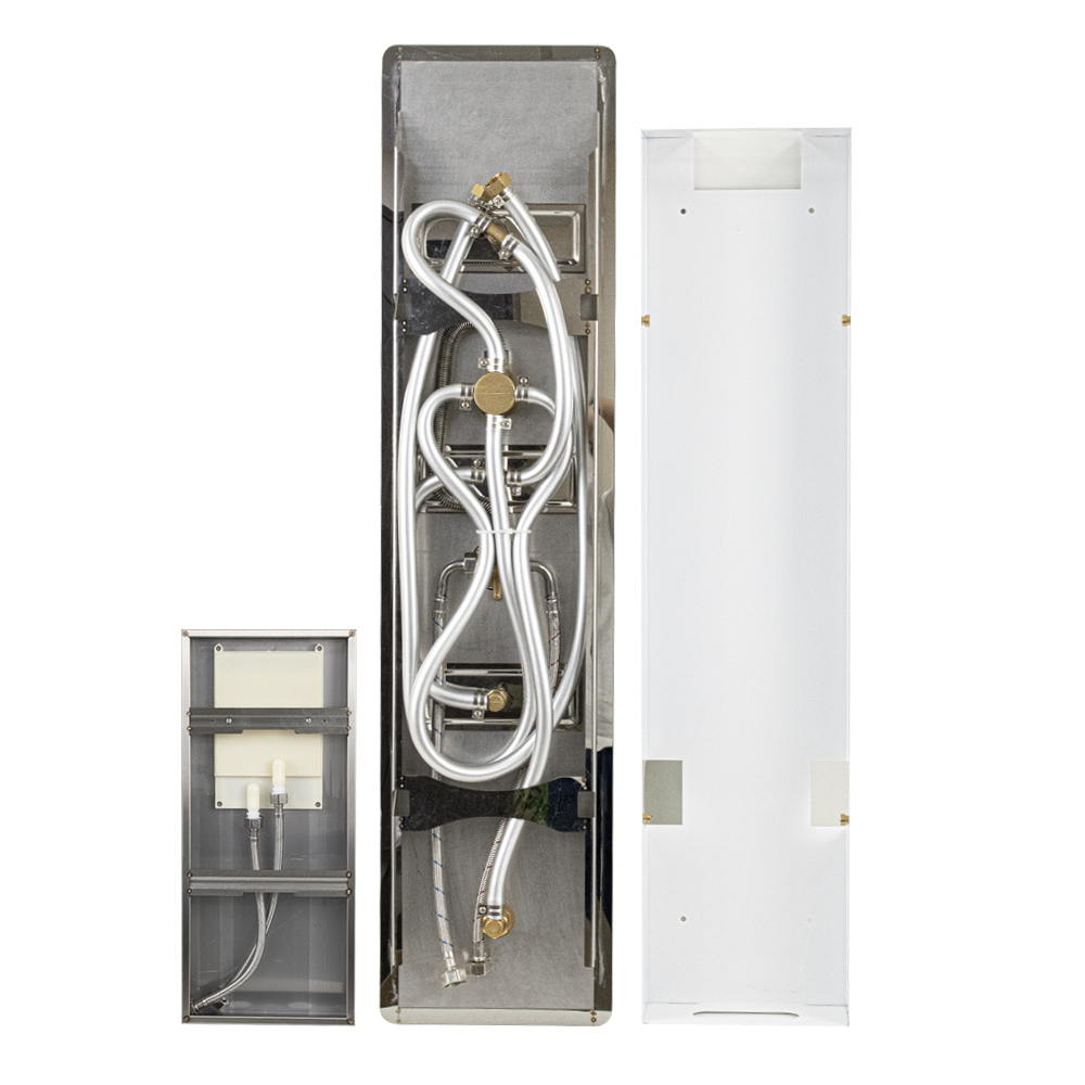 Ультрамодная дизайнерская гидромассажная ВРЕЗНАЯ душевая панель - "тропический душ" с двумя лейками и форсунками, 4 режима работы, с коротким изливом. Функциональность обеспечивают тропический, верхний каскадный душ, ручная лейка и форсунки для массажа спины. Эффектный внешний вид и практичность эксплуатации придает изделию из нержавеющей стали марки 304 матовая хромированная поверхность. Сочетание эстетики и максимального комфорта достигается за счет интегрированных гидромассажных форсунок и встроенного верхнего душа. Стильное и компактное оборудование предназначено для установки в ванну или любую душевую зону. Душевая панель позволит проводить оздоровительные процедуры в домашних условиях, гидромассажные форсунки окажут мягкое терапевтическое воздействие. Габаритные размеры: высота 920 мм, ширина 220 мм, длина верхнего душа 500 мм, длина излива 65 мм, длина шланга 150 см. Вес - 12,000 кг, объём - 0,10400 м3. Комплект: корпус / крепления / лейка / держатель для лейки / душевой шланг / излив / переключатель п