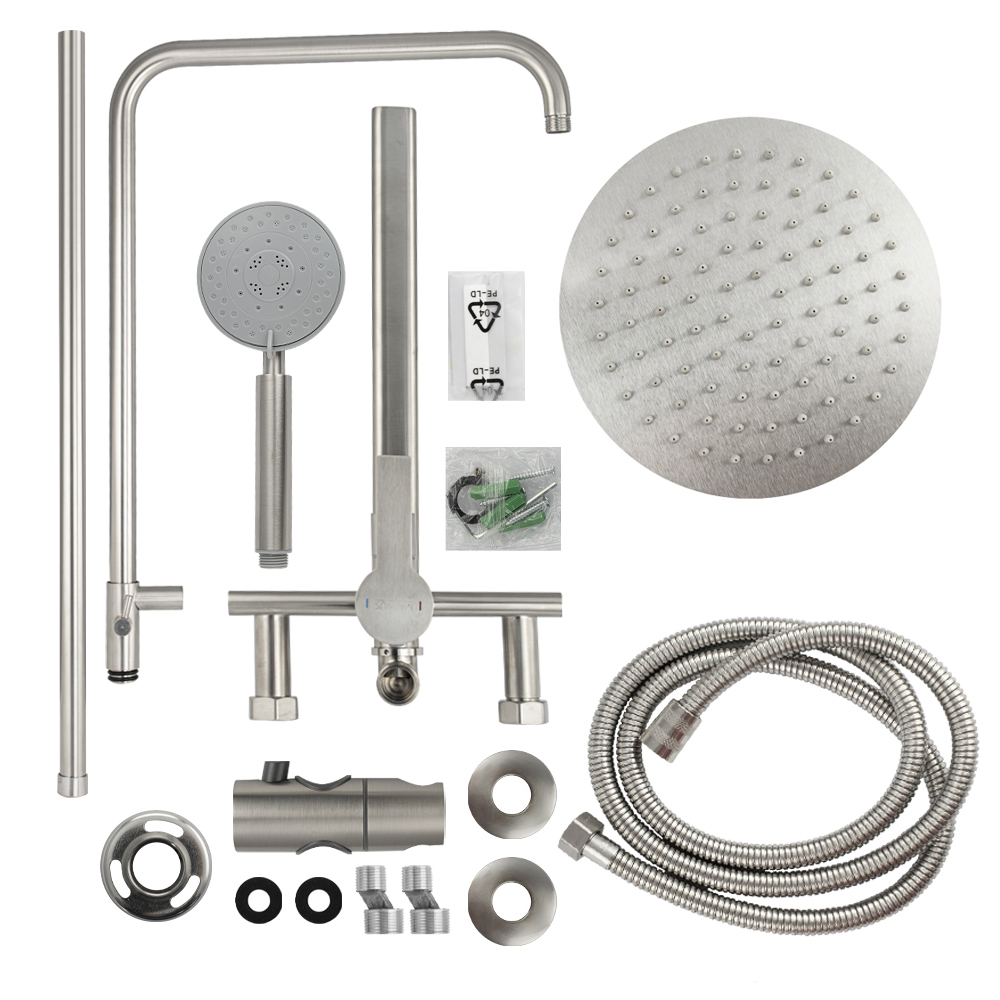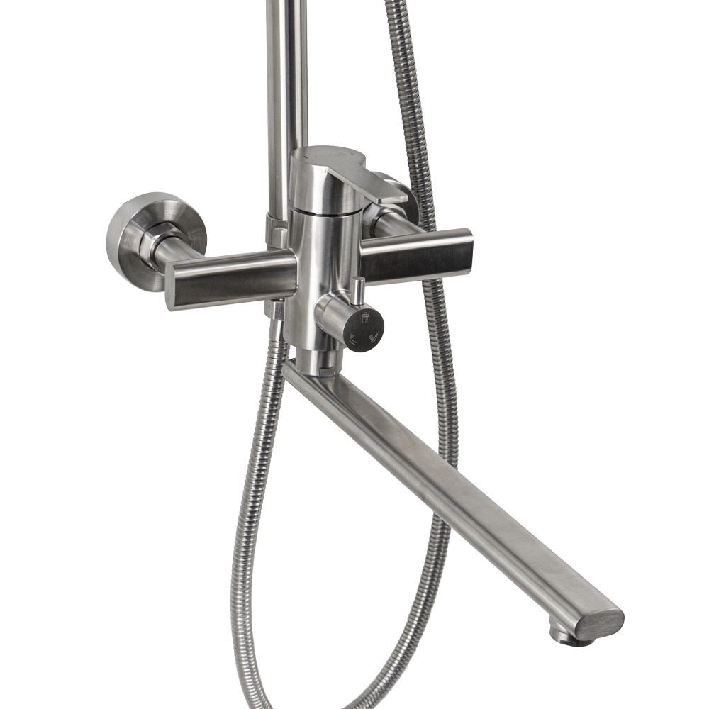 Смеситель + стойка душевая телескопическая "тропический душ" с двумя лейками в ванную / душевую комнату, матовая, из нержавеющей стали марки SUS 304. Смеситель шаровый, овальный корпус с длинным плоским поворотным изливом, душевым шлангом и лейкой, дивертор переключения в трёх положениях. Картридж d = мм, ручка литая, аэратор для экономии воды, чашки и эксцентрики. Душевая стойка с присоединением к корпусу смесителя и дополнительным креплением к стене и большой круглой лейкой с эффектом тропического душа. Габаритные размеры: ширина смесителя 150 мм, высота 160 мм, длина излива корпуса 350 мм, высота телескопической стойки 1200 мм, длина излива стойки 340 мм, круглая душевая лейка d = 100 мм, круглая лейка тропический душ d = 225 мм, шланг 150 см. Вес - кг, объём - м3. В комплекте корпус с изливом, чашки, эксцентрики, прокладки, стойка, дивертор, шланг, две лейки, крепления.