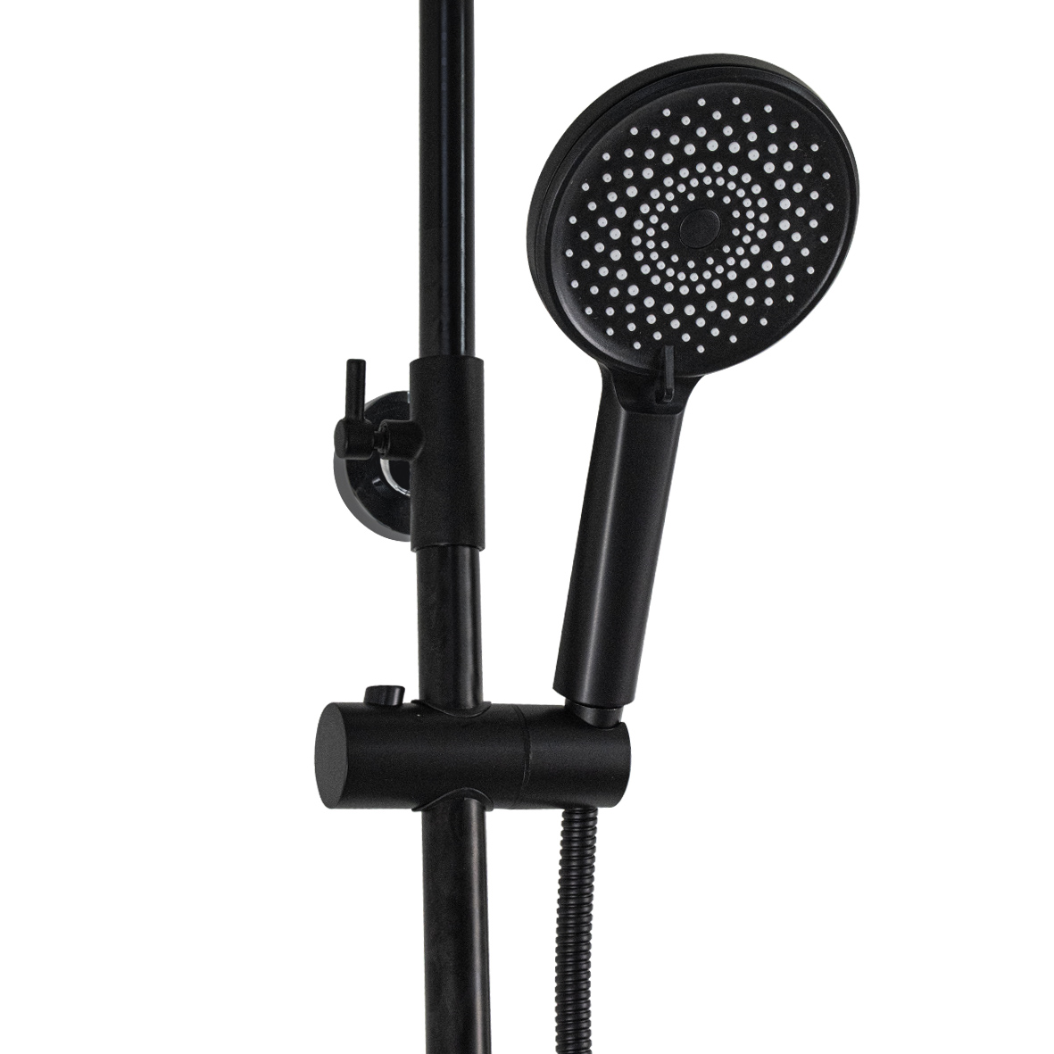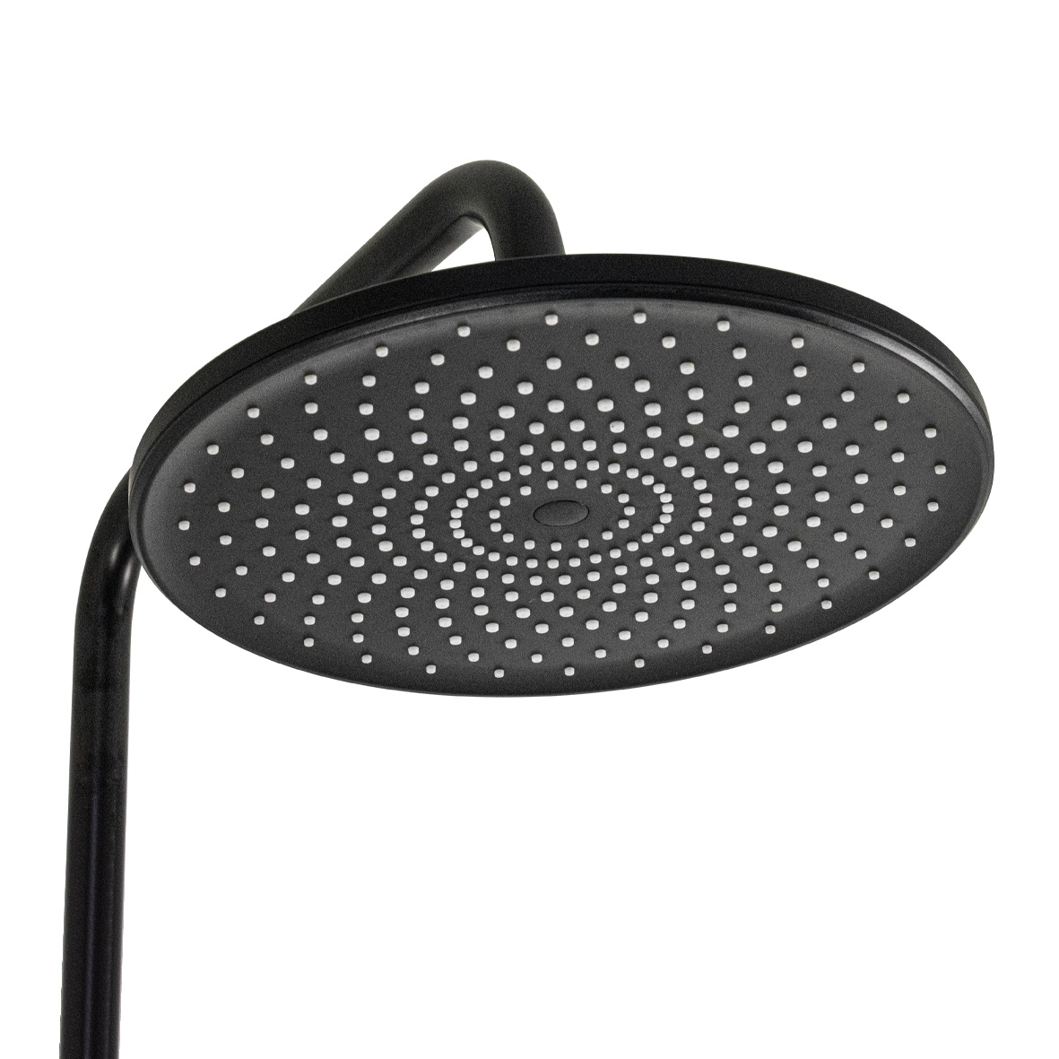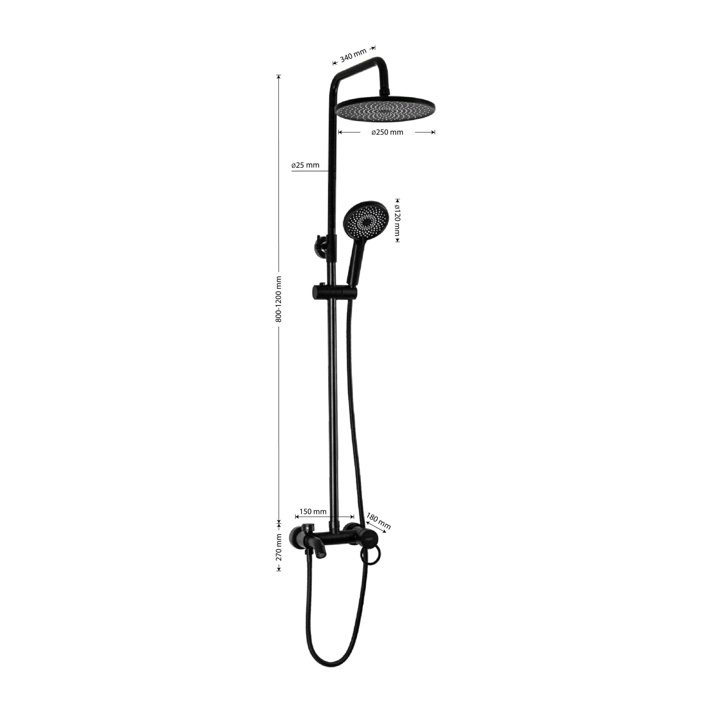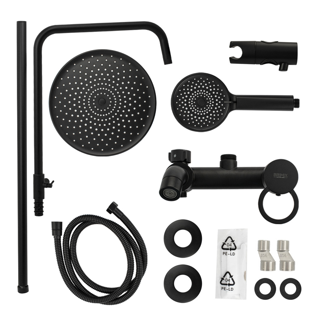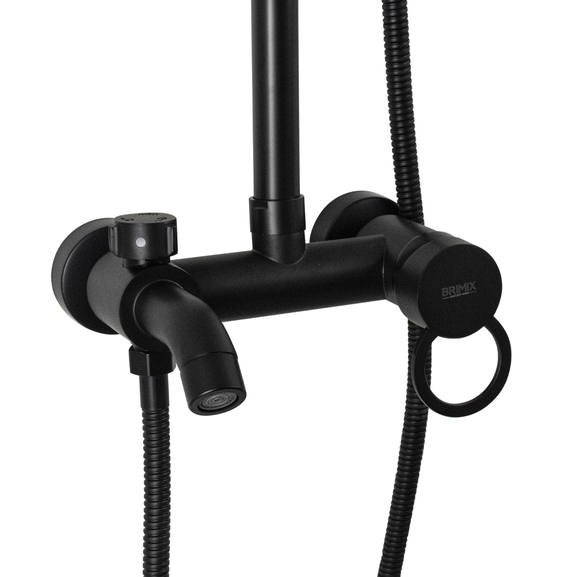 Смеситель + стойка душевая "тропический душ" с двумя лейками в ванную, чёрного цвета. В дизайне душевой стойки гармонично соединились строгие линии и мягкие переходы. Она отлично впишется в интерьер ванной комнаты в минималистическом стиле. Матовое покрытие чёрного цвета не стирается и сохраняет первозданный внешний вид в течение всего периода эксплуатации. Длительную работу без протечек обеспечивает смеситель с керамическим картриджем. Предусмотрен излив для наполнения ванны. Угол наклона верхнего душа можно регулировать в соответствии с потребностями каждого пользователя. Ручная лейка оснащена металлическим шлангом, который не перекручивается во время водных процедур. Смеситель шаровый с коротким изливом, душевым шлангом и лейкой и дивертор переключения в трёх положениях. Картридж d = 35 мм, ручка с кольцом, аэратор для экономии воды, чашки и эксцентрики. Душевая стойка с присоединением к корпусу смесителя и дополнительным креплением к стене и большой круглой лейкой с эффектом тропического душа. Габаритные