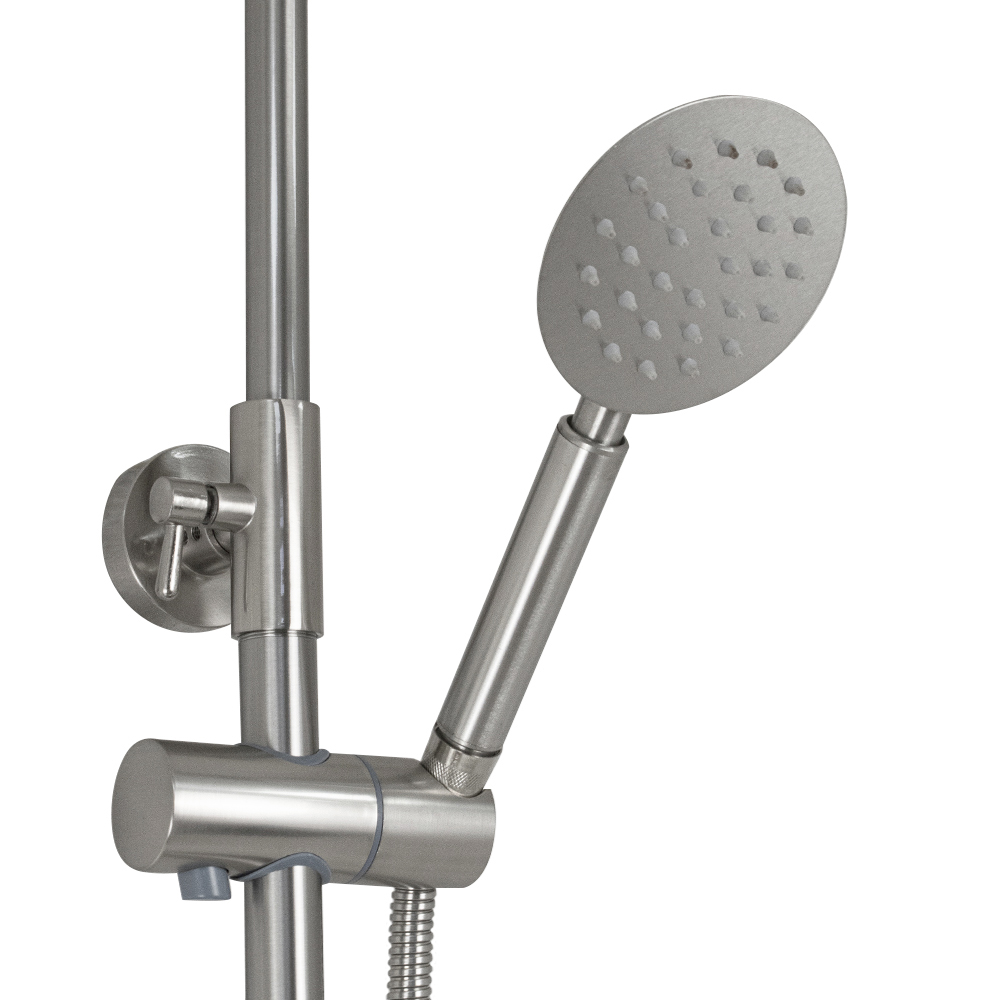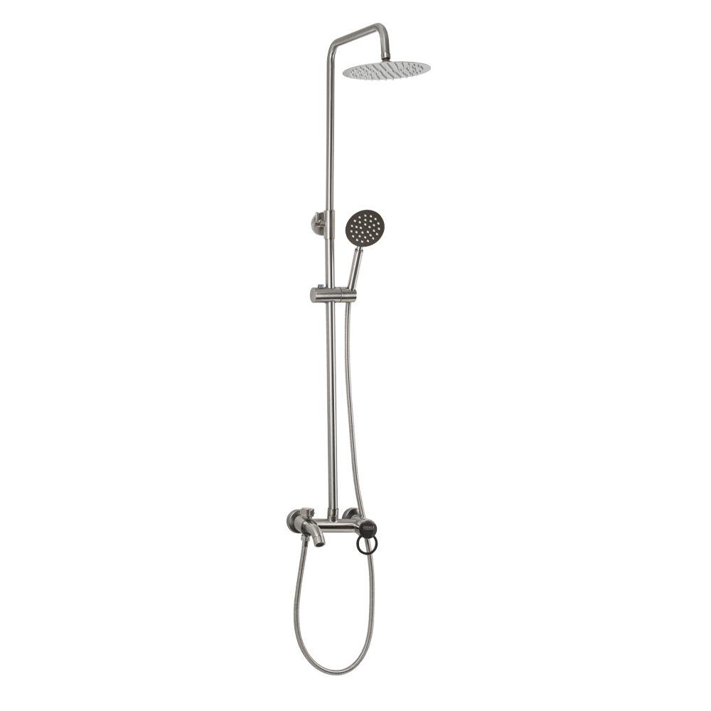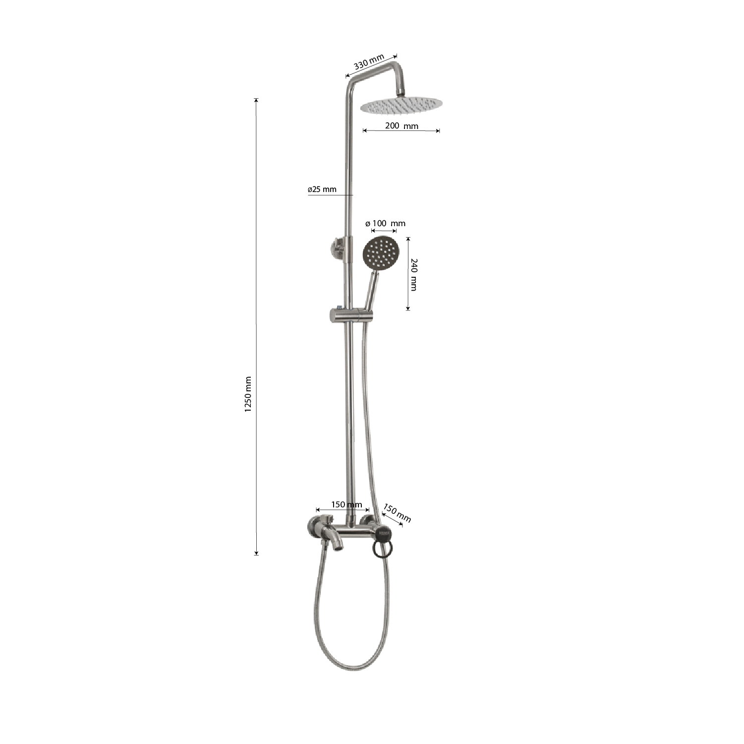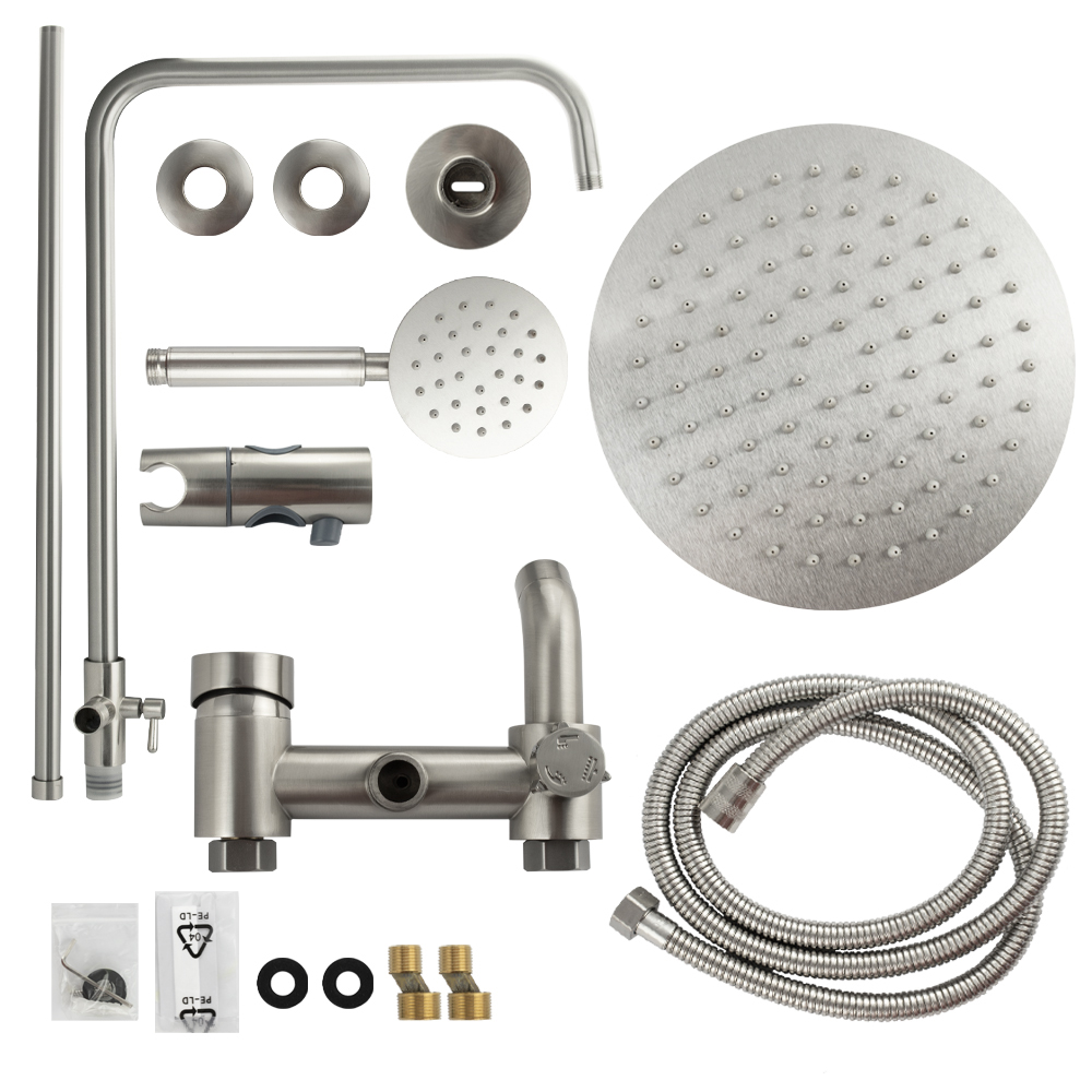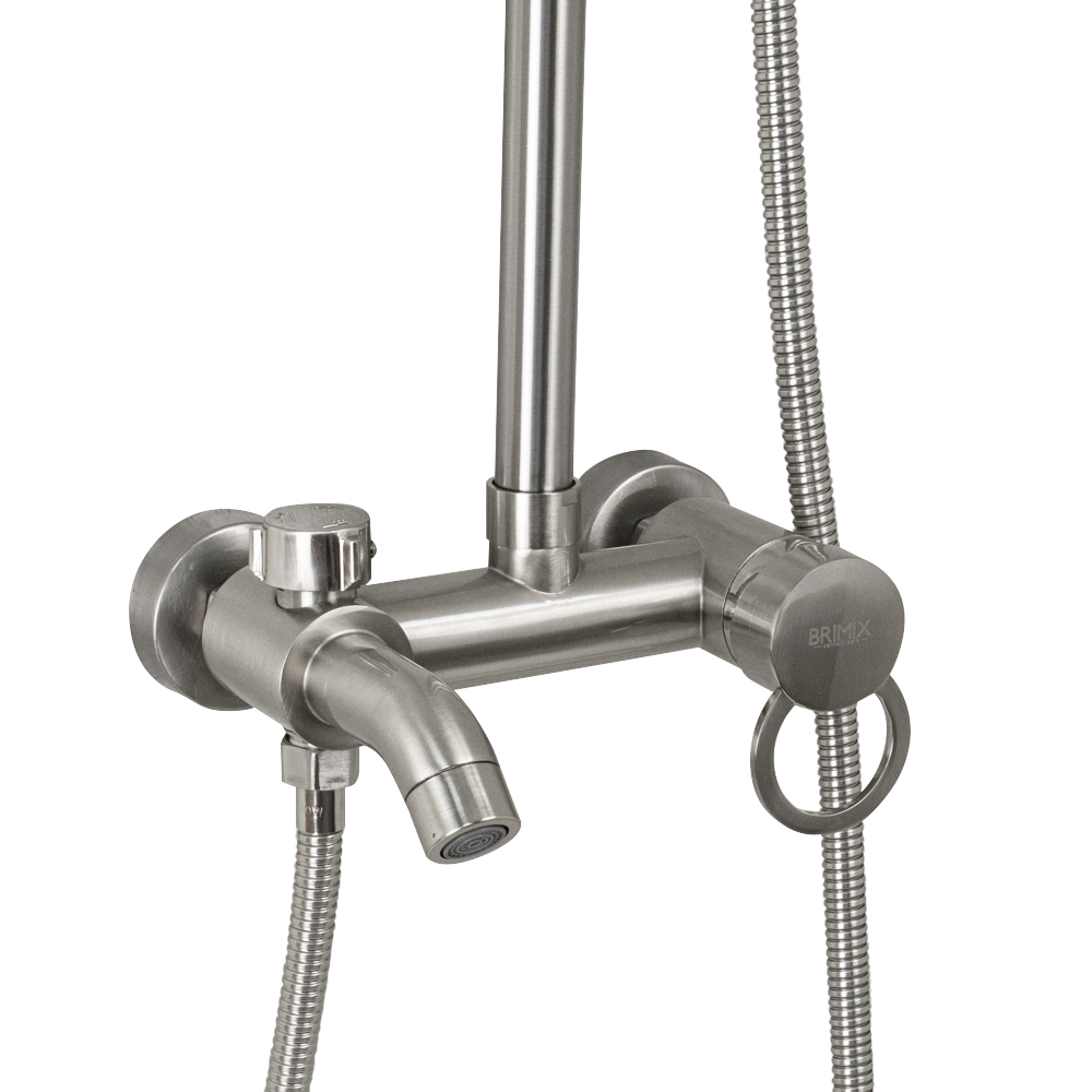 Смеситель + стойка душевая "тропический душ" с двумя лейками в ванную, матовый хром. В дизайне душевой стойки гармонично соединились строгие линии и мягкие переходы. Она отлично впишется в интерьер ванной комнаты в минималистическом стиле. Матовое хромированное покрытие не стирается и сохраняет первозданный внешний вид в течение всего периода эксплуатации. Длительную работу без протечек обеспечивает смеситель с керамическим картриджем. Предусмотрен излив для наполнения ванны. Угол наклона верхнего душа можно регулировать в соответствии с потребностями каждого пользователя. Ручная лейка оснащена металлическим шлангом, который не перекручивается во время водных процедур. Смеситель шаровый с коротким изливом, душевым шлангом и лейкой и дивертор переключения в трёх положениях. Картридж d = 35 мм, ручка с кольцом, аэратор для экономии воды, чашки и эксцентрики. Душевая стойка с присоединением к корпусу смесителя и дополнительным креплением к стене и большой круглой лейкой с эффектом тропического душа. Габаритные р
