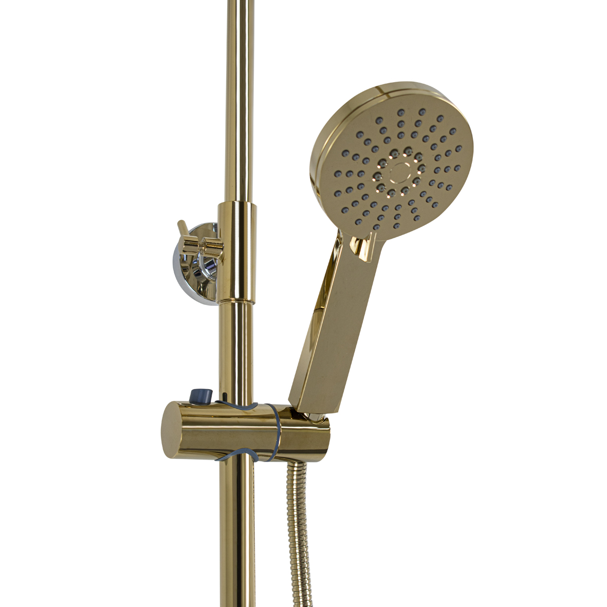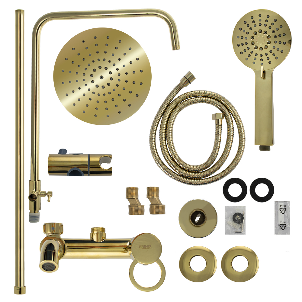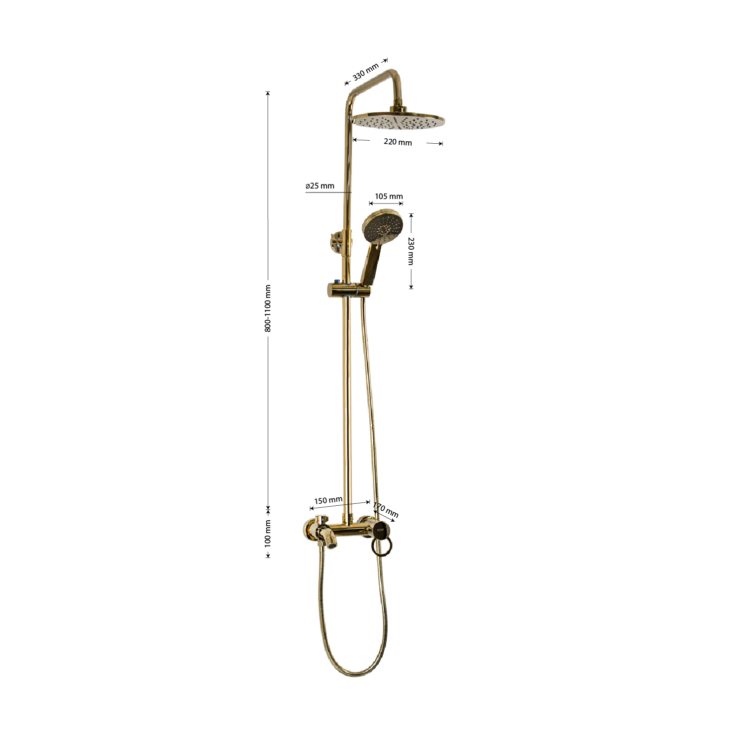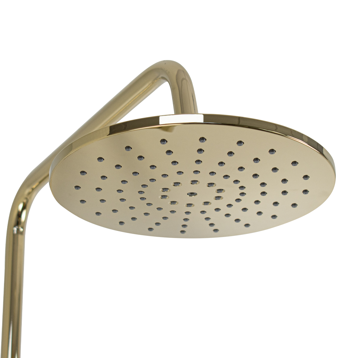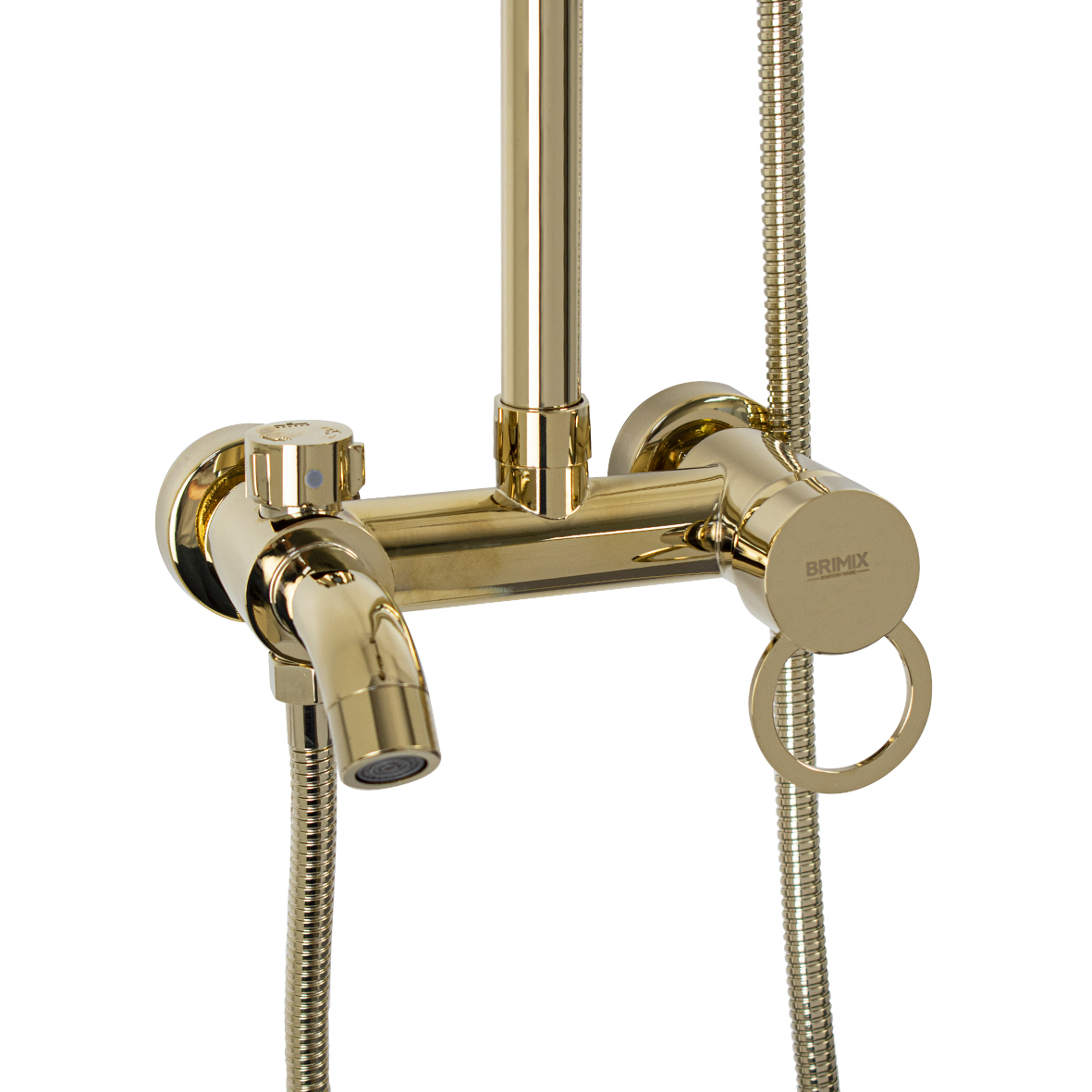 Смеситель + стойка душевая "тропический душ" с двумя лейками в ванную, цвет под золото. В дизайне душевой стойки гармонично соединились строгие линии и мягкие переходы. Она отлично впишется в интерьер ванной комнаты в минималистическом стиле. Глянцевое покрытие под состаренную бронзу не стирается и сохраняет первозданный внешний вид в течение всего периода эксплуатации. Длительную работу без протечек обеспечивает смеситель с керамическим картриджем. Предусмотрен излив для наполнения ванны. Угол наклона верхнего душа можно регулировать в соответствии с потребностями каждого пользователя. Ручная лейка оснащена металлическим шлангом, который не перекручивается во время водных процедур. Смеситель шаровый с коротким изливом, душевым шлангом и лейкой и дивертор переключения в трёх положениях. Картридж d = 35 мм, ручка с кольцом, аэратор для экономии воды, чашки и эксцентрики. Душевая стойка с присоединением к корпусу смесителя и дополнительным креплением к стене и большой круглой лейкой с эффектом тропического душа