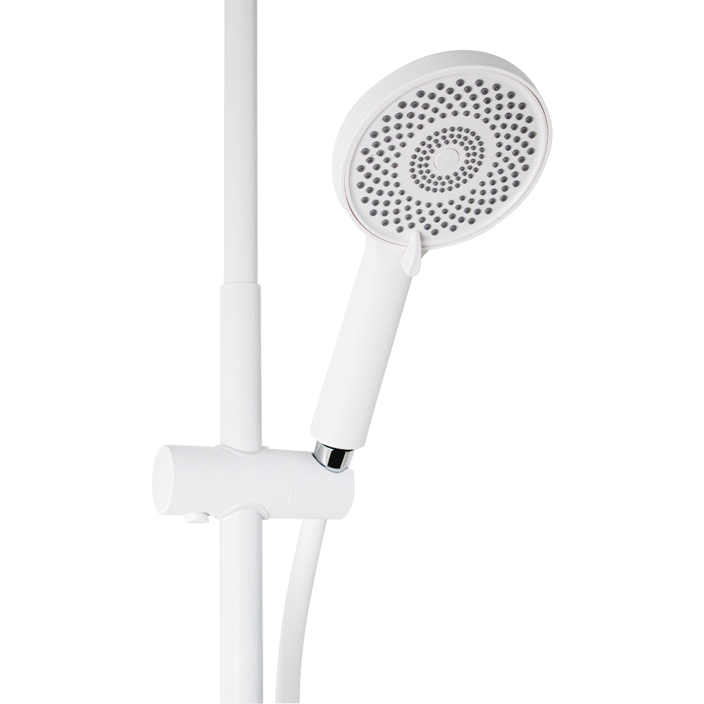 Смеситель + стойка душевая телескопическая "тропический душ" с двумя лейками в ванную / душевую комнату, белая. Смеситель шаровый, пластик АБС с поворотным круглым длинным изливом, душевым шлангом и лейкой и дивертор переключения в трёх положениях. Картридж d = мм, ручка литая, аэратор для экономии воды, чашки и эксцентрики. Душевая, регулируемая по высоте стойка с присоединением к корпусу смесителя и дополнительным креплением к стене и крючками для принадлежностей и большой круглой лейкой с эффектом тропического душа. Габаритные размеры: ширина смесителя 150 мм, высота 270 мм, длина излива корпуса 270 мм, высота телескопической стойки 800-1100n мм, длина излива стойки 330 мм, круглая душевая лейка d = 120 мм, круглая лейка тропический душ d = 230 мм, шланг 150 см. Вес - 3,070 кг, объём - 0,029 м3. В комплекте корпус с изливом, чашки, эксцентрики, прокладки, стойка, дивертор, шланг, две лейки, крепления.