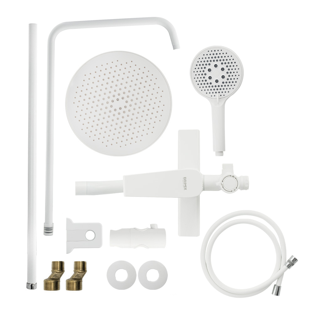 Смеситель + стойка душевая телескопическая "тропический душ" с двумя лейками в ванную / душевую комнату, белая. Смеситель шаровый, пластик АБС с поворотным коротким изливом, душевым шлангом и лейкой и дивертор переключения в трёх положениях. Картридж d = 35 мм, ручка литая, аэратор для экономии воды, чашки и эксцентрики. Душевая, регулируемая по высоте стойка с присоединением к корпусу смесителя и дополнительным креплением к стене и крючками для принадлежностей и большой круглой лейкой с эффектом тропического душа. Габаритные размеры: ширина смесителя 150 мм, высота 270 мм, длина излива корпуса 100 мм, высота телескопической стойки 800-1200 мм, длина излива стойки 360 мм, круглая двухрежимная душевая лейка d = 130 мм, круглая лейка тропический душ d = 230 мм, шланг 150 см. Вес - 3.07 кг, объём - 0.02941 м3. В комплекте корпус с изливом, чашки, эксцентрики, прокладки, стойка, дивертор, шланг, две лейки, крепления.