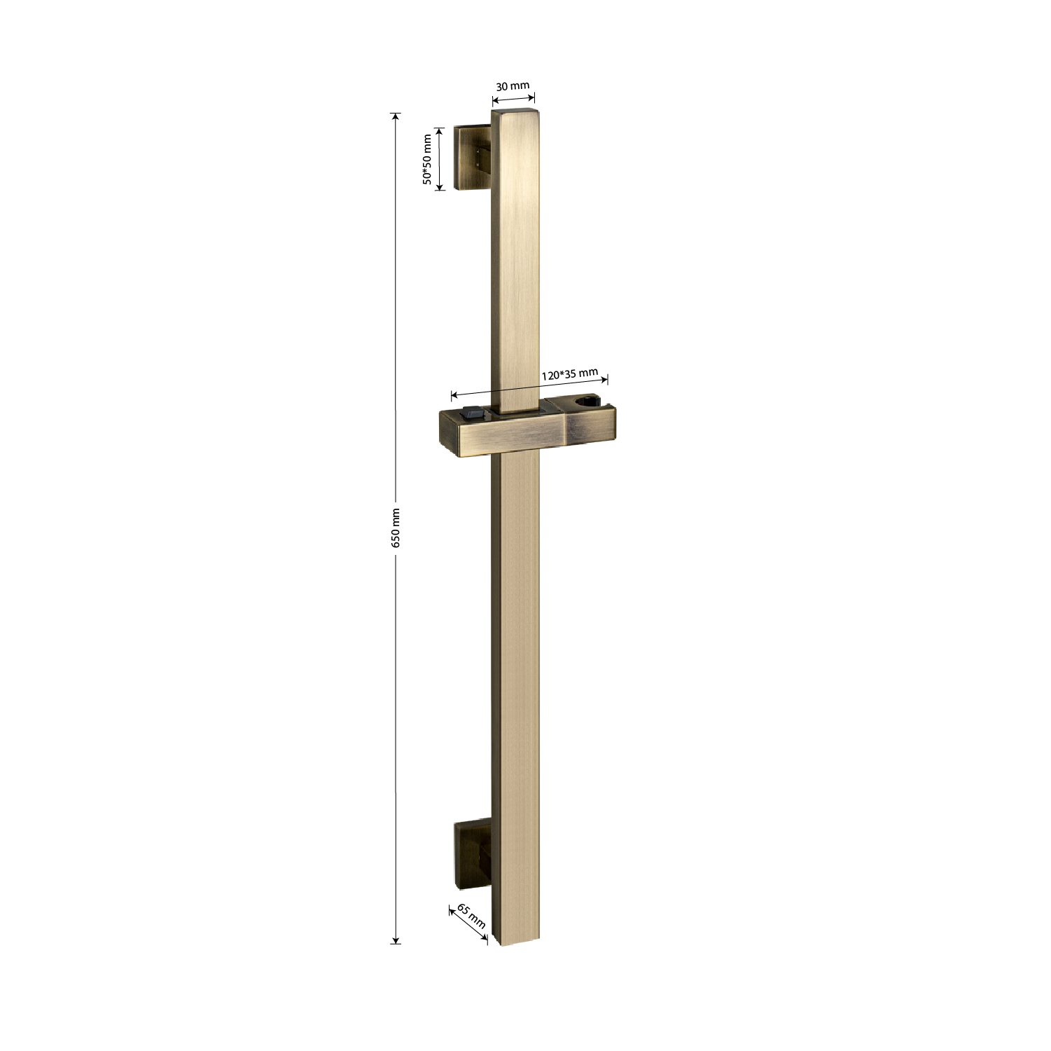 Душевая стойка, квадратный профиль, цвет бронза, произведена из нержавеющей стали марки 304, устойчивой к агрессивному воздействию внешней среды и механическим деформациям, держатель для душа с механической фиксацией и регулировкой по высоте. Размеры: высота штанги 650 мм, глубина 65 мм, ширина трубы 30 мм, крепление 50*50 мм. Вес - 0.87 кг, объём - 0.0085 м3. В комплекте душевая штанга, крепления, держатель душевой лейки.