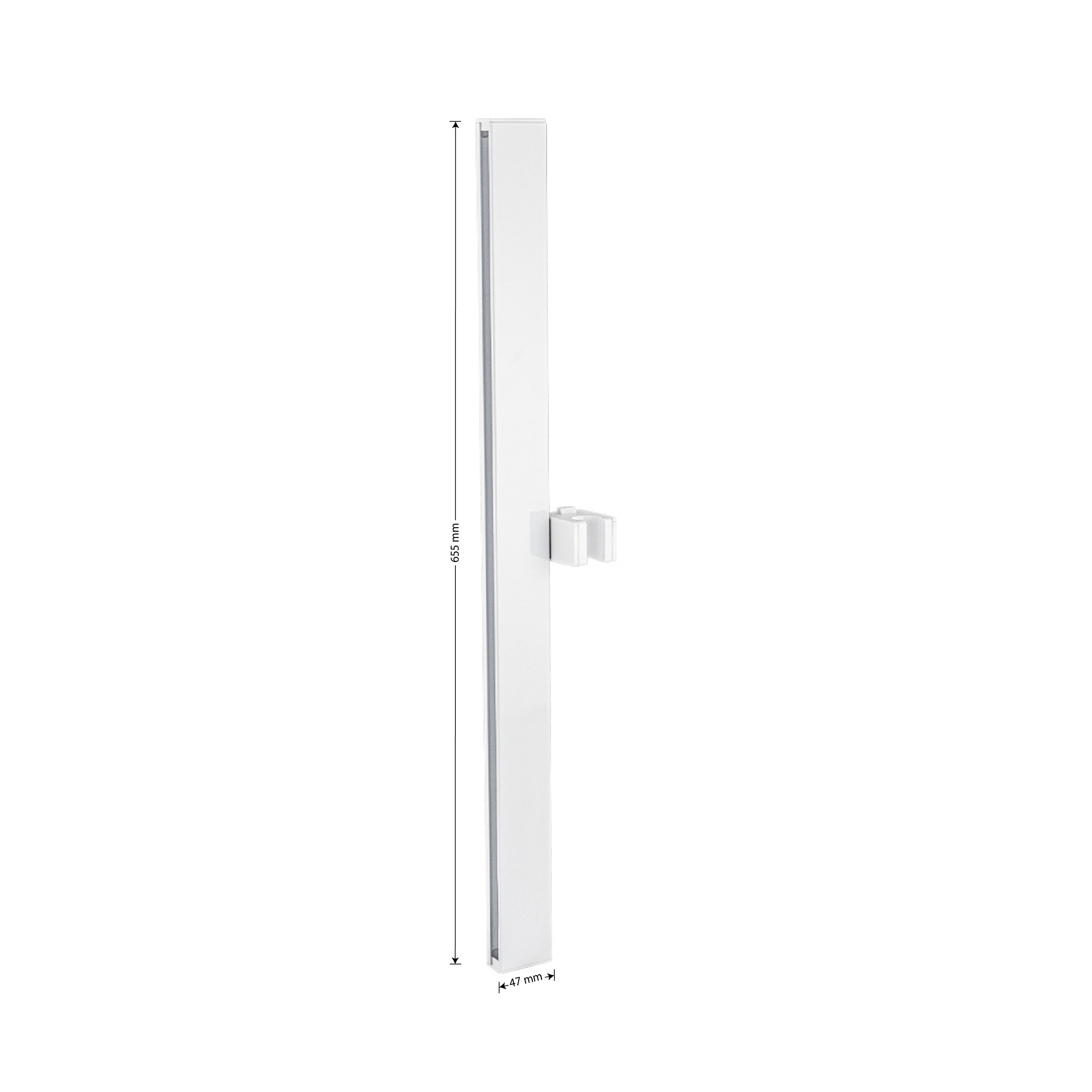 Душевая стойка, глянцевая, квадратный профиль, цвет белый, произведена из высокопрочного АБС пластика, устойчивой к агрессивному воздействию внешней среды и механическим деформациям, держатель для душа с механической фиксацией и регулировкой по высоте. Размеры: высота штанги 655 мм, глубина 20 мм, ширина трубы 47 мм, расстояние между креплением 605 мм. Вес - 0.49 кг, объём - 0.00495 м3. В комплекте душевая штанга, крепления, держатель душевой лейки.