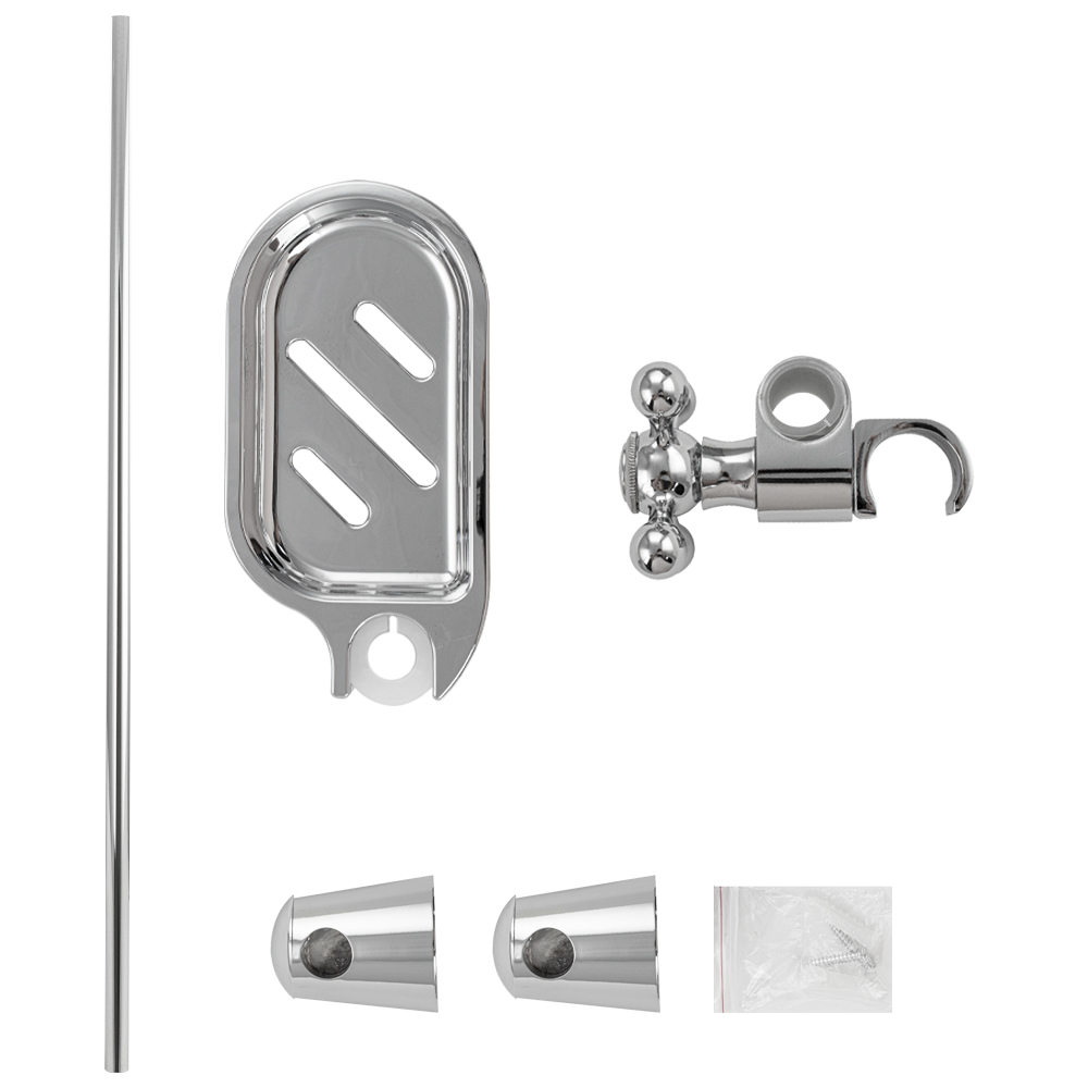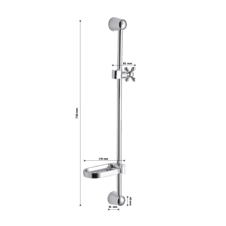 Душевая стойка с мыльницей, хромированная, произведена из нержавеющей стали и высокопрочного пластика АБС, устойчивой к агрессивному воздействию внешней среды и механическим деформациям. Хромированная поверхность не подвержена механическим повреждениям, а ее глянцевый блеск будет радовать в течение всего срока службы. Держатель для душа с механической фиксацией и регулировкой по высоте. Расстояние между настенными креплениями регулируется путем обрезания штанги, что позволяет использовать в процессе монтажа отверстия, имеющиеся в стене. Габаритные размеры: высота штанги 700 мм, глубина 55 мм, диаметр трубы 25 мм, диаметр основания крепления 60 мм, длина мыльницы 170 мм. Вес - 0,750 кг, объём - 0,00499 м3. В комплекте душевая штанга, мыльница, крепления, держатель душевой лейки.