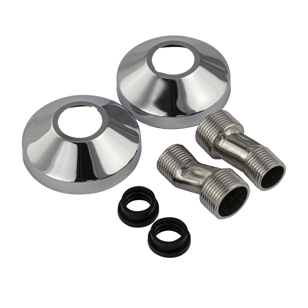 Комплект из нержавеющей стали: 2 эксцентрика + 2 чашки. Укомплектованные декоративными хромированными чашками резьбовые эксцентрики, обеспечивают беспроблемное подключение к водопроводу сантехнических смесителей. Применение изделий дает возможность компенсировать неточности при размещении водорозеток либо резьбовых патрубков стального водопровода, скорректировать положение смесителя в пространстве. Материалом фитинга является высокопрочная антикорозийная нержавеющая сталь марки SUS 304. Гальванопокрытие соединителей – никелевое, чашек – хромовое. Высота эксцентрика мм, чашка мм. Вес - 0,16 кг, объект - 0,0003 м3. Комплект: чашки, эксцентрики, уплотнения.