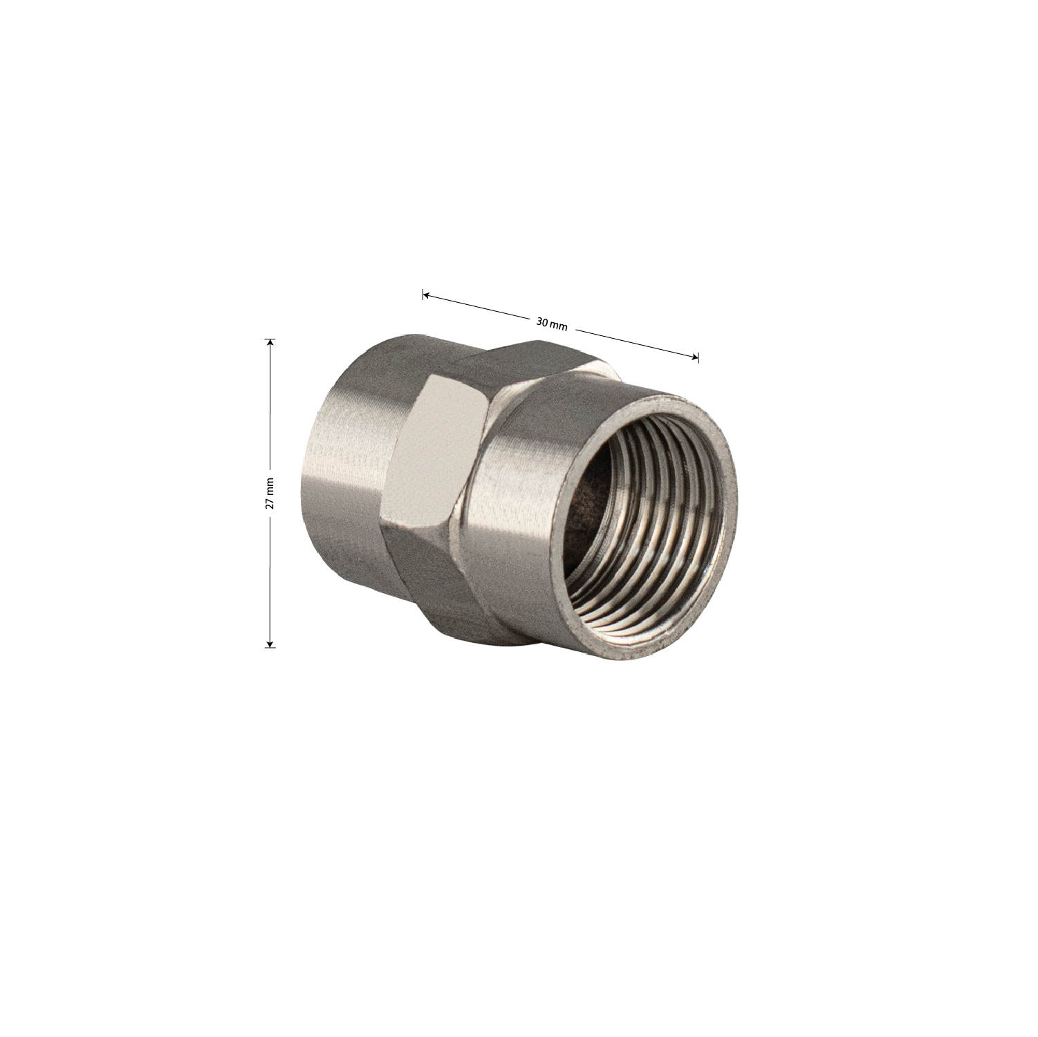 Муфта 1/2, м/м из нержавеющей стали марки 304. Габаритные размеры: высота 30 мм, ширина 25 мм. Вес - 0,010 кг, объем - 0,00003 м3.