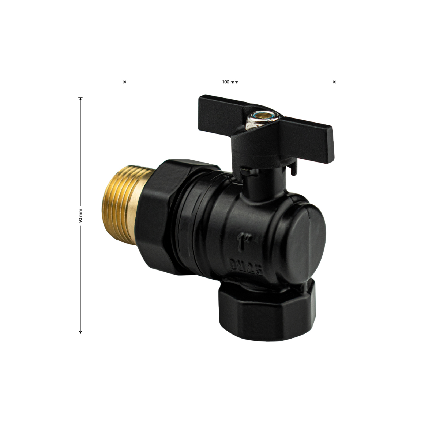 Кран шаровой, угловой, с "американкой " 1", ручка "бабочка", цвет черный. Выдерживают номинальное давление до 1,6 МПа, изготавливаются из высокопрочных марок латуни. Габаритные размеры: высота 90 мм, ширина 100 мм. Вес - 0,600 кг, объем - 0,00096 м3.