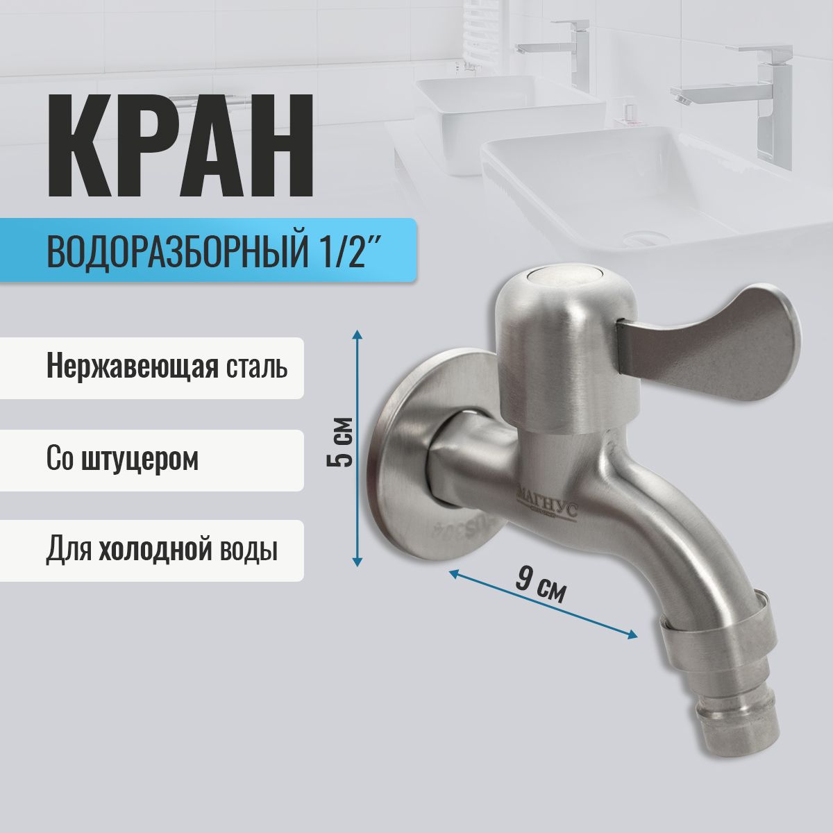 Кран водоразборный на 1/2", от стены 10 см, наружняя резьба, матовый корпус из нержавеющей стали марки 304, со штуцером для подключения поливочного шланга, металлокерамика, ручка флажок поворот на 90˚. Такая модель может использоваться на домашней кухне, на даче, в медицинских учреждениях и общественных местах. Габаритные размеры: высота 95 мм, длина 90 мм. Вес - 0,250 кг, объём - 0,00043 м3.