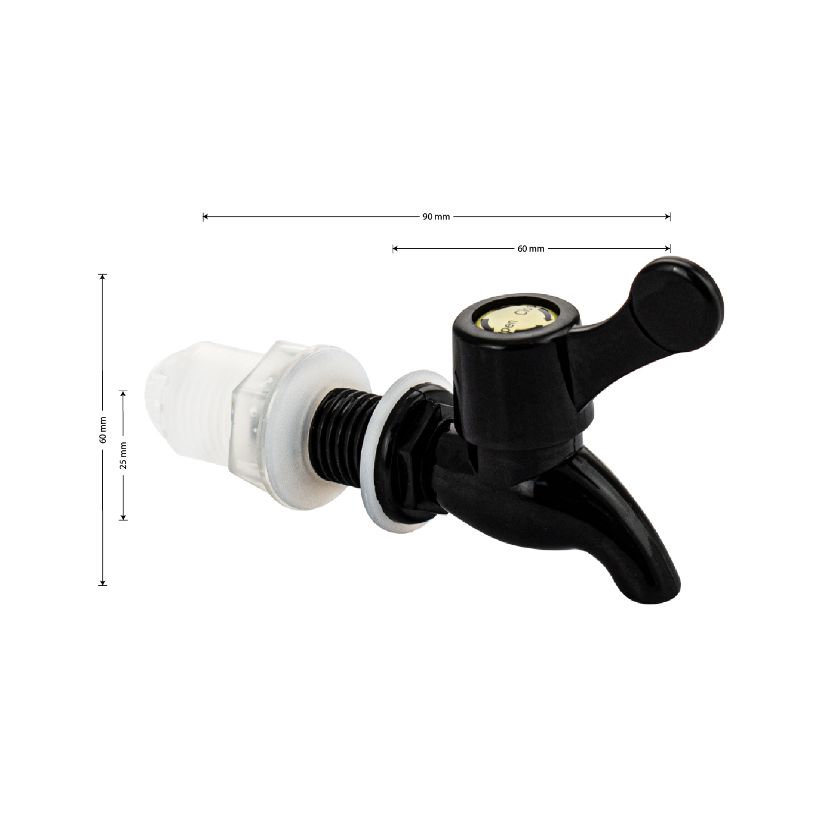 Кран из высокопрочного пластика АБС имеет широкий спектр применения во многих сферах, его можно использовать как кран в саду и как красивое украшение многих емкостей для различных жидкостей/напитков, таких как бочки, кувшины, цилиндры, подготовленные для монтажа крана. Габаритные размеры: высота 60 мм, длина 90 мм, длина от стены 60 мм, диаметр посадочного седла 25 мм. Вес 0,027 кг, объем 0,00013 м3.