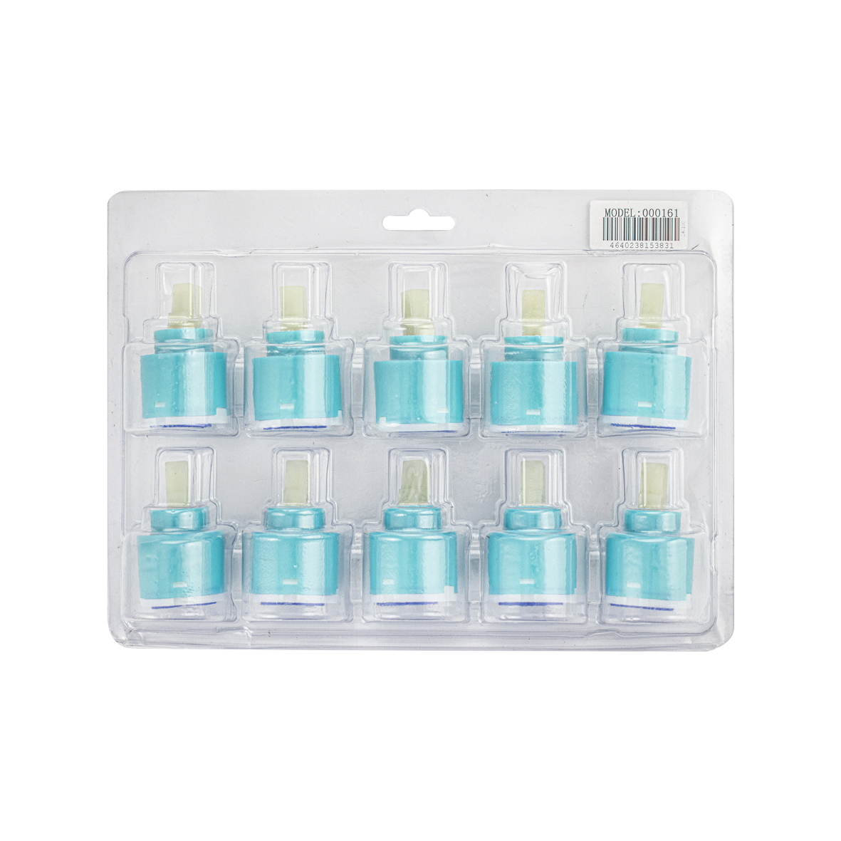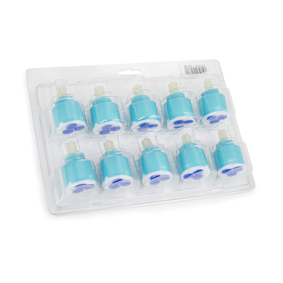 Картридж керамический в блистере , в упаковке 10 штук , предназначен для однорычажных смесителей. Угол поворота картриджа 90°, оснащен керамическими пластинами, изготовленными из износостойкой керамики. Ударопрочный корпус изготовлен из сверхпрочного пластика АБС с аморфной молекулярной структурой. Корпус выдерживает гидроудары, что особенно актуально для потребителей в периоды ремонта водоснабжающих сетей. Картридж для смесителя предназначается для смешивания потока горячей и холодной воды с целью получения на выходе комфортной температуры и обеспечивает надежную работу и точность регулировки воды в течение многих лет. Габаритные размеры: высота 65 мм, диаметр 35 мм. Вес - 0,05 кг, объём - 0,00015 м3.