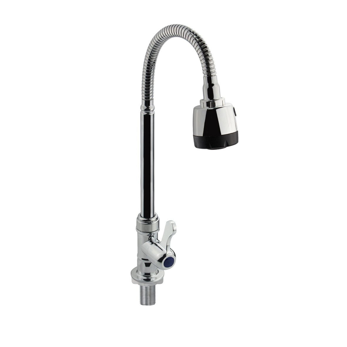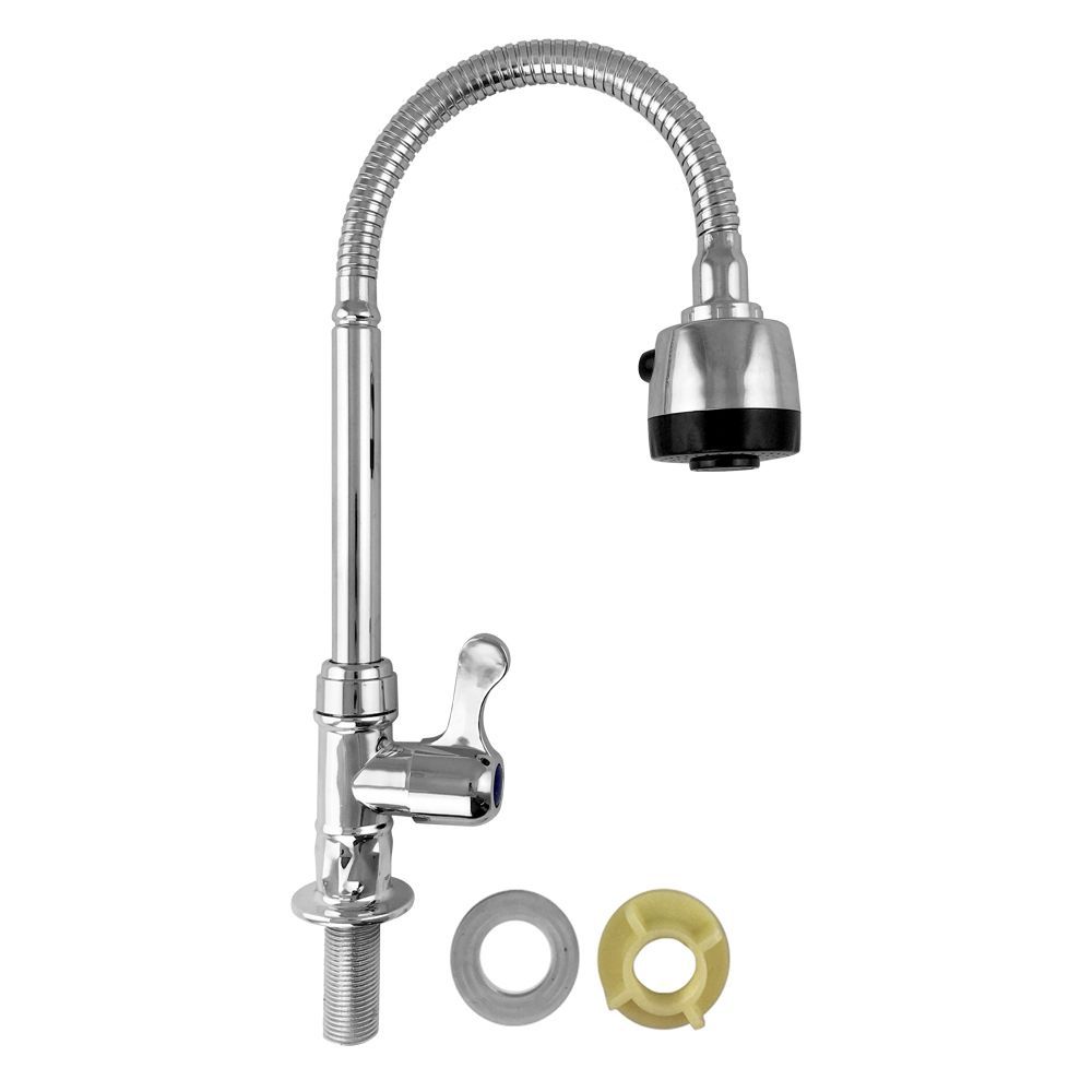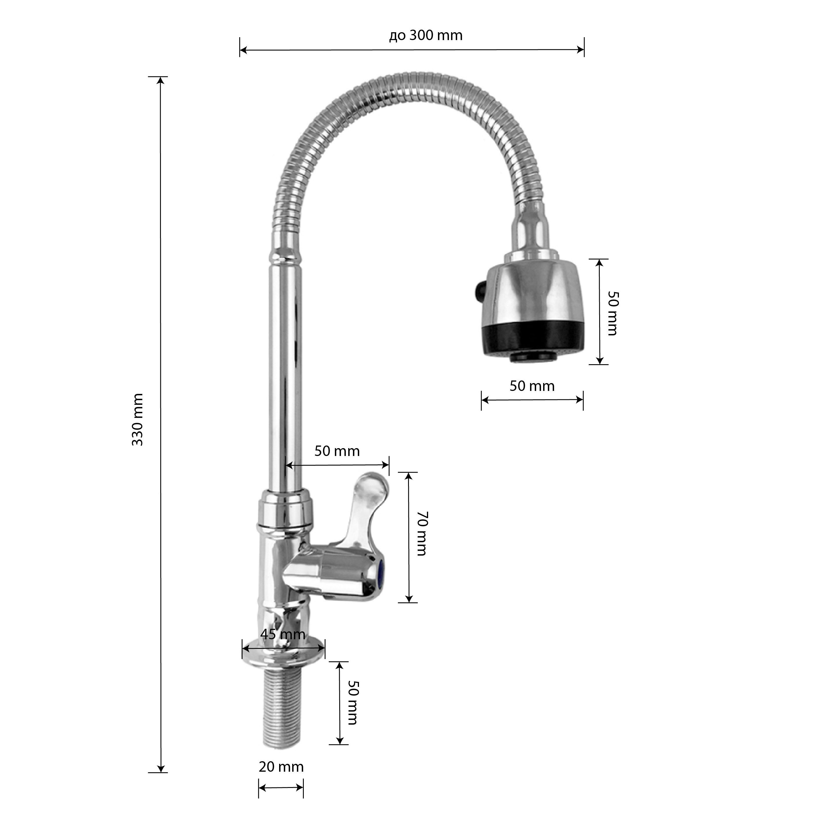 Кран на одну воду из высокопрочного пластика АБС, хромированный, с гибким изливом, с двухрежимным большим аэратором. Крепление резьба - гайка. Кранбукса м/к, ручка флажок, поворот на 90˚. Габаритные размеры: высота 280 мм, регулировка расположения излива от 170 до 270 мм, диаметр посадочного седла 45 мм, длина резьбы 50 мм. Вес - 0,450 кг, объём - 0,00252 м3. В комплекте корпус, крепёж