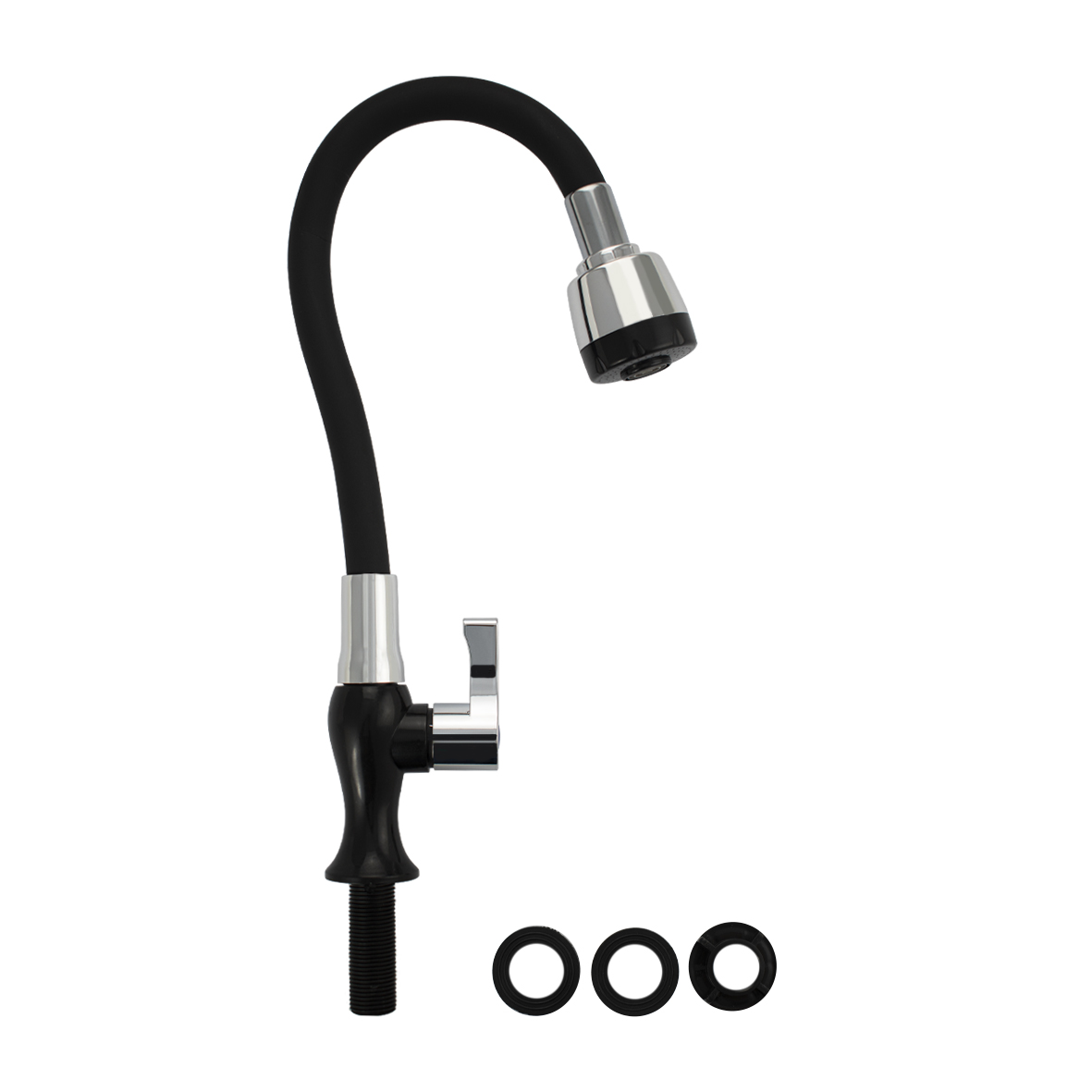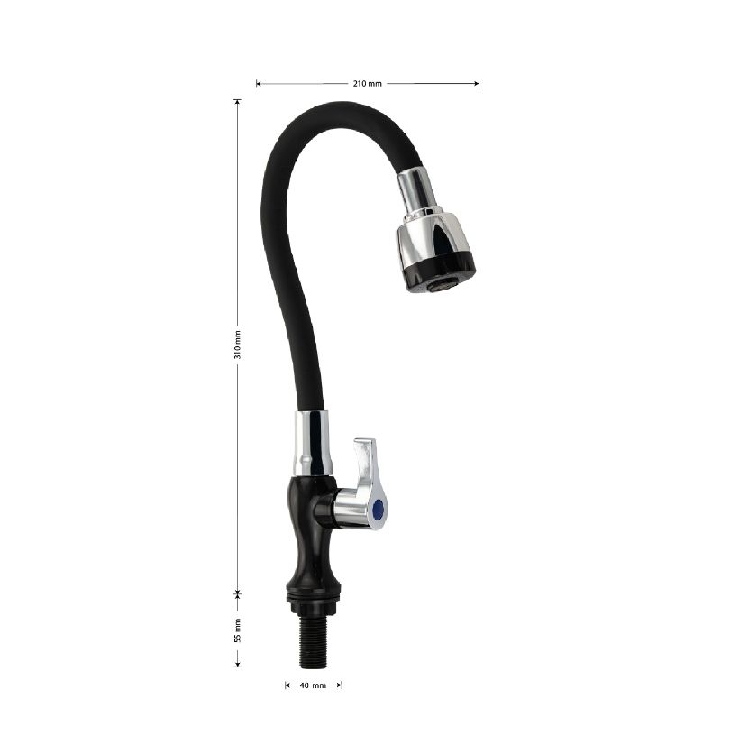 Кран на одну воду из высокопрочного пластика АБС, черного цвета, с гибким изливом, с двухрежимным большим аэратором. Крепление резьба - гайка. Кранбукса м/к, ручка флажок, поворот на 90˚. Габаритные размеры: высота 310 мм, регулировка расположения излива 210 мм, диаметр посадочного седла 40 мм, длина резьбы 55 мм. Вес - 0.11 кг, объём - 0.0030 м3. В комплекте корпус, крепёж