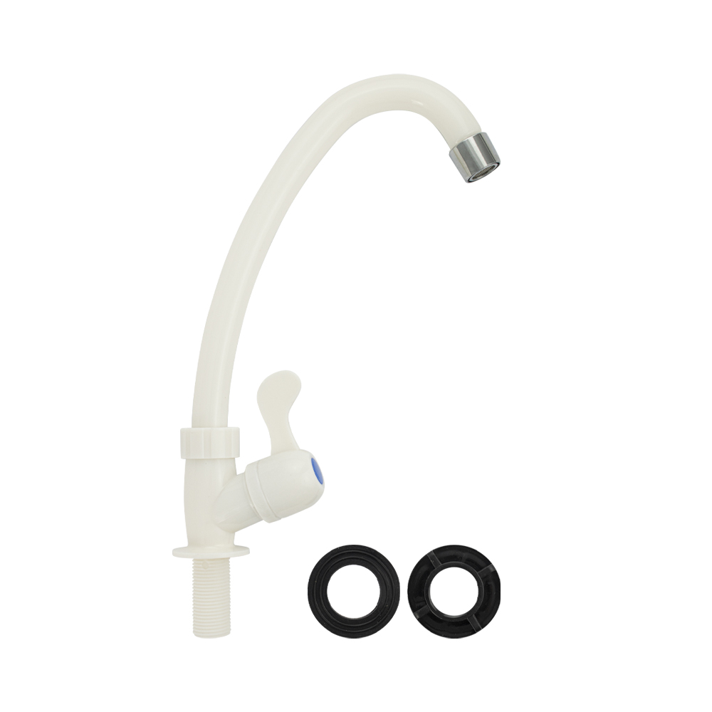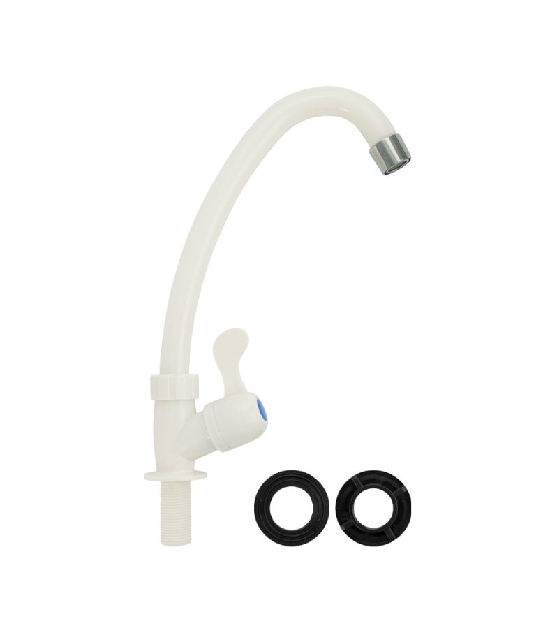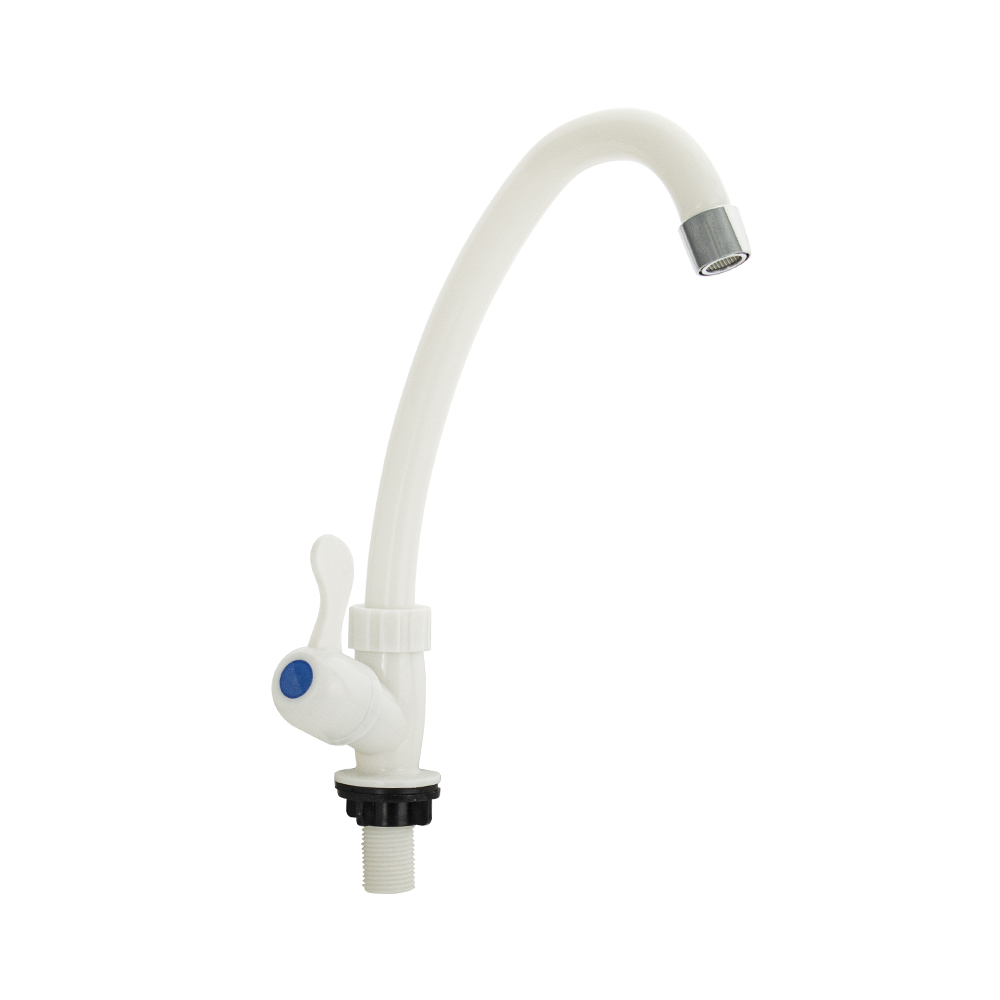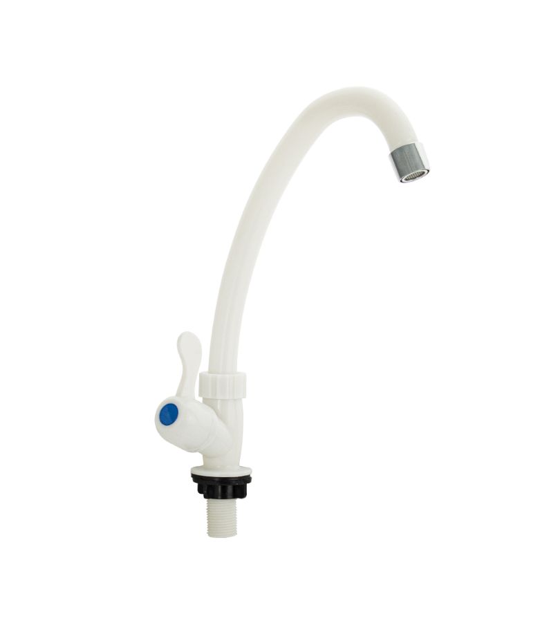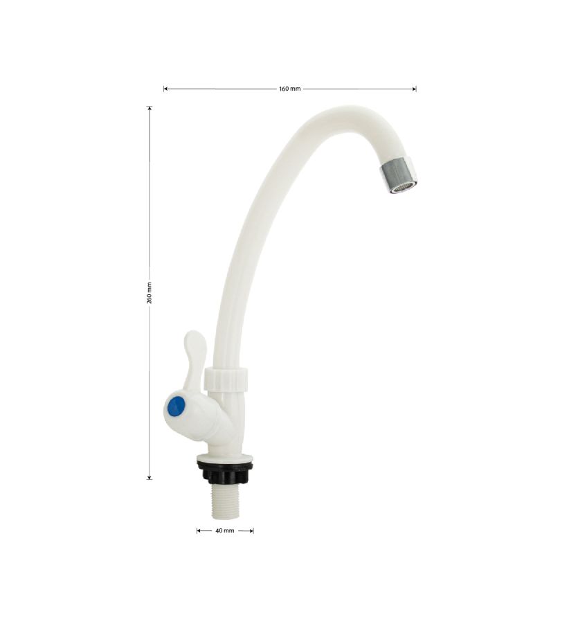 Кран на одну воду из высокопрочного пластика АБС - белый с аэратором для экономии воды. Крепление резьба - гайка. Кранбукса м/к, ручка - флажок, поворот на 90˚. Габаритные размеры: высота 260 мм, длина 160 мм, диаметр посадочного седла 40 мм, длина резьбы 40 мм. Вес - 0.17 кг, объём - 0.00153 м3. В комплекте корпус, прокладка.