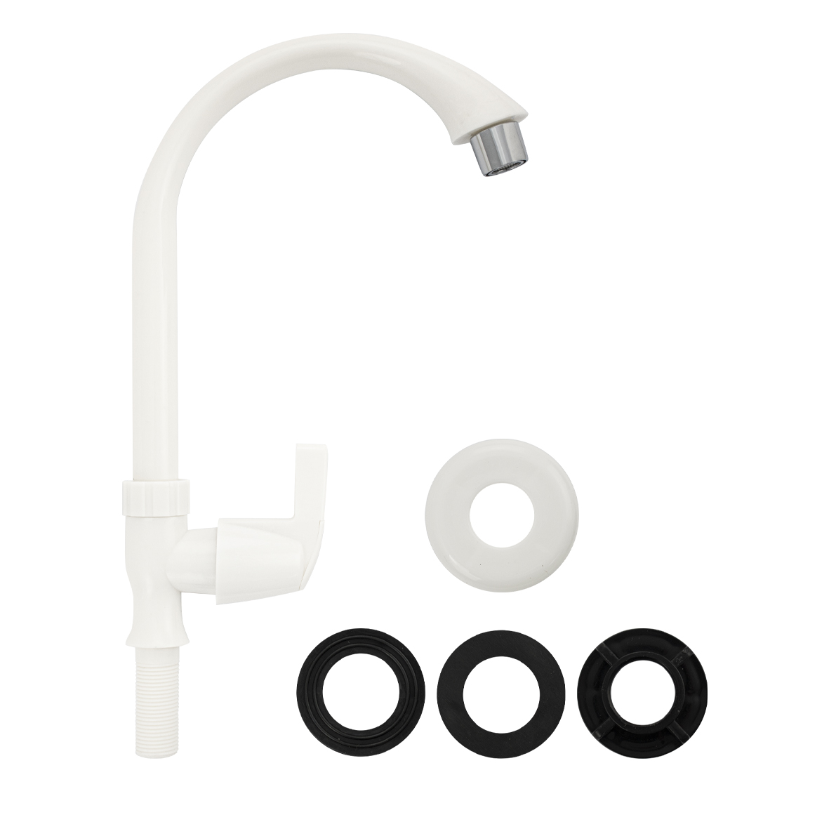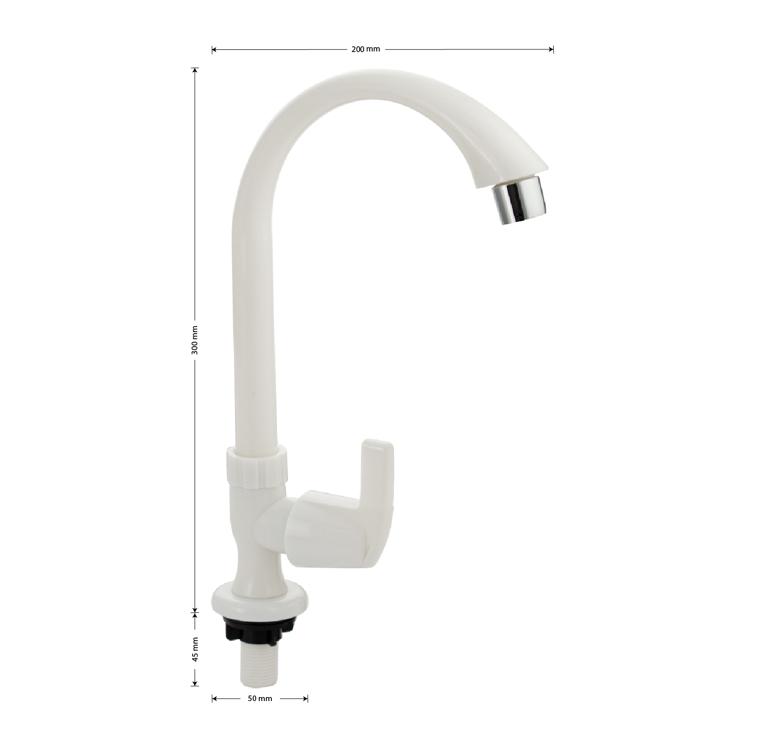 Кран на одну воду на раковину из высокопрочного пластика АБС - белый с аэратором для экономии воды. Крепление резьба - гайка. Кранбукса м/к, ручка - флажок, поворот на 90˚. Габаритные размеры: высота 300 мм, длина 200 мм, диаметр посадочного седла 50 мм, длина резьбы 45 мм. Вес - 0.21 кг , объём - 0.0017 м3. В комплекте корпус, прокладка