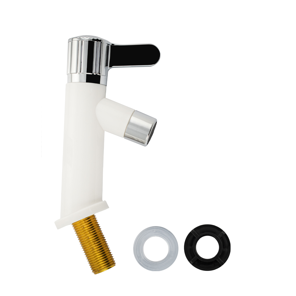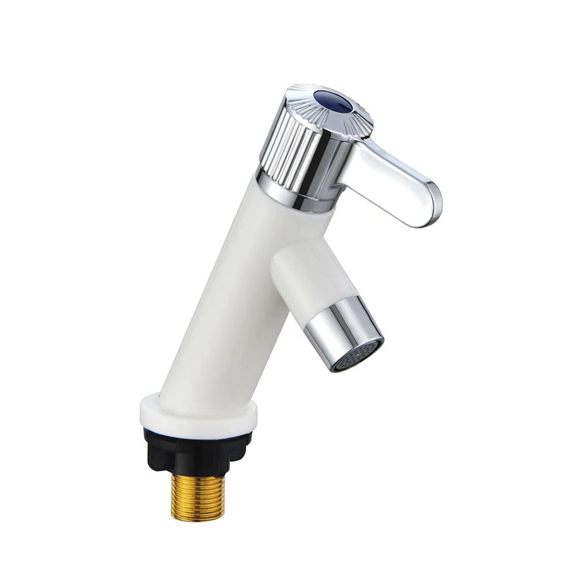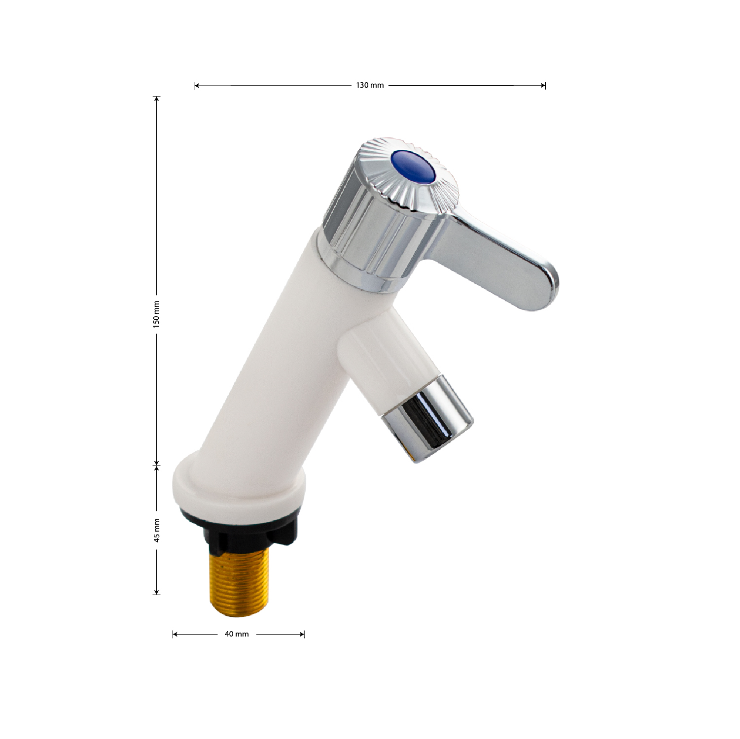 Кран на одну воду на раковину из высокопрочного пластика АБС - белый с аэратором для экономии воды. Крепление резьба - гайка. Кранбукса м/к, круглая ручка, поворот на 90˚. Габаритные размеры: высота 150 мм, длина 130 мм, диаметр посадочного седла 40 мм, длина резьбы 45 мм. Вес - 0,16 кг, объём - 0,00055 м3. В комплекте корпус, прокладка