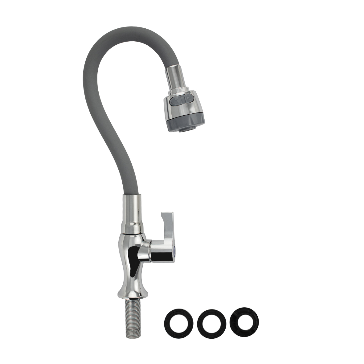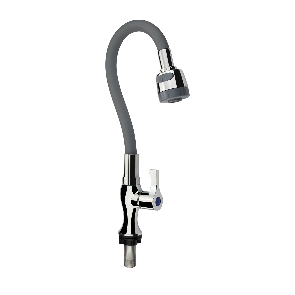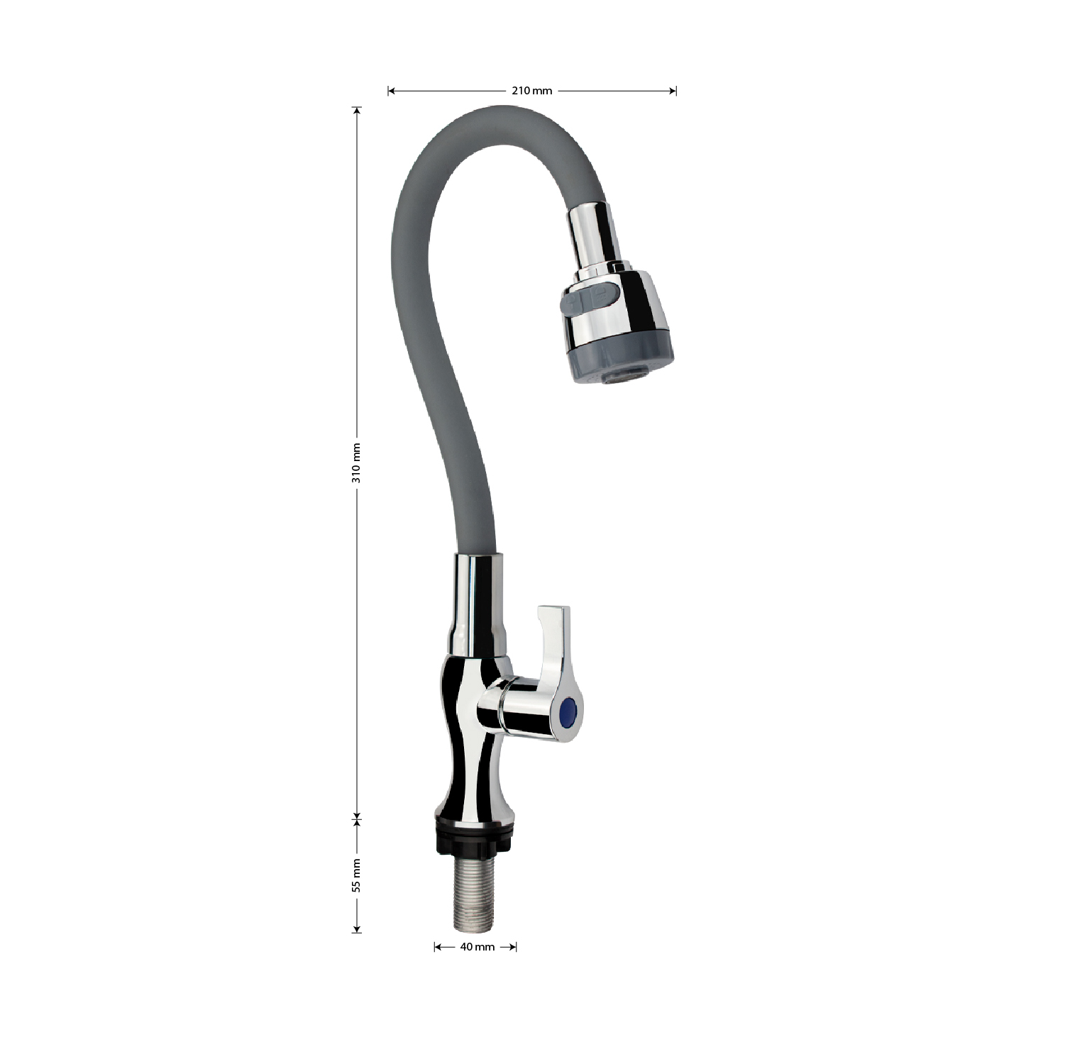 Кран на одну воду из высокопрочного пластика АБС, хромированный корпус, с гибким серым изливом, с двухрежимным большим аэратором. Крепление резьба - гайка. Кранбукса м/к, ручка флажок, поворот на 90˚. Габаритные размеры: высота 310 мм, регулировка расположения излива 210 мм, диаметр посадочного седла 40 мм, длина резьбы 55 мм. Вес - 0,58 кг, объём - 0,00297 м3. В комплекте корпус, крепёж