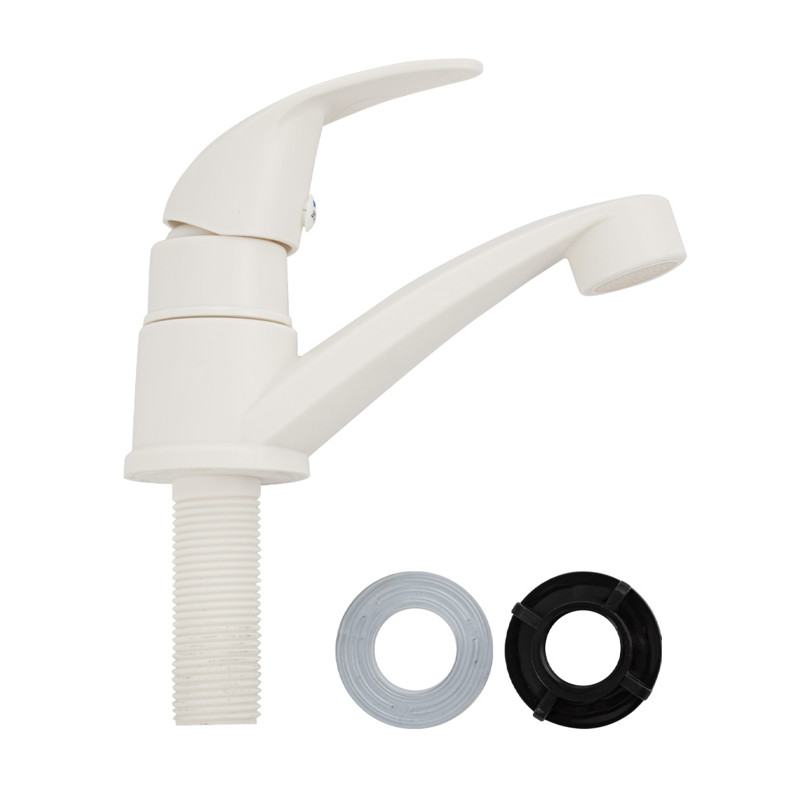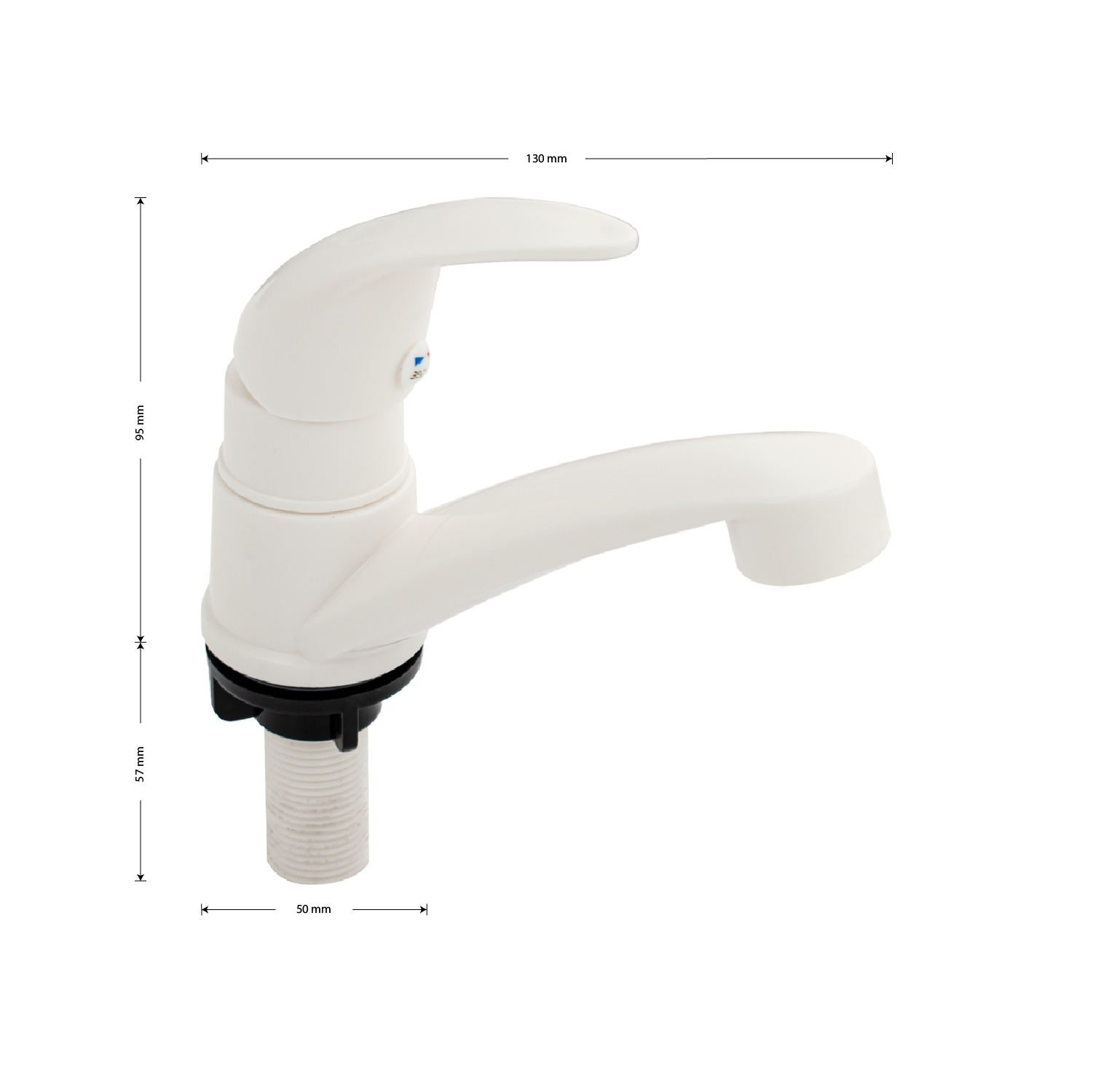 Кран на одну воду, из высокопрочного пластика АБС, белый, с аэратором для экономии воды, шаровый, с плоским коротким изливом. Крепление резьба - гайка. Габаритные размеры: высота 95 мм, длина 130 мм, диаметр посадочного седла 50 мм, длина резьбы 57 мм. Вес - 0,100 кг, объём - 0,00133 м3. В комплекте корпус, крепёж, паспорт.