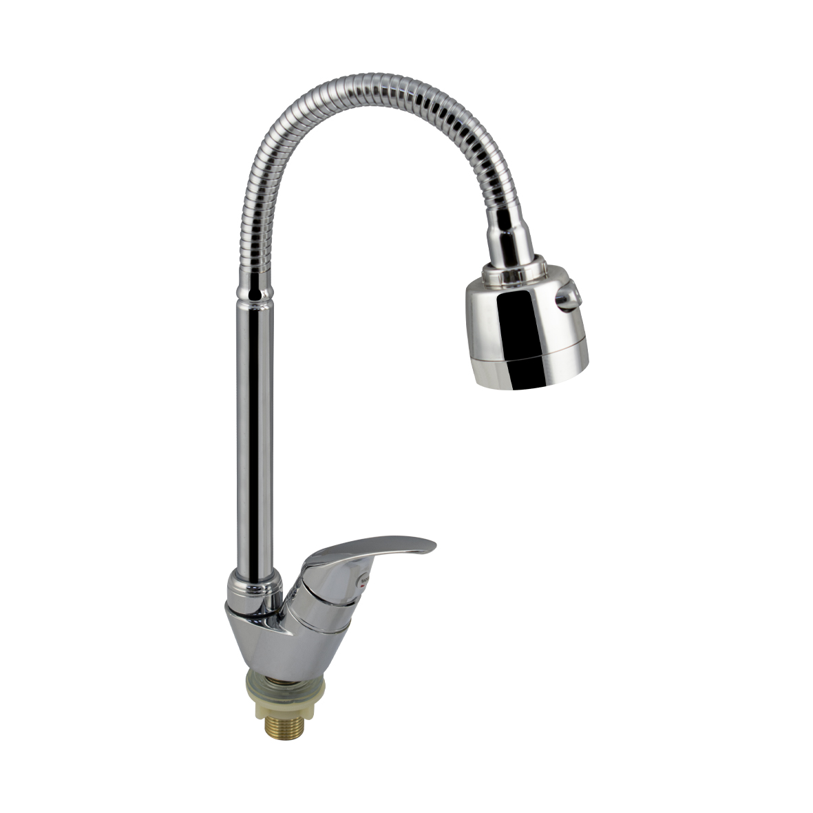 Кран на одну воду, хромированный, с гибким изливом и духрежимным аэратором для экономии воды, шаровый. Материал изготовления - латунь. Крепление резьба - гайка. Габаритные размеры: высота 270-320 мм, длина 160-250 мм, диаметр посадочного седла 63 мм, длина резьбы 40 мм. Вес - 072 кг, объём - 0,00175 м3. В комплекте корпус, крепёж.
