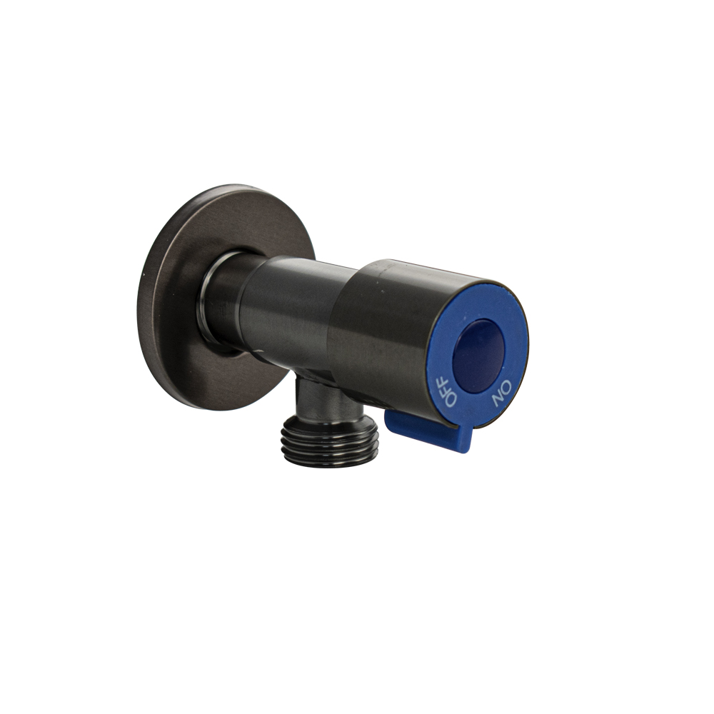 Кран металлокерамика угловой 1/2"х1/2" с чашкой, цвет графит наружняя резьба, корпус из нержавеющей стали марки SUS 304, ручка с синей вставкой поворот на 90˚, предназначен для подключения к водопроводной сети санитарных приборов (смывных бачков, стиральных и посудомоечных машин, лейки биде и пр.) с помощью гибких соединителей с накидной гайкой. Позволяет перекрывать подачу воды к конкретному потребителю. Габаритные размеры: длина 85 мм, диаметр посадочного седла 48 мм, длина резьбы 20 мм. Вес - 0,15 кг, объём - 0,0002 м3. В комплекте кран, чашка