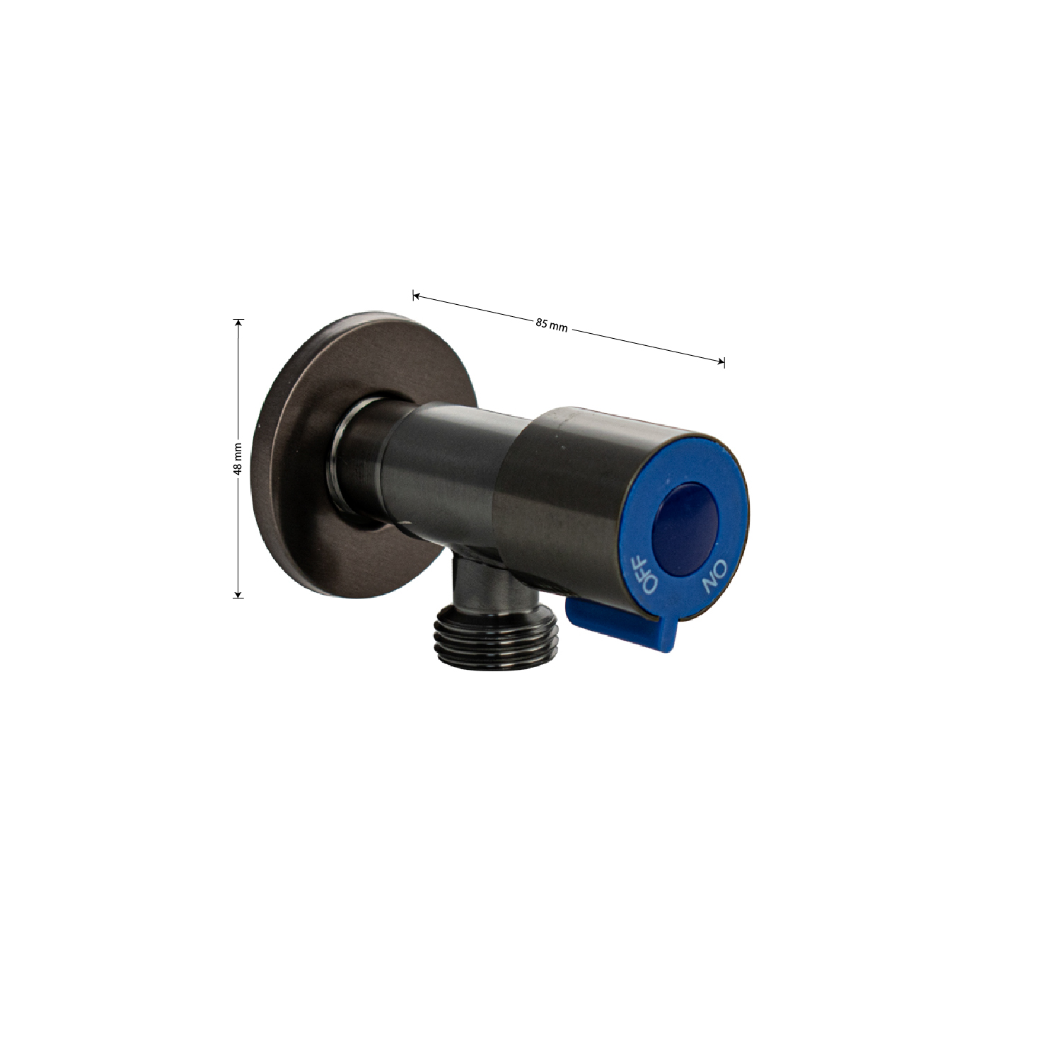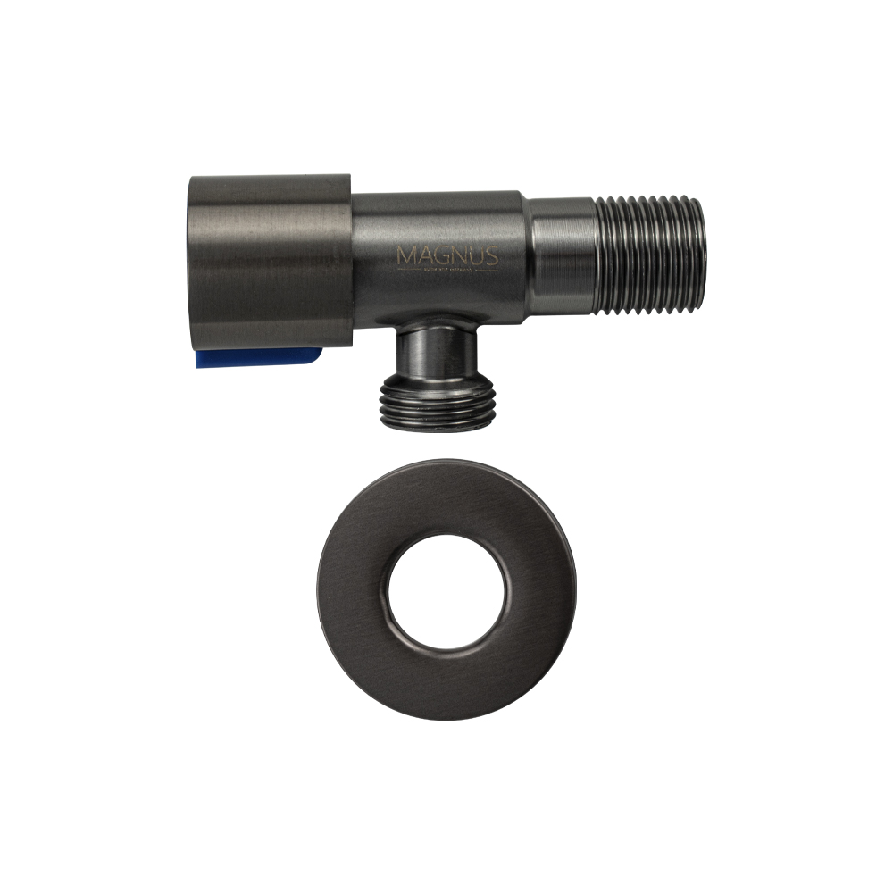 Кран металлокерамика угловой 1/2"х1/2" с чашкой, цвет графит наружняя резьба, корпус из нержавеющей стали марки SUS 304, ручка с синей вставкой поворот на 90˚, предназначен для подключения к водопроводной сети санитарных приборов (смывных бачков, стиральных и посудомоечных машин, лейки биде и пр.) с помощью гибких соединителей с накидной гайкой. Позволяет перекрывать подачу воды к конкретному потребителю. Габаритные размеры: длина 85 мм, диаметр посадочного седла 48 мм, длина резьбы 20 мм. Вес - 0,15 кг, объём - 0,0002 м3. В комплекте кран, чашка