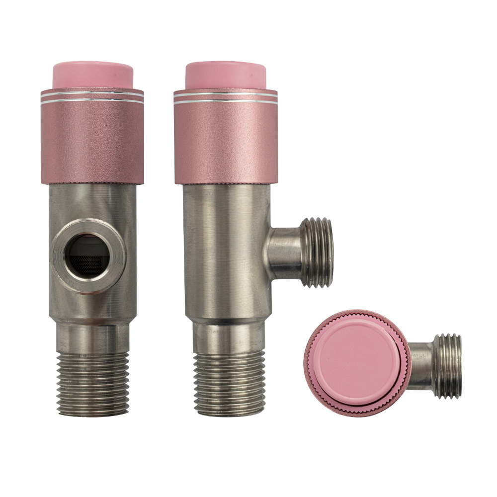 Кран угловой с фильтром, 1/2"х1/2", матовый, с кнопочным включением розовая ручка, с отражателем, из нержавеющей стали марки 304