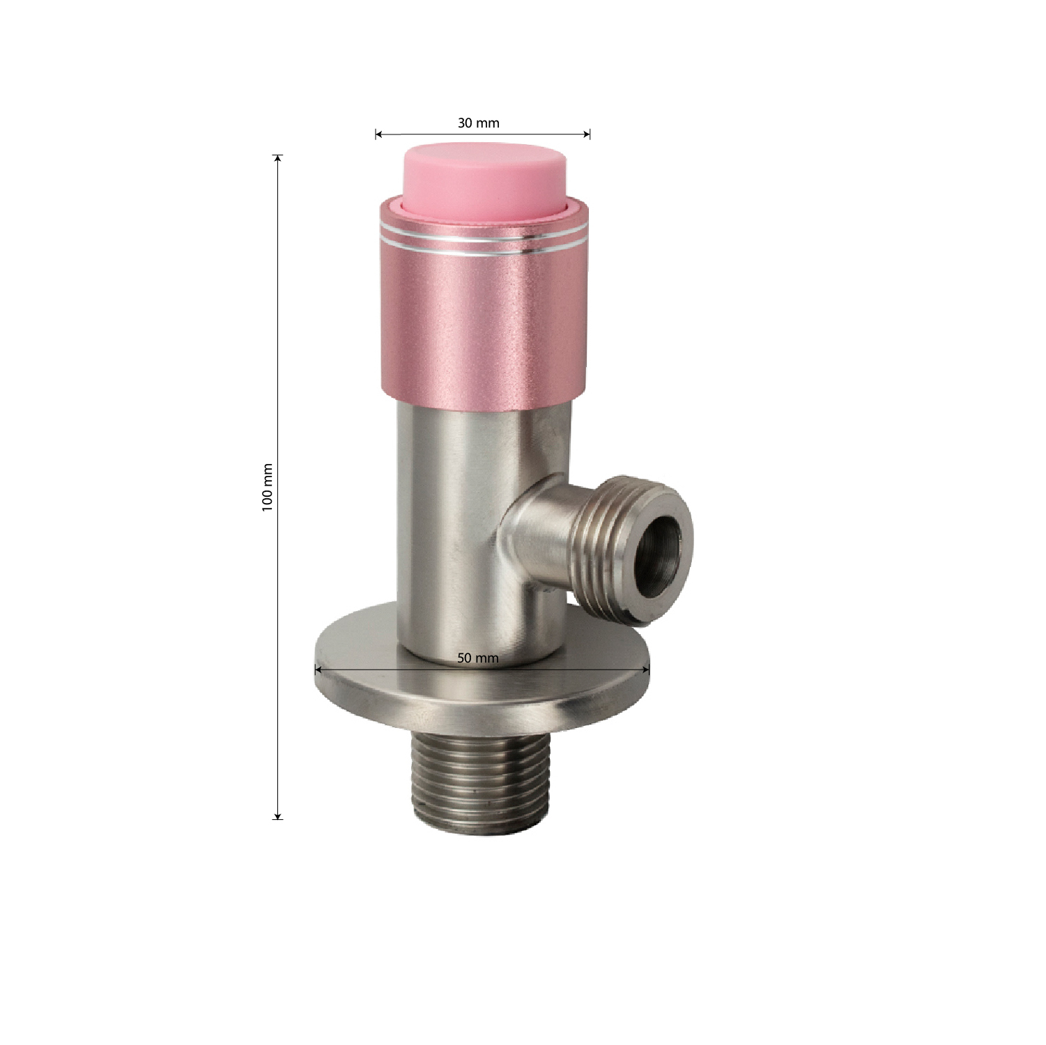 Кран металлокерамика угловой 1/2"х1/2" с чашкой, наружняя резьба, матовый корпус из нержавеющей стали марки 304, круглая розовая ручка с кнопкой, предназначен для подключения к водопроводной сети санитарных приборов (смывных бачков, стиральных и посудомоечных машин, лейки биде и пр.) с помощью гибких соединителей с накидной гайкой. В корпусе фильтр - сетка, легко чистится. Позволяет перекрывать подачу воды к конкретному потребителю. Габаритные размеры: высота 100 мм, ширина 30 мм, диаметр посадочного седла 50 мм, длина резьбы 30 мм. Вес - 0,200 кг, объём - 0,00030 м3. В комплекте кран, чашка.