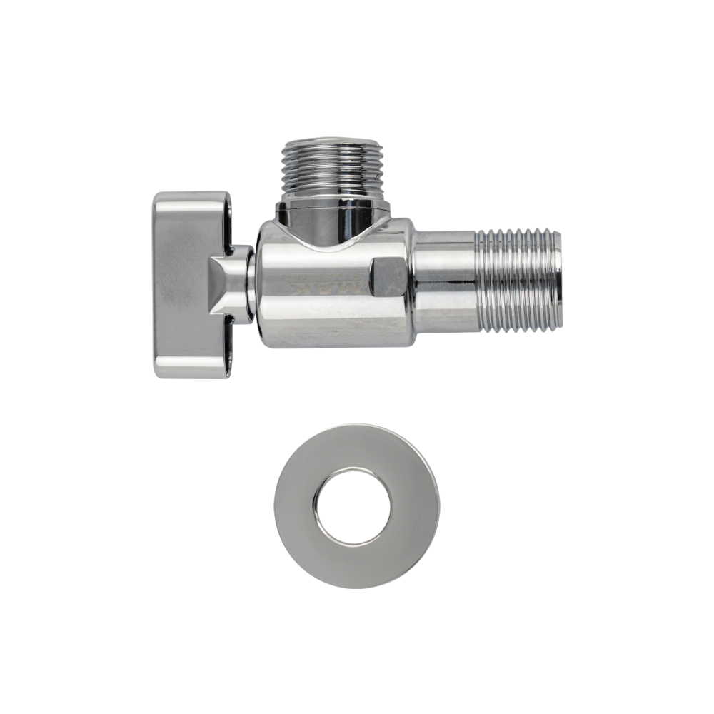 Кран шаровый, угловой, 1/2"х1/2" ручка флажок, наружняя резьба, латунный корпус, ручка поворот на 90˚, предназначен для подключения к водопроводной сети санитарных приборов (смывных бачков, стиральных и посудомоечных машин, лейки биде и пр.) с помощью гибких соединителей с накидной гайкой. Позволяет перекрывать подачу воды к конкретному потребителю. Габаритные размеры: ширина 63 мм, диаметр посадочного седла 50 мм. Вес - 0.2 кг, объём - 0,00027 м3. В комплекте кран, декоративная чашка.